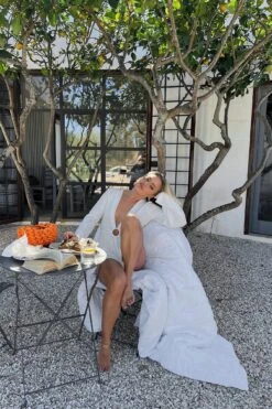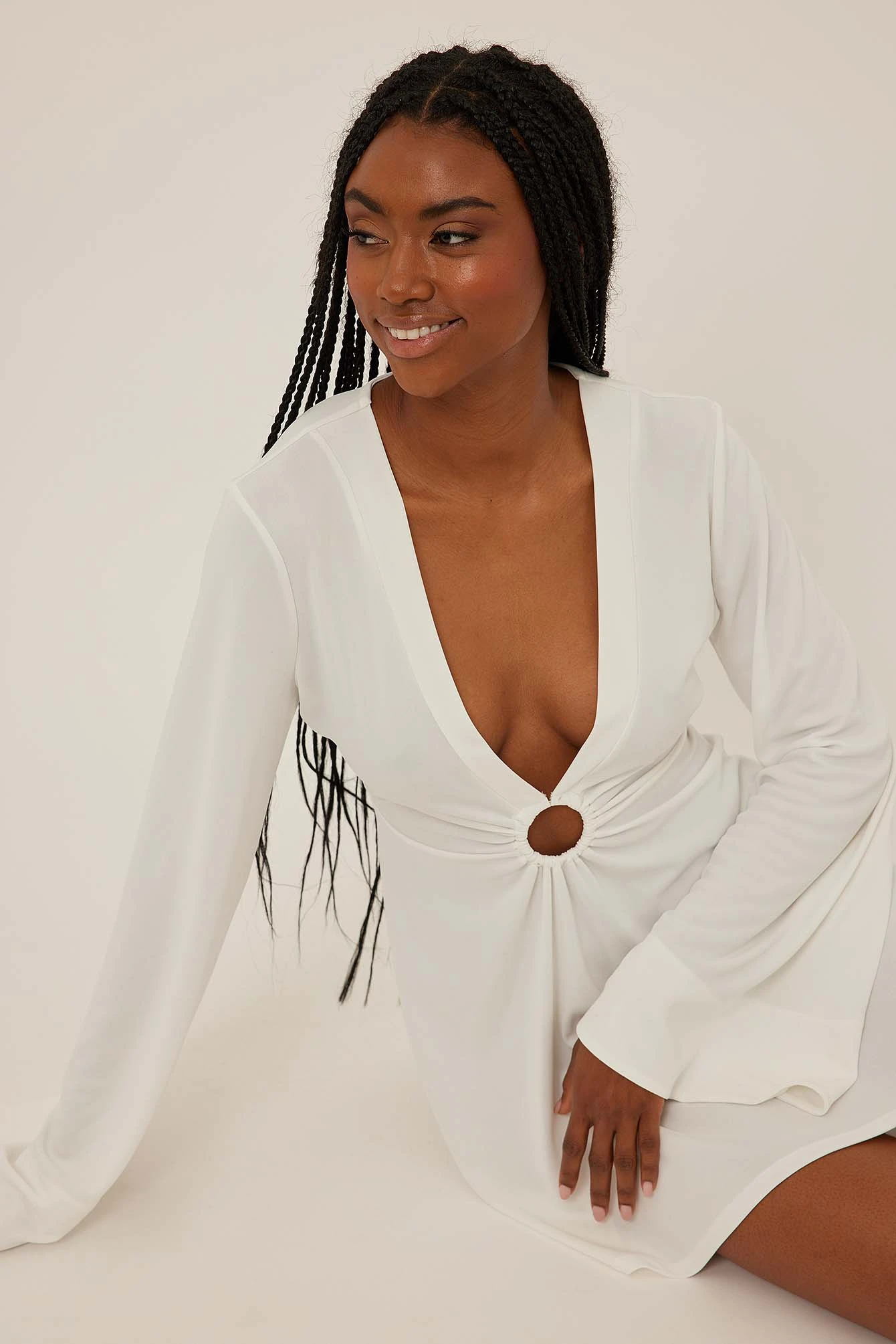 Cette robe courte a un col en V profond, des longues manches pagode, un détail en anneau à la taille, une coupe fluide et une matière élastique en jersey.