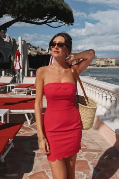 Cette robe courte a un design à bandeau. Elle a un design festonné aux ourlets et une fermeture éclair à l’arrière. Cette robe courte a une coupe moulante et une doublure.