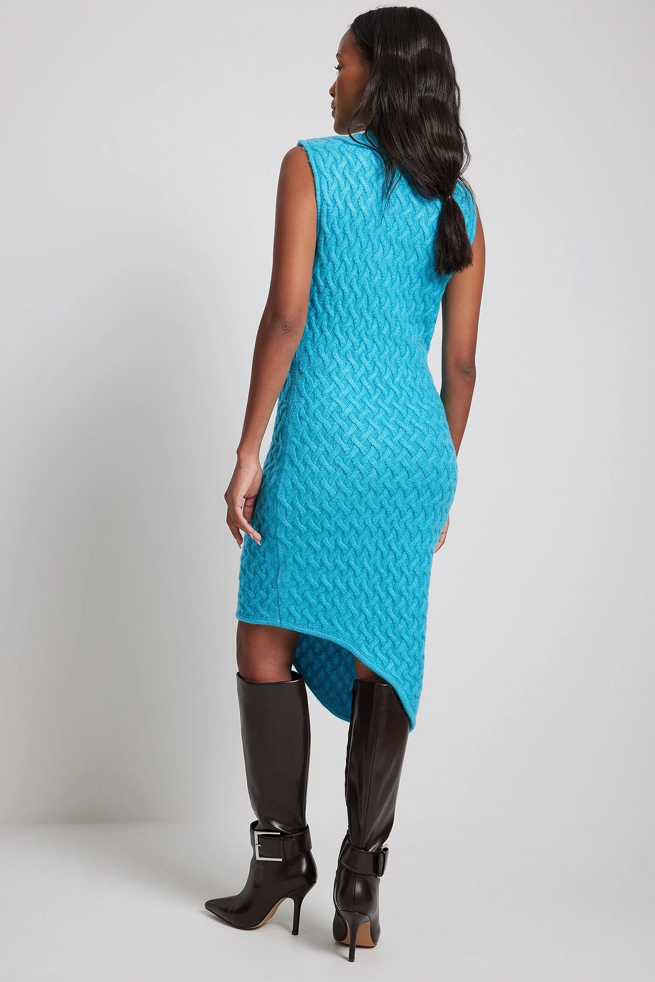 Cette robe courte est sans manches, asymétrique et câblée et a une encolure bateau.