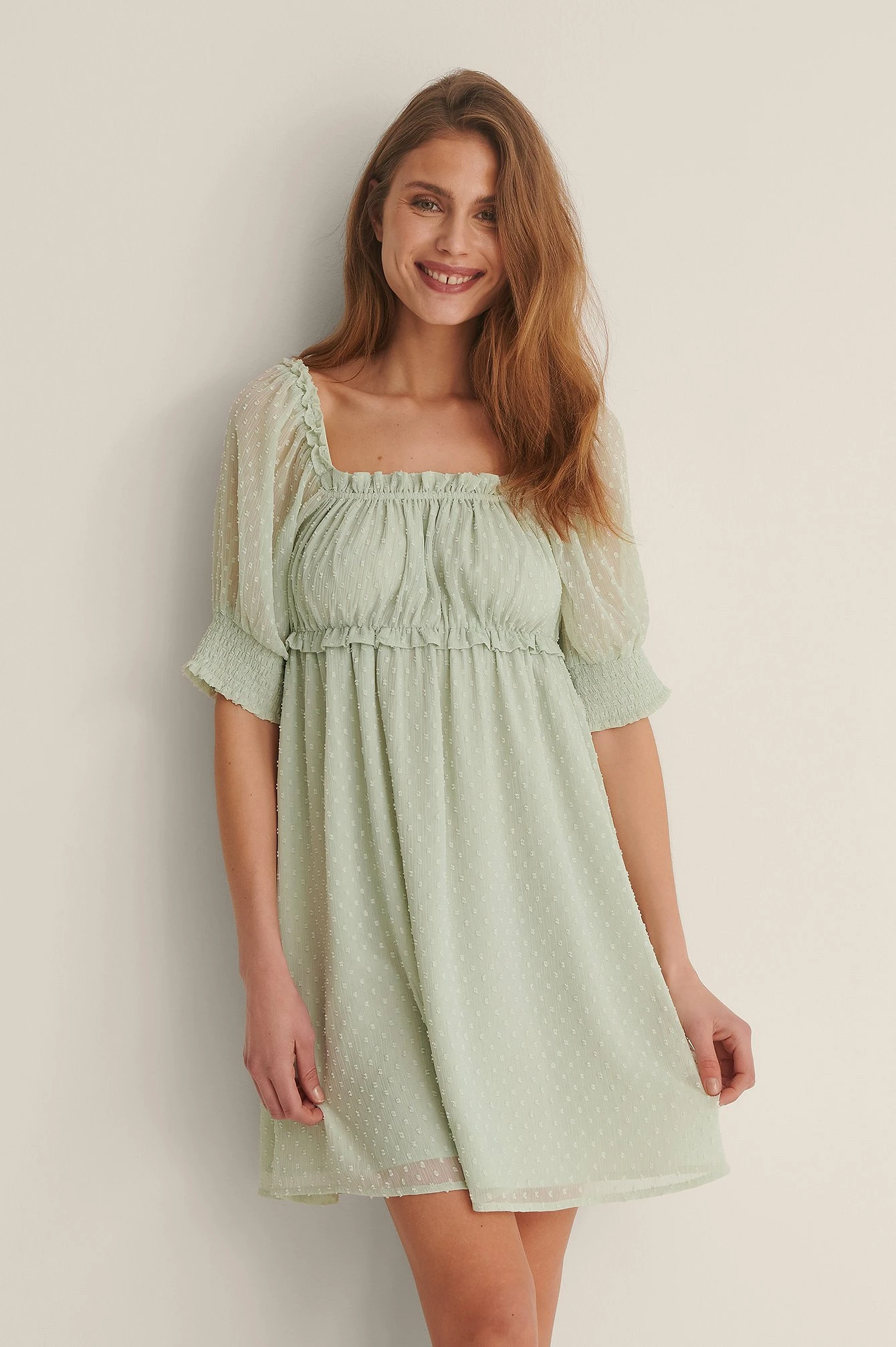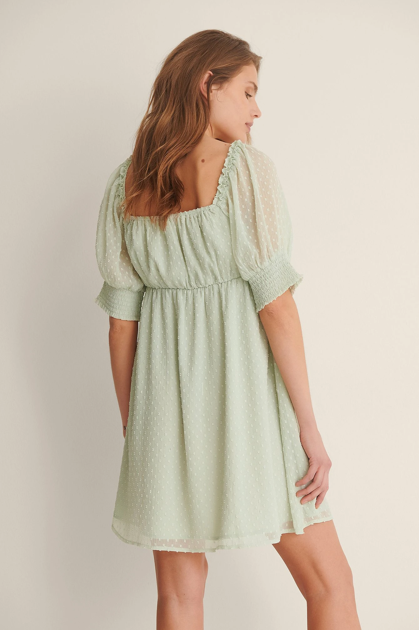 Cette robe courte a des manches courtes avec bande froncée, une ceinture élastique, des détails ruchés, une coupe fluide et une doublure intérieure.