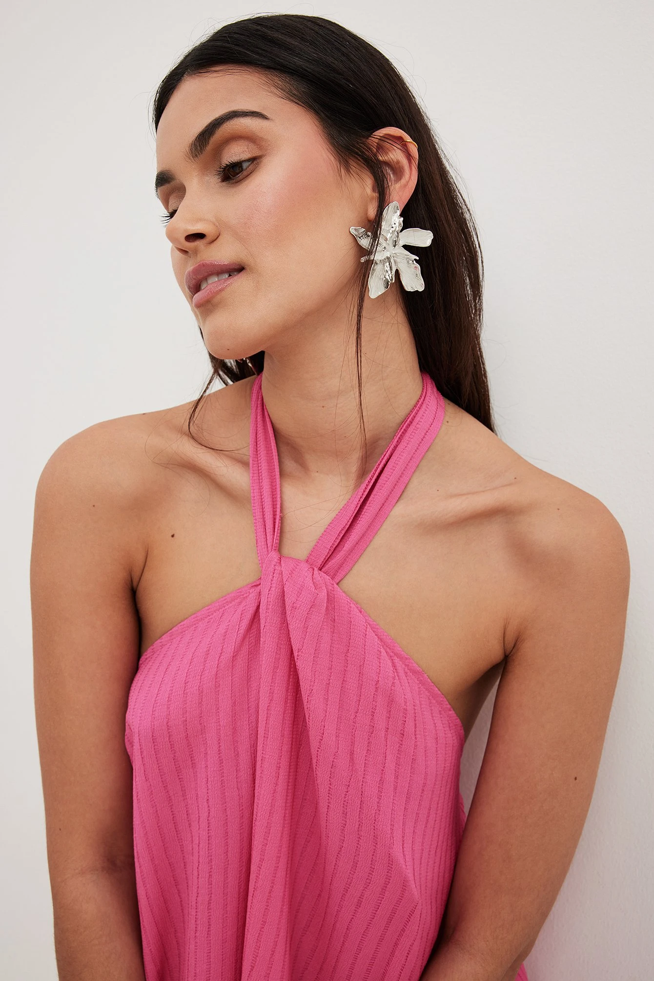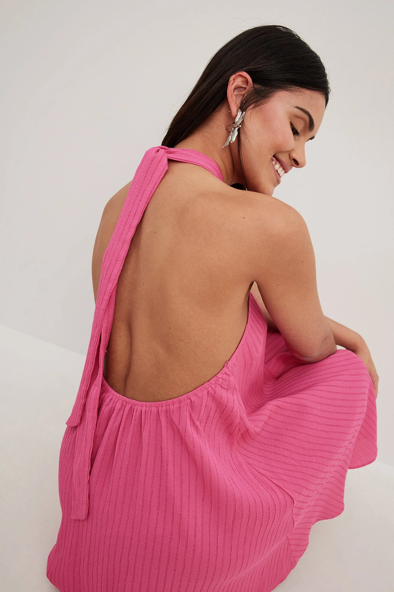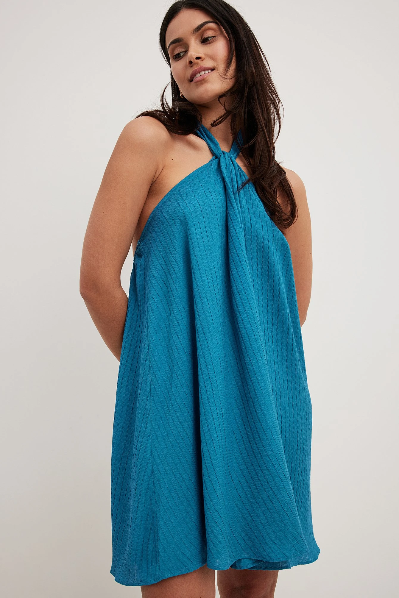 Cette robe courte a un modèle de bretelle à nouer dans le cou. Elle a un détail auto-sérré derrière la nuque et un élastique à l’arrière. Cette robe courte a une coupe fluide.
