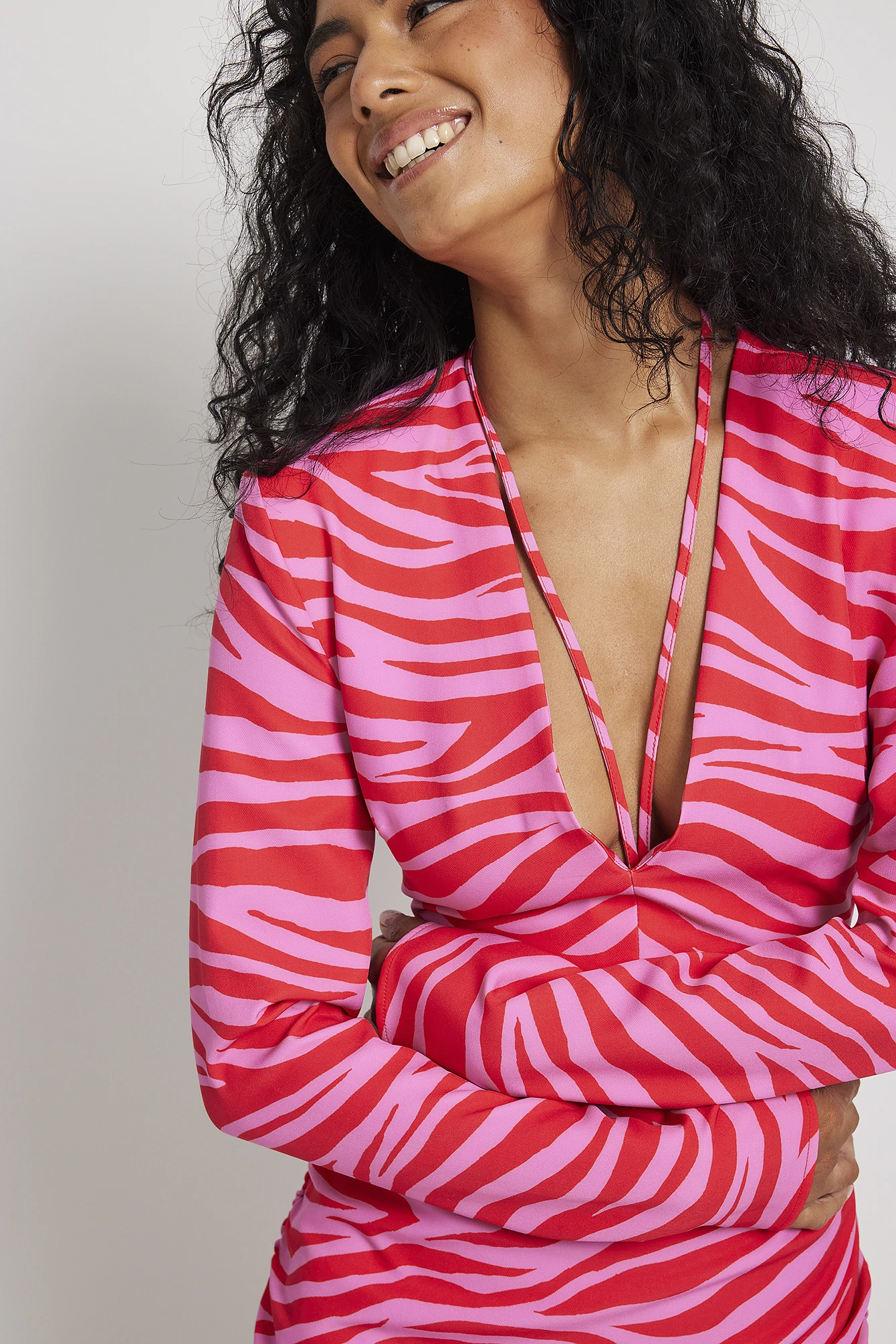 This mini dress is v-neck and features long sleeves with padded shoulders, a draped detail on the sides, a strap at the neck and a side zipper closure. This product runs small in size, we recommend you to choose 1-2 size bigger than your usual size.