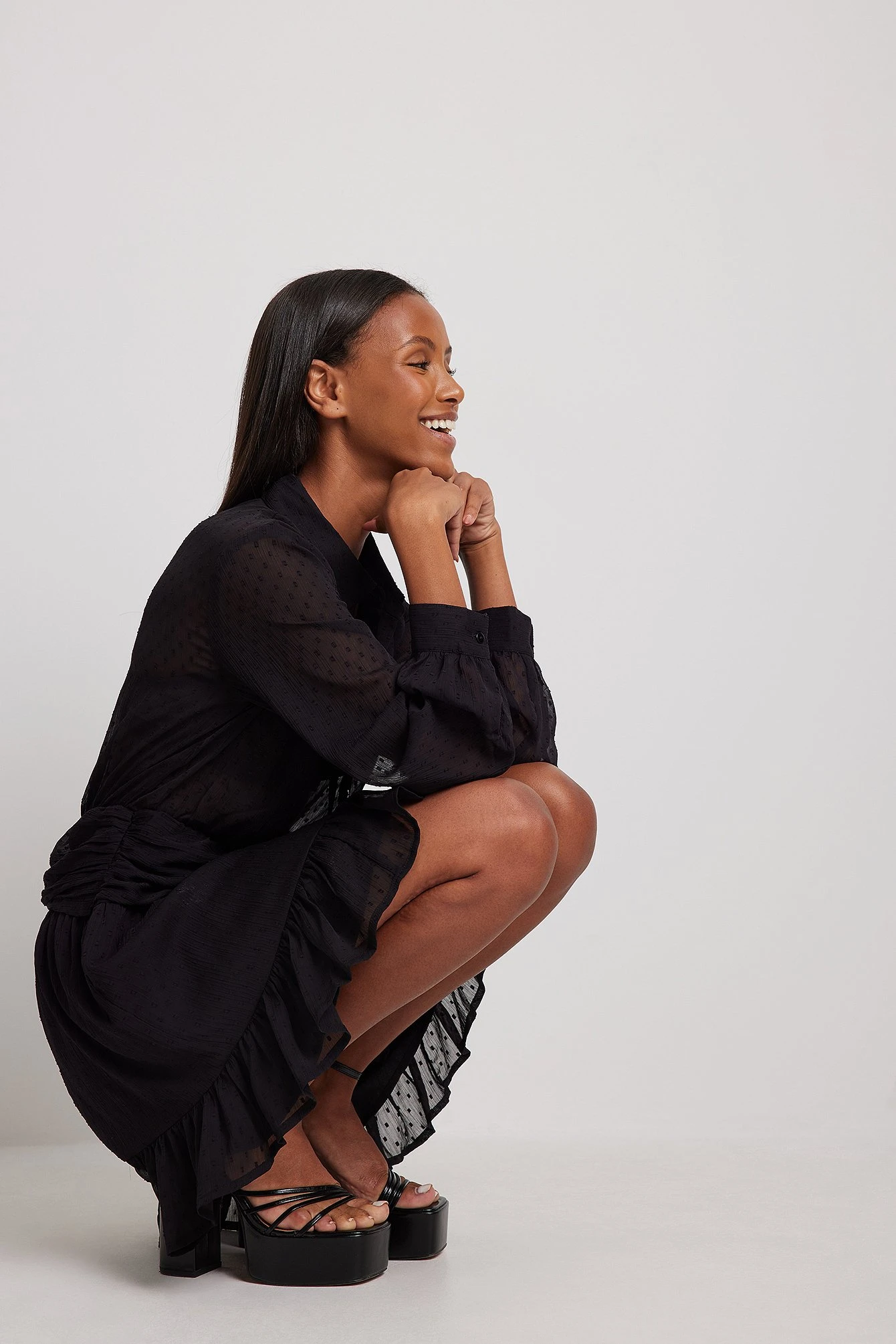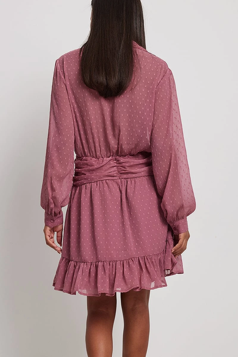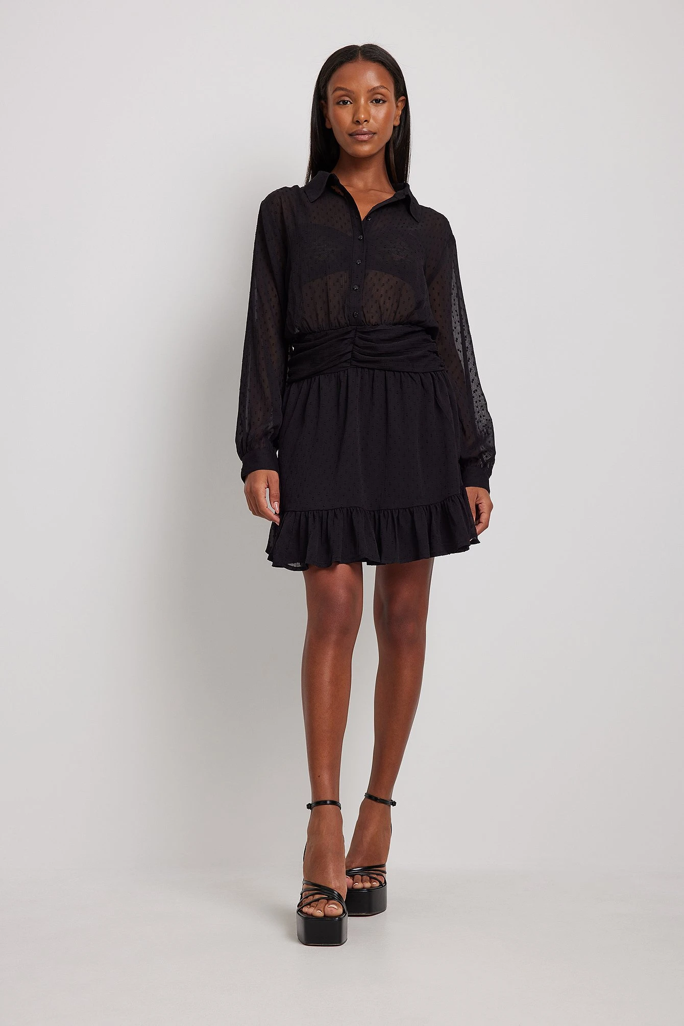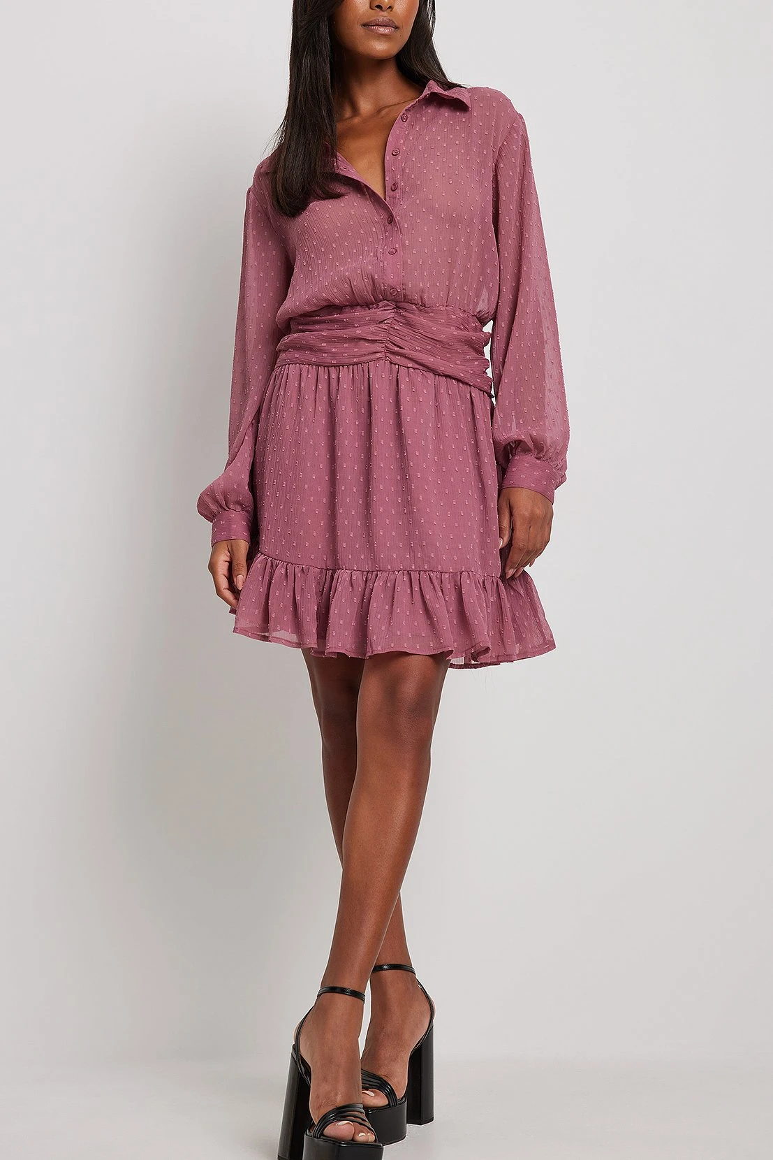Cette robe courte est faite en dobby et a une col de chemise, un bouton sur la moitié haute, des manches longues avec boutons de manchette, une ceinture avec détail drapé et une bordure froissée au bas.