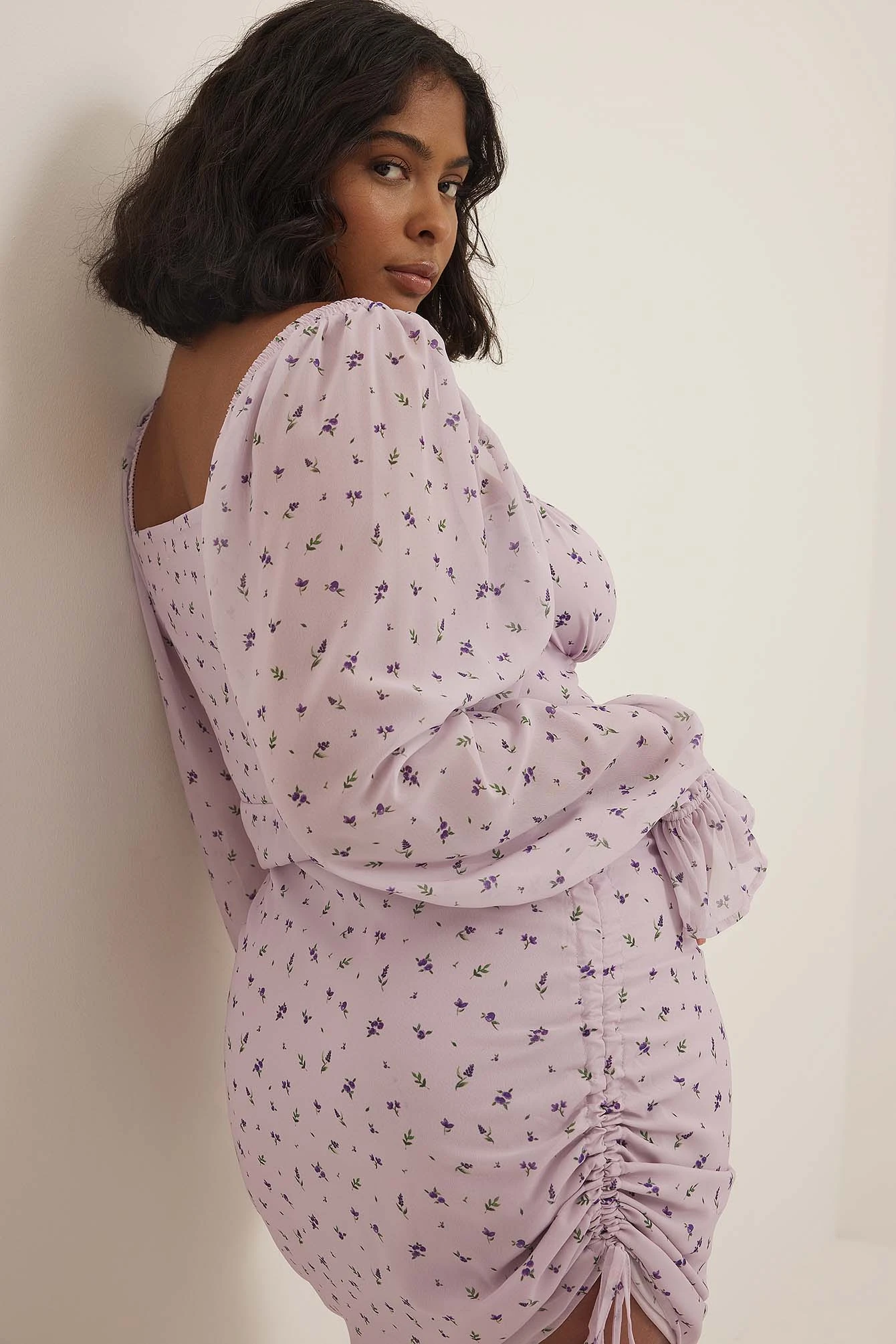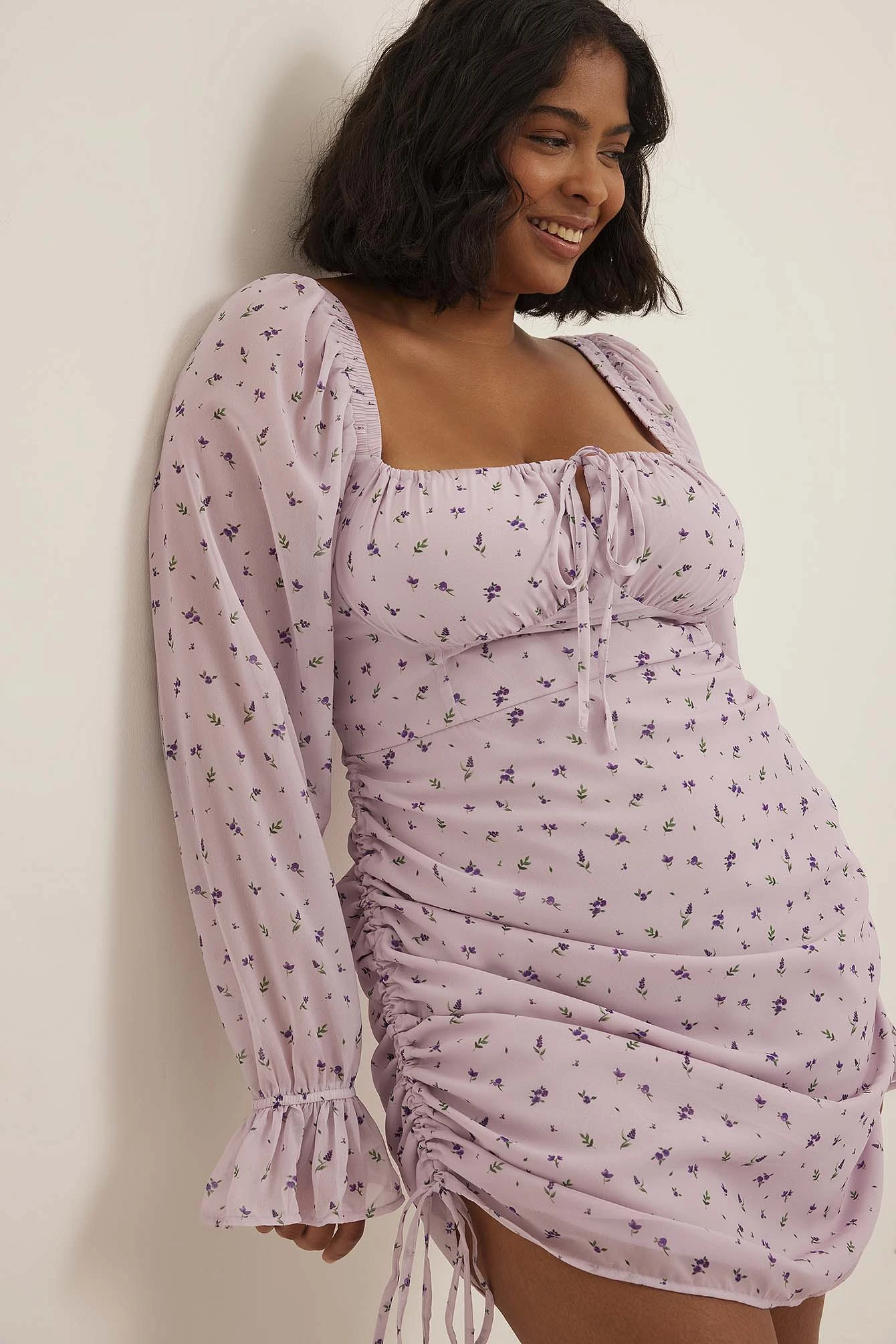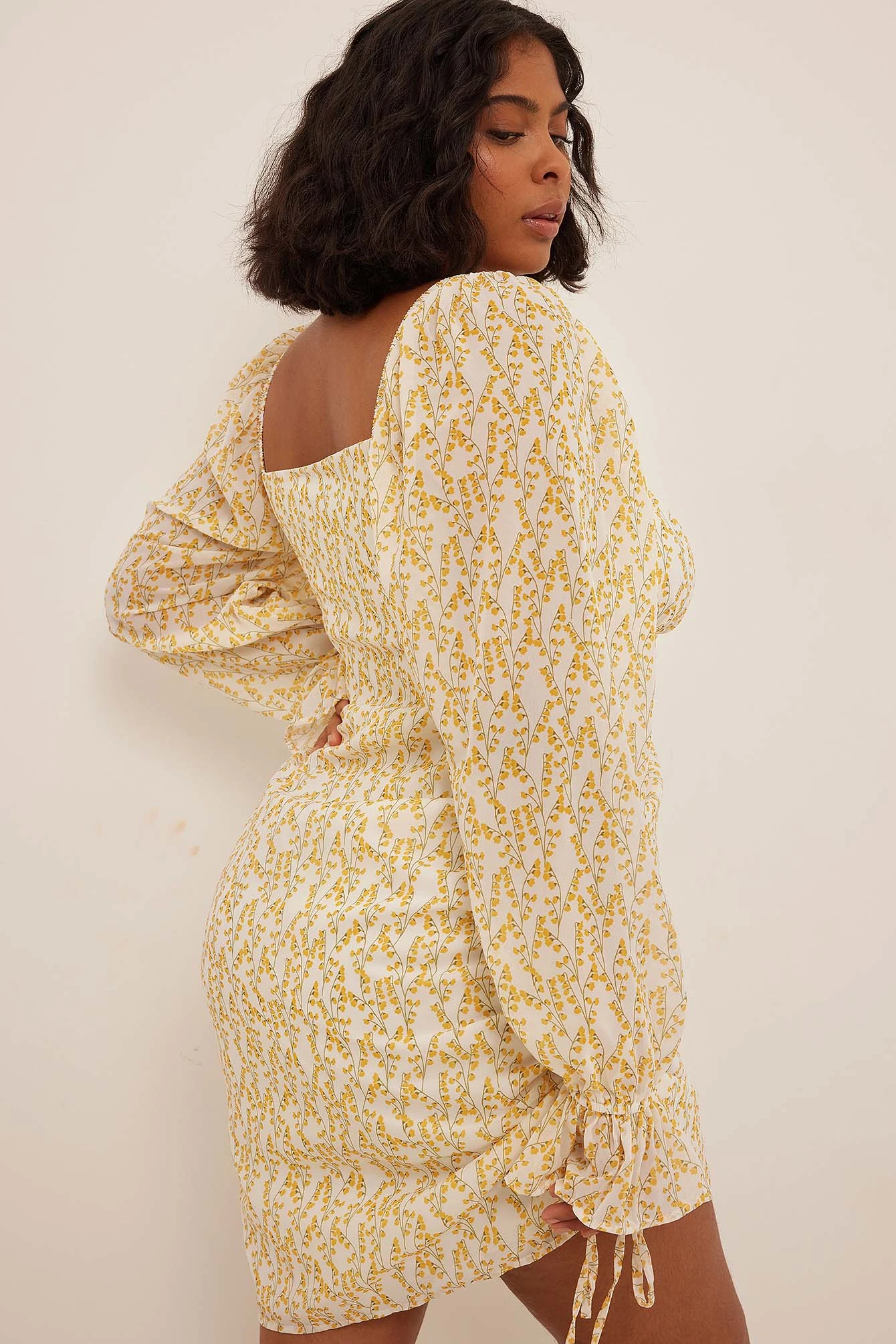 Cette robe a un col carré avec noeud de bretelles réglable, des froncements détaillés sur la poitrine, des cordons réglables sur les côtés, une manchette élastique, des manches longues transparentes et bouffantes et une taille courte avec doublure intérieure complète.