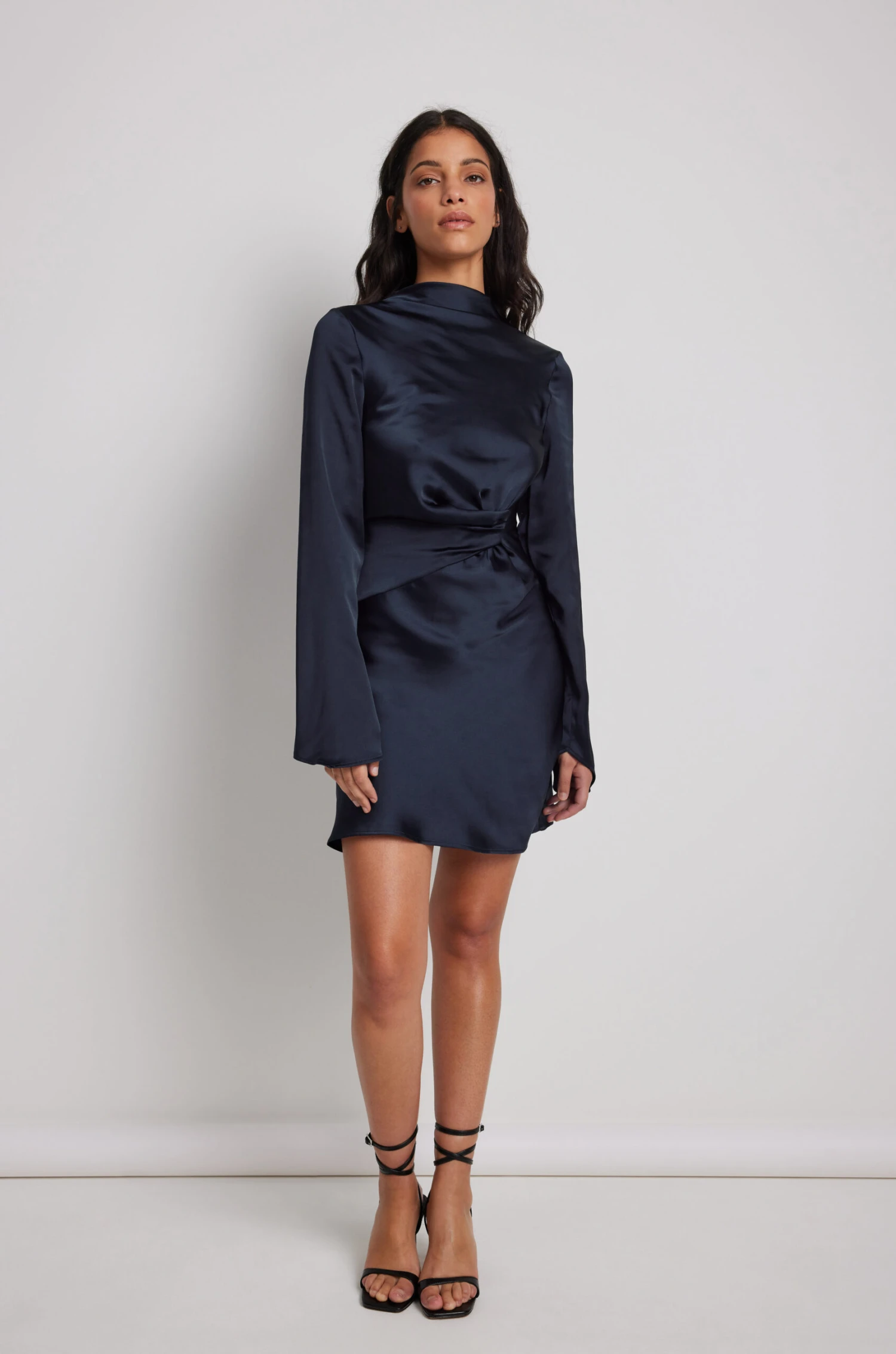 Cette robe courte a un col haut avec boutons de fermeture à l’arrière de la nuque. Elle a un détail de torsion à l’avant et une fermeture éclair latérale cachée.