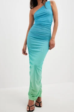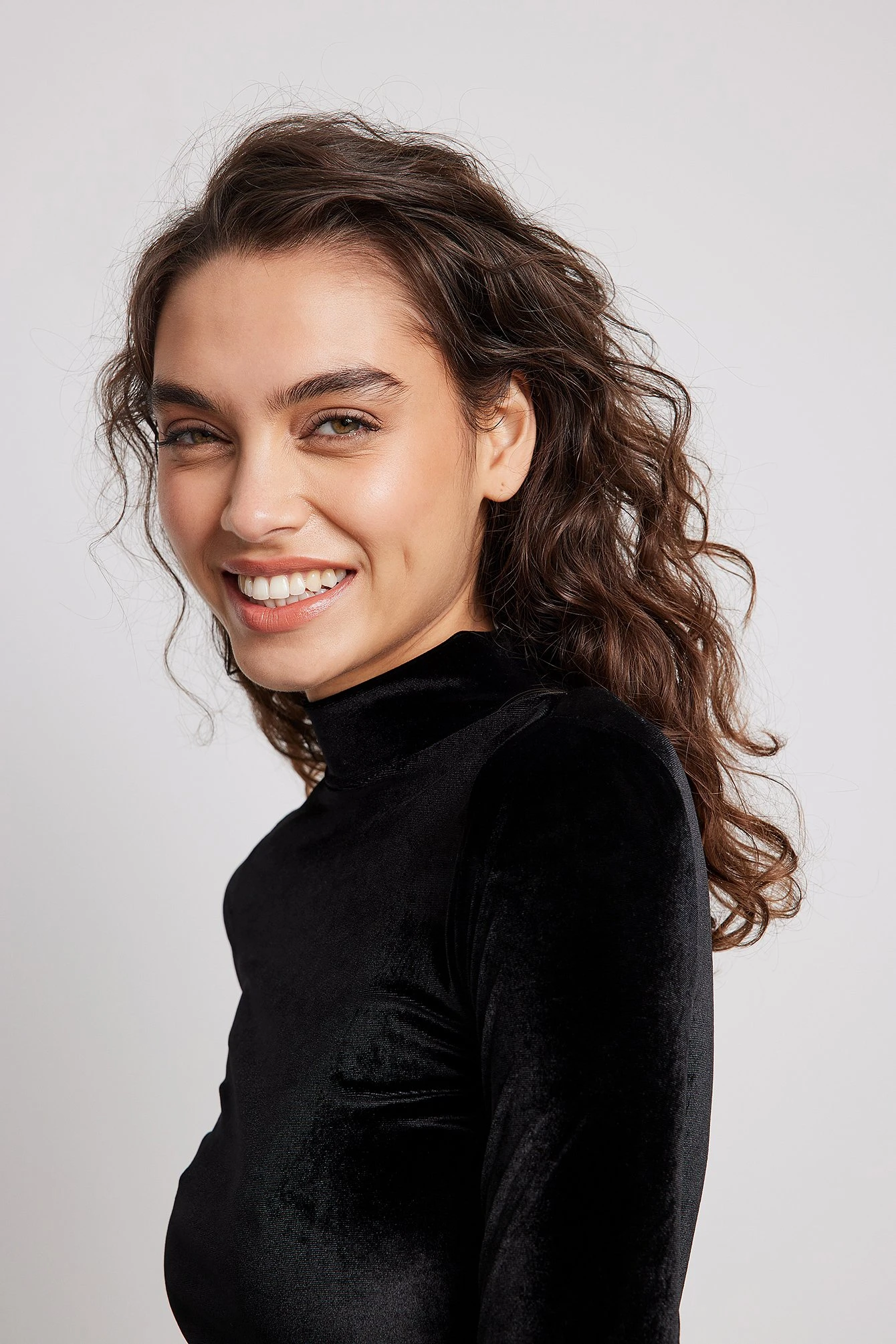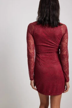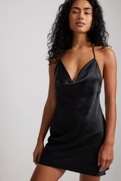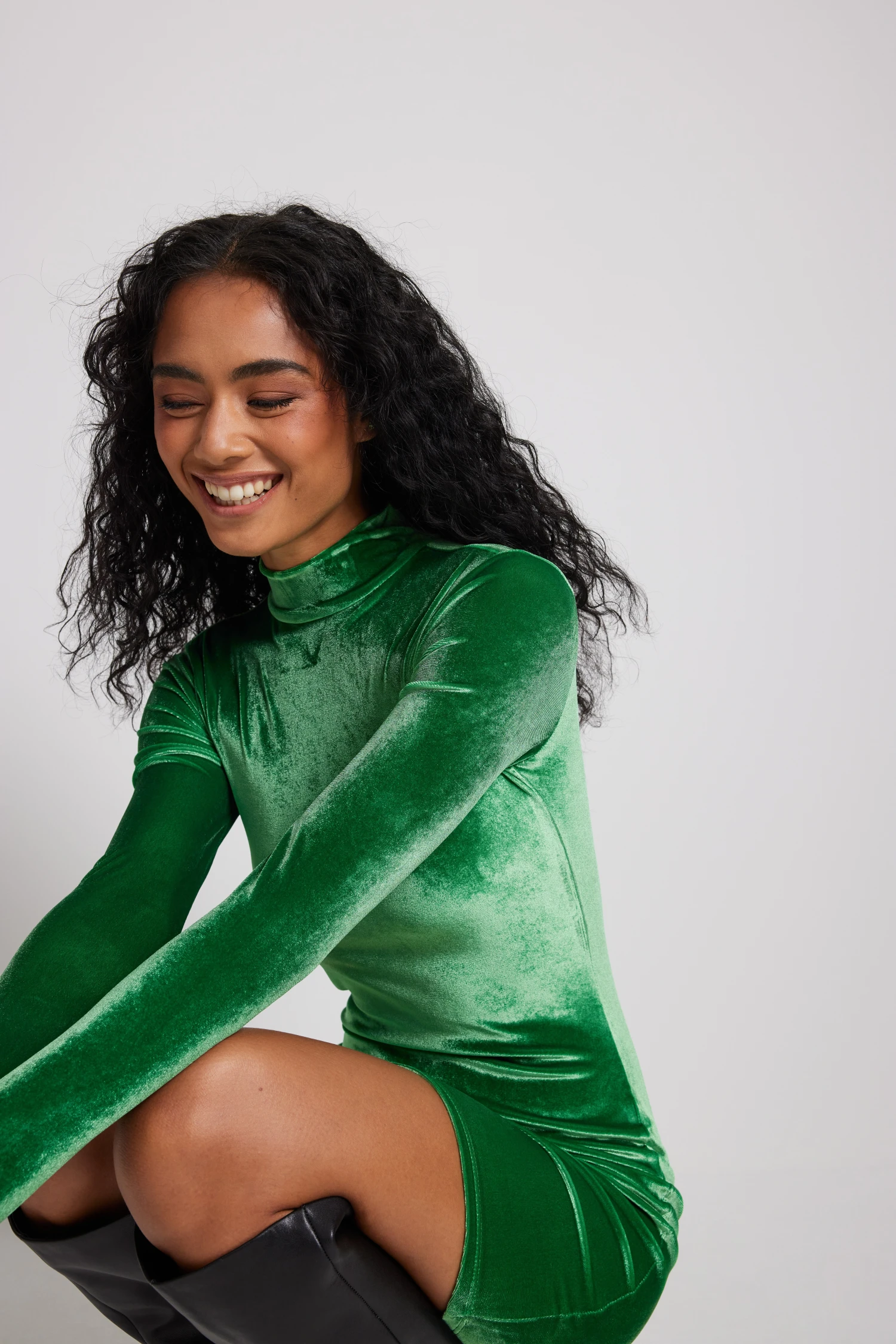 Cette robe courte est élastique et faite en velours et a un col haut, des manches longues et un bouton de fermeture à l’arrière de la nuque.