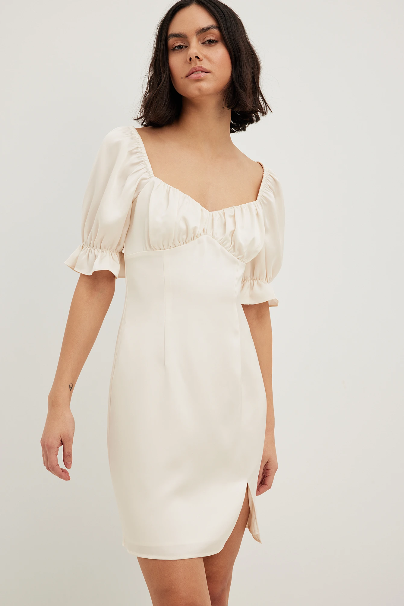 Cette robe a une matière brillante et légère. Elle a un toucher satin et une coupe fluide. Cette robe a un décolleté en coeur, des détails drapés sur la poitrine, des manches courtes bouffantes, une fermeture éclair latérale, une petite fente à l’avant et une doublure intérieure.