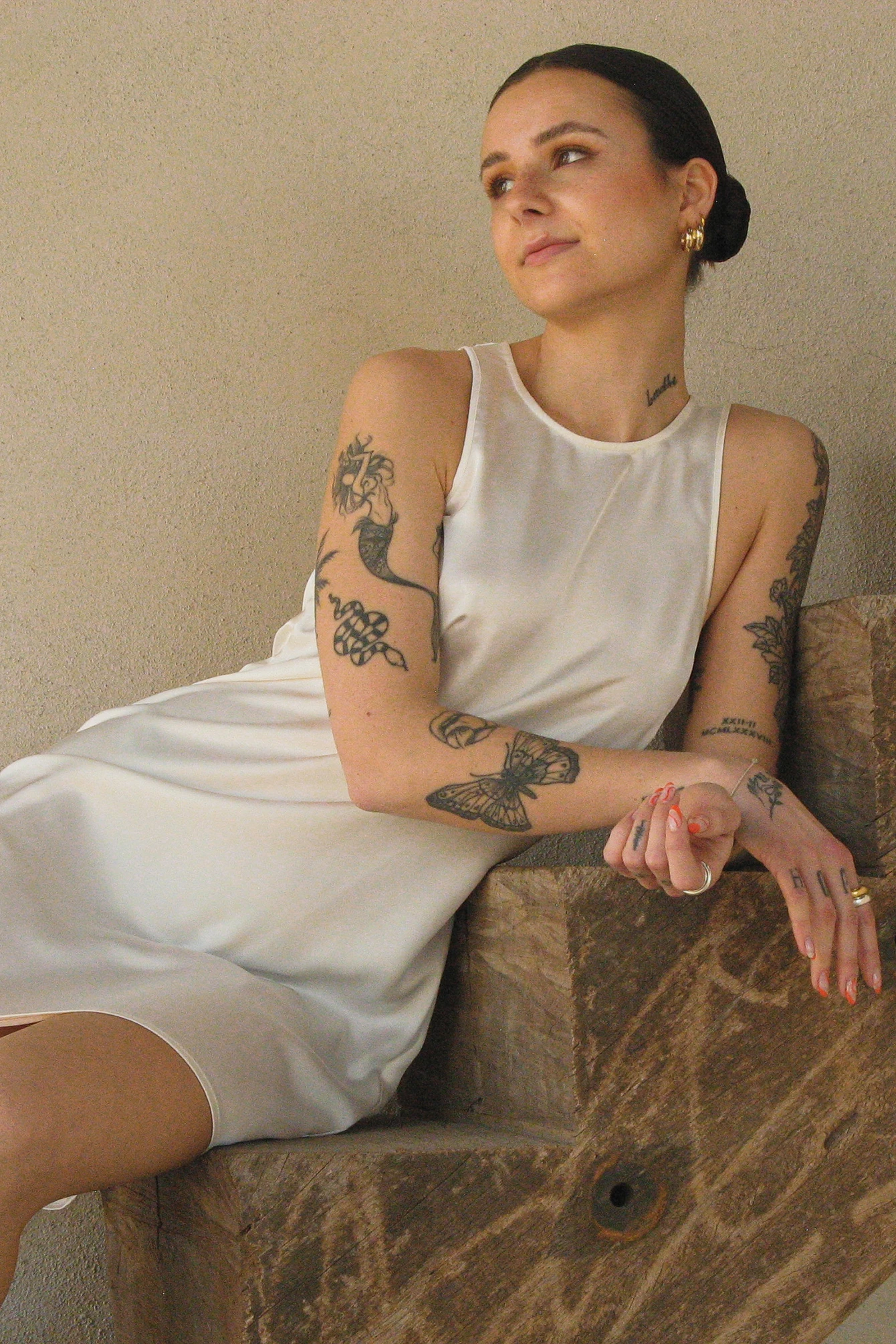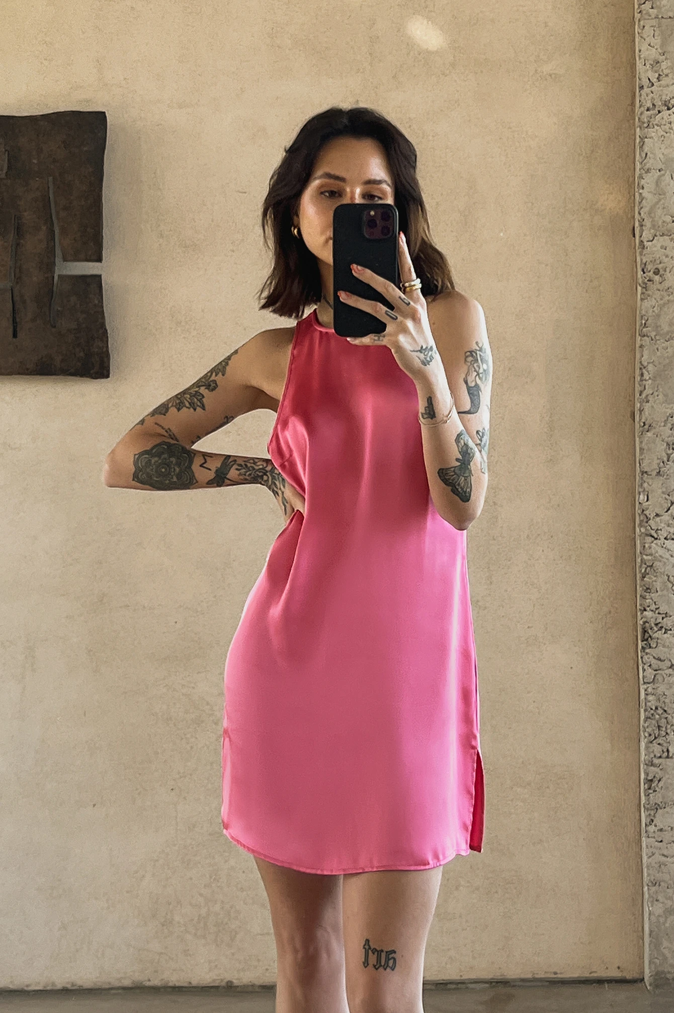 Cette robe courte a du satin fluide. Elle a un col arrondi haut et une fermeture éclair cachée à l’arrière. Cette robe courte a une petite fente sur le côté.