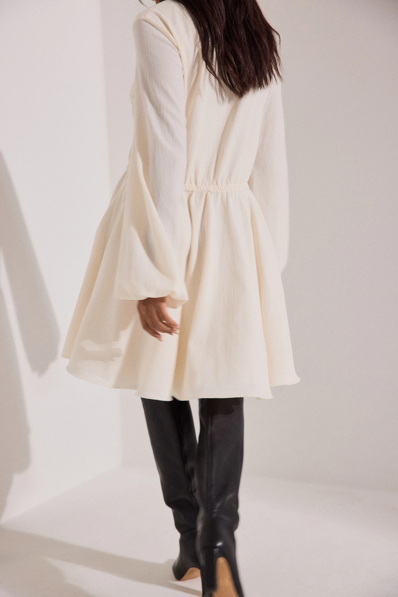 Cette robe courte a un cordon à la taille avec ajustable. Elle a des boutons de fermeture à l’avant et des manchettes élastiques. Cette robe courte a une doublure en tissu.
