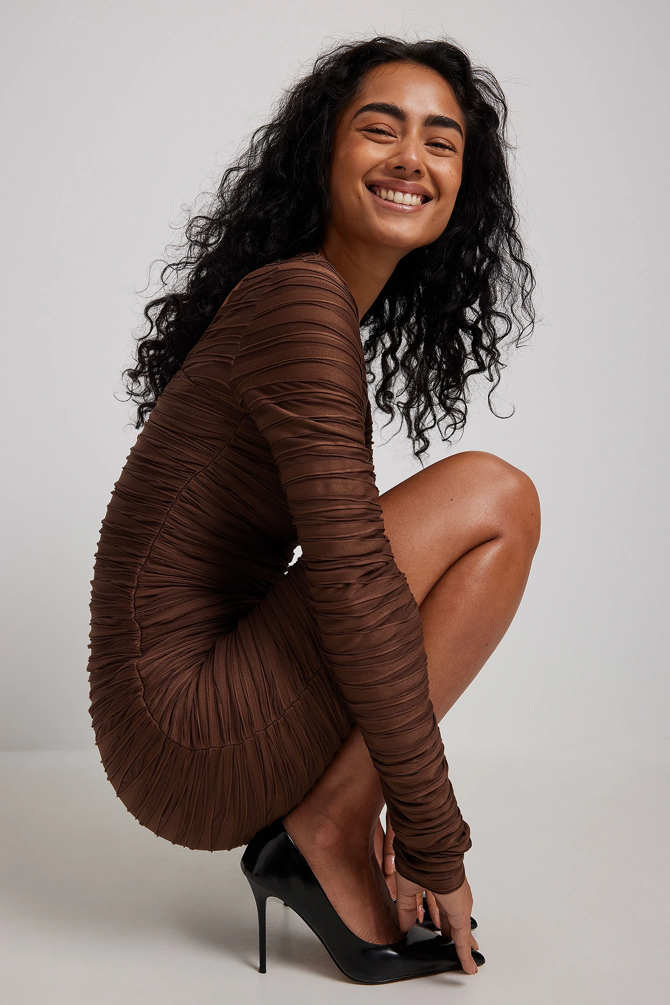 Cette robe courte a une encolure asymétrique, des manches longues, une fermeture éclair latérale et un tissu structuré avec détails froncés.