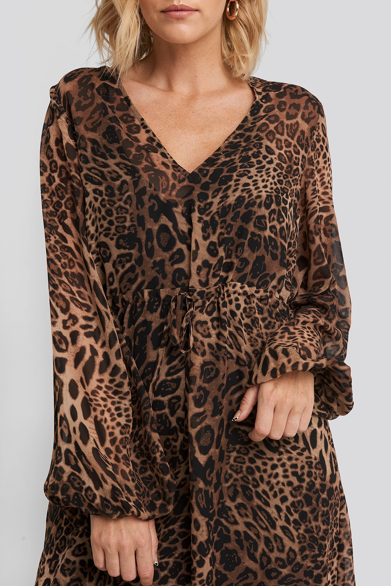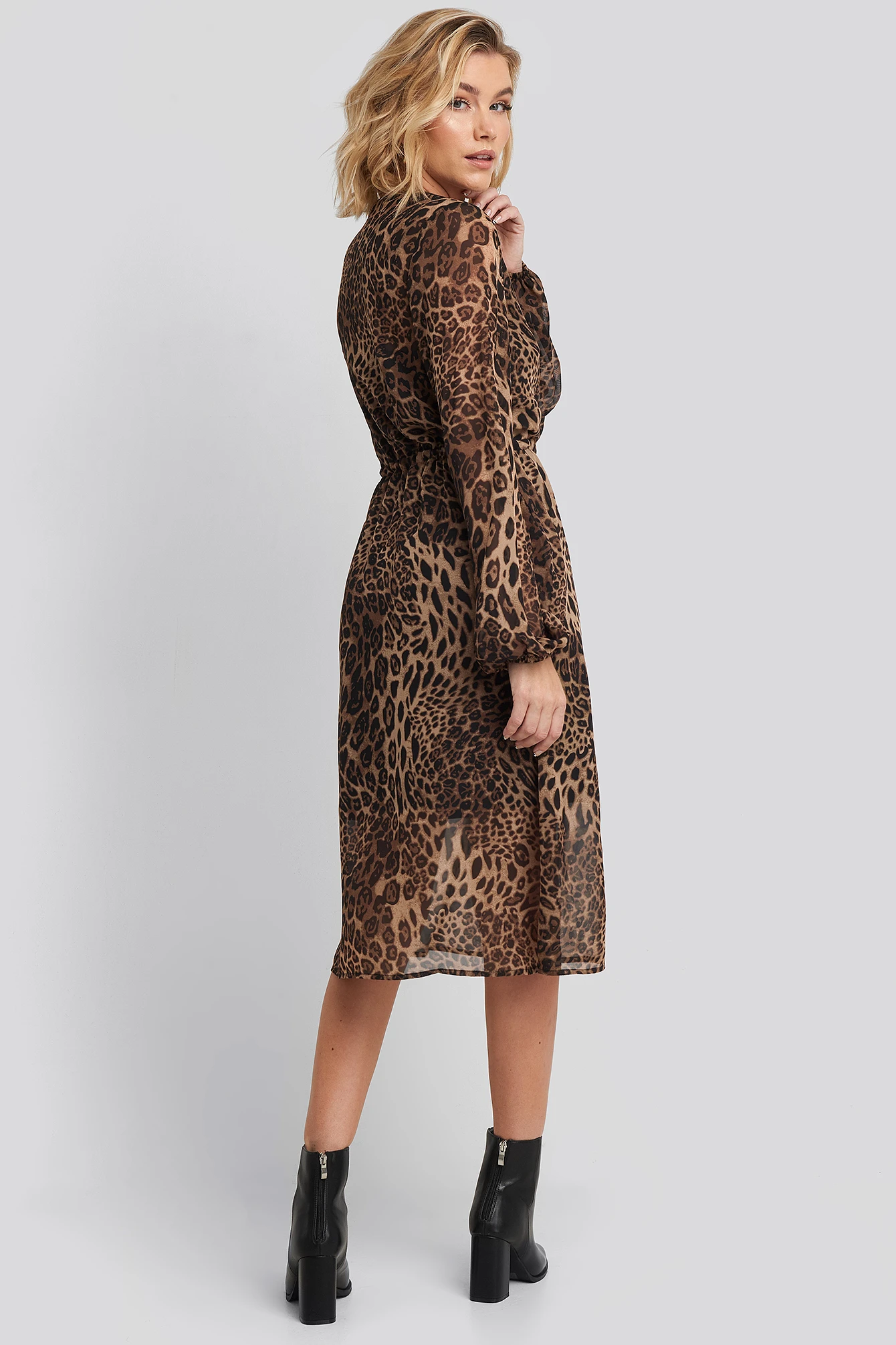 Cette robe midi a une matière translucide à motif léopard, des manches longues avec manchettes élastiques, un col en V, une ceinture cordon, une coupe fluide et une nuisette.