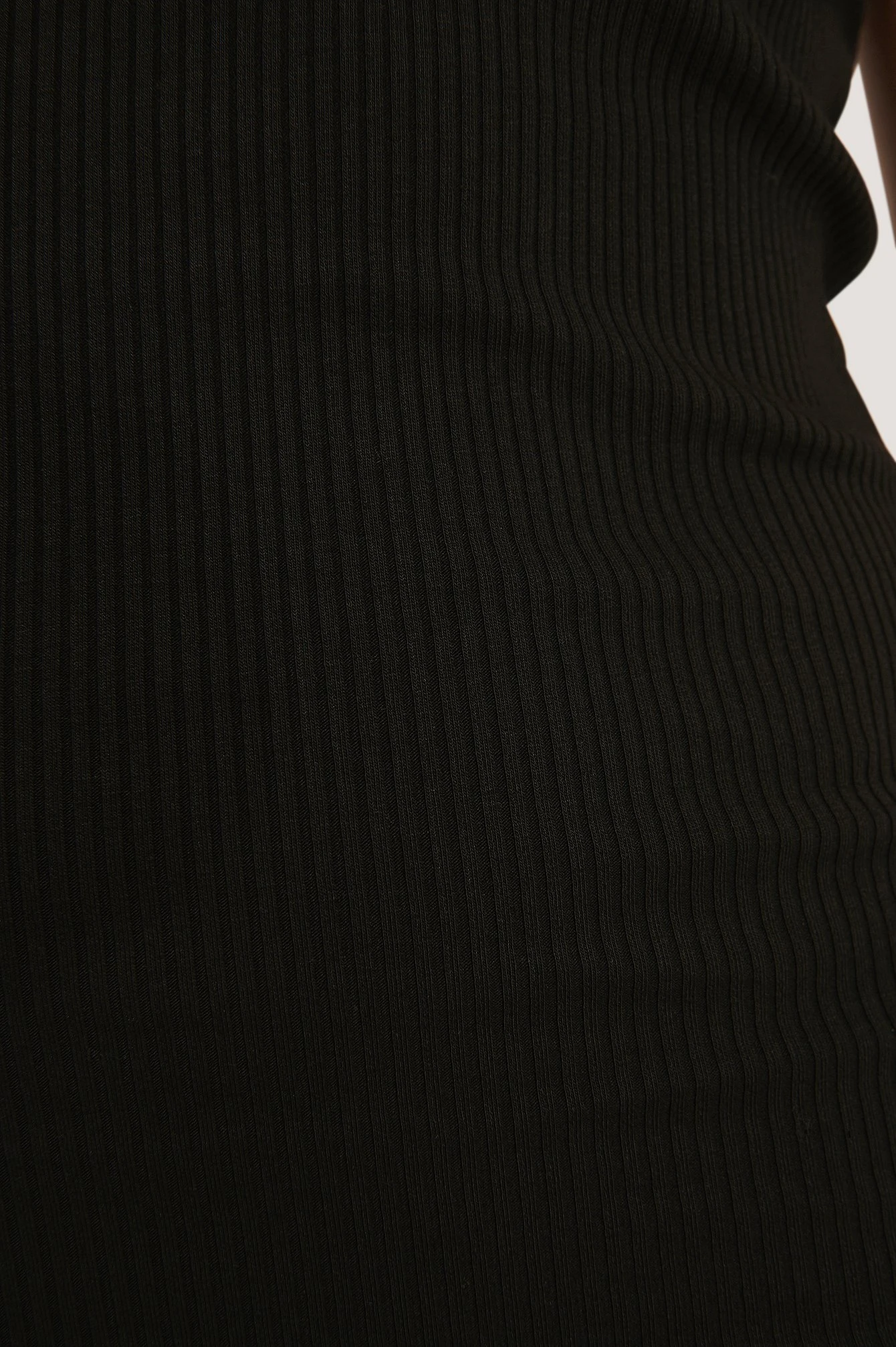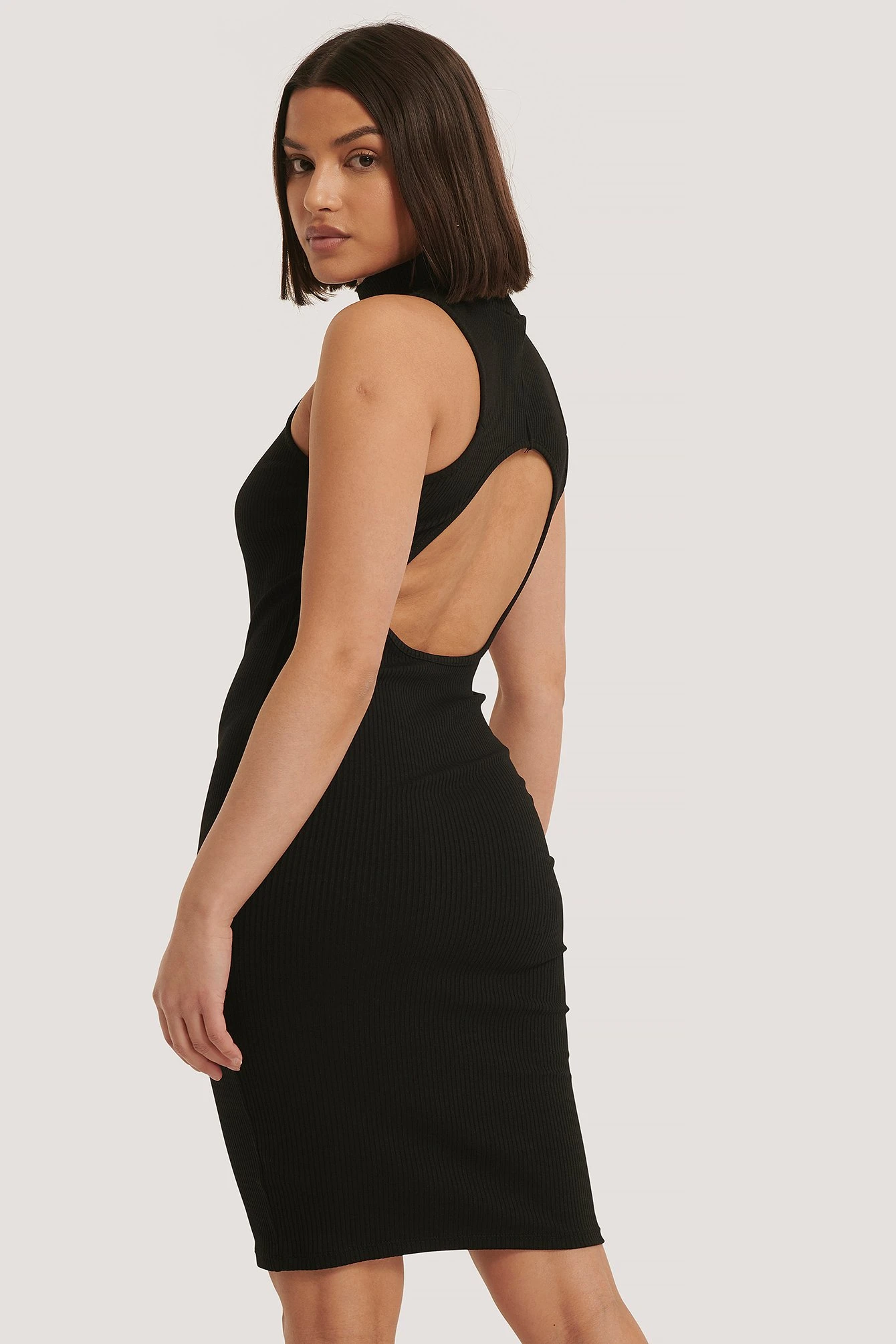 Cette robe est à nervures et a un col haut, un design sans manches, un dos ouvert, une taille courte et une coupe moulante élastique.