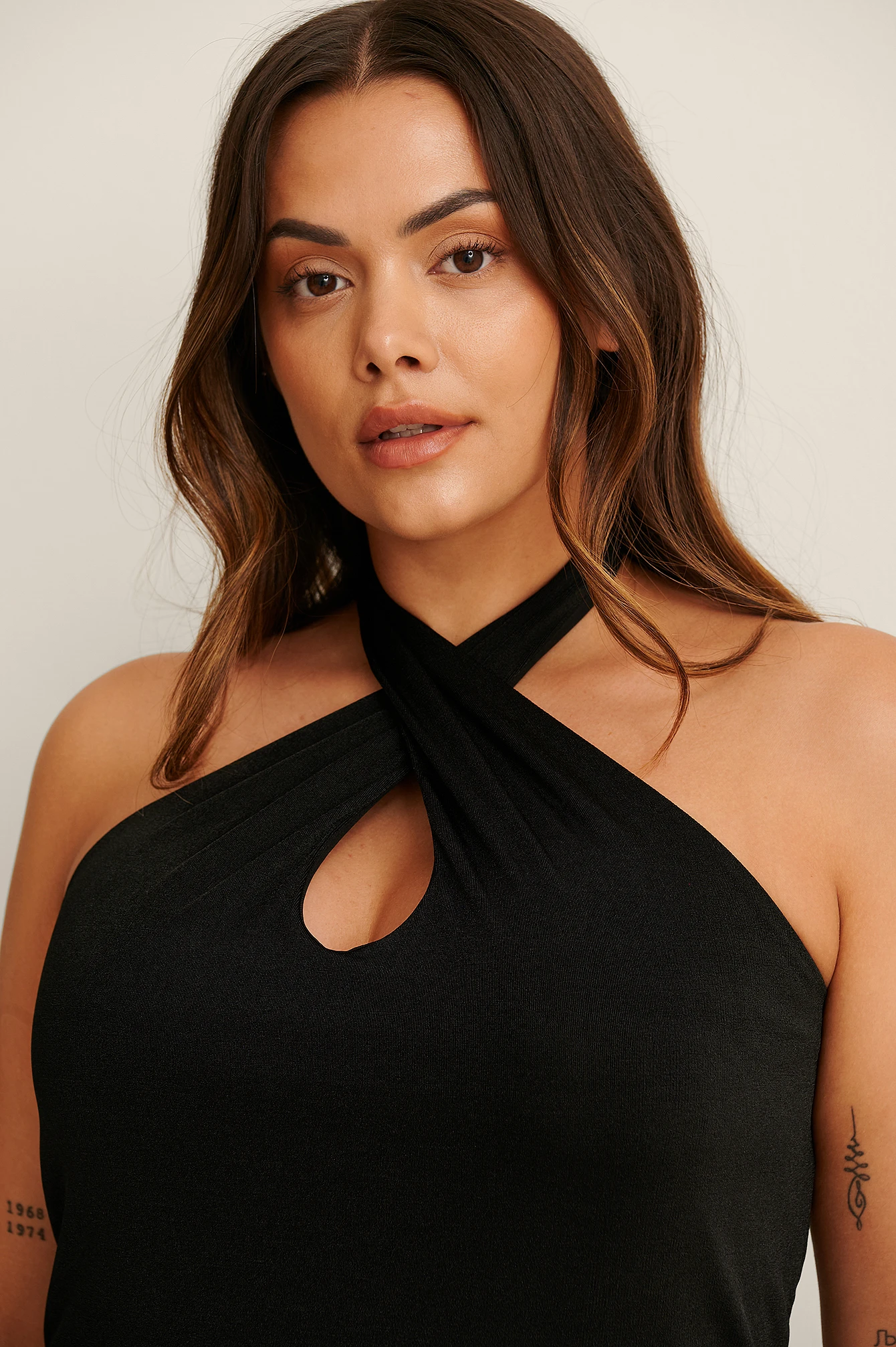 Cette robe a un modèle de bretelle à nouer dans le cou. Elle a un dos ouvert et une matière brillante. Cette robe a une doublure intérieure et une taille courte.
