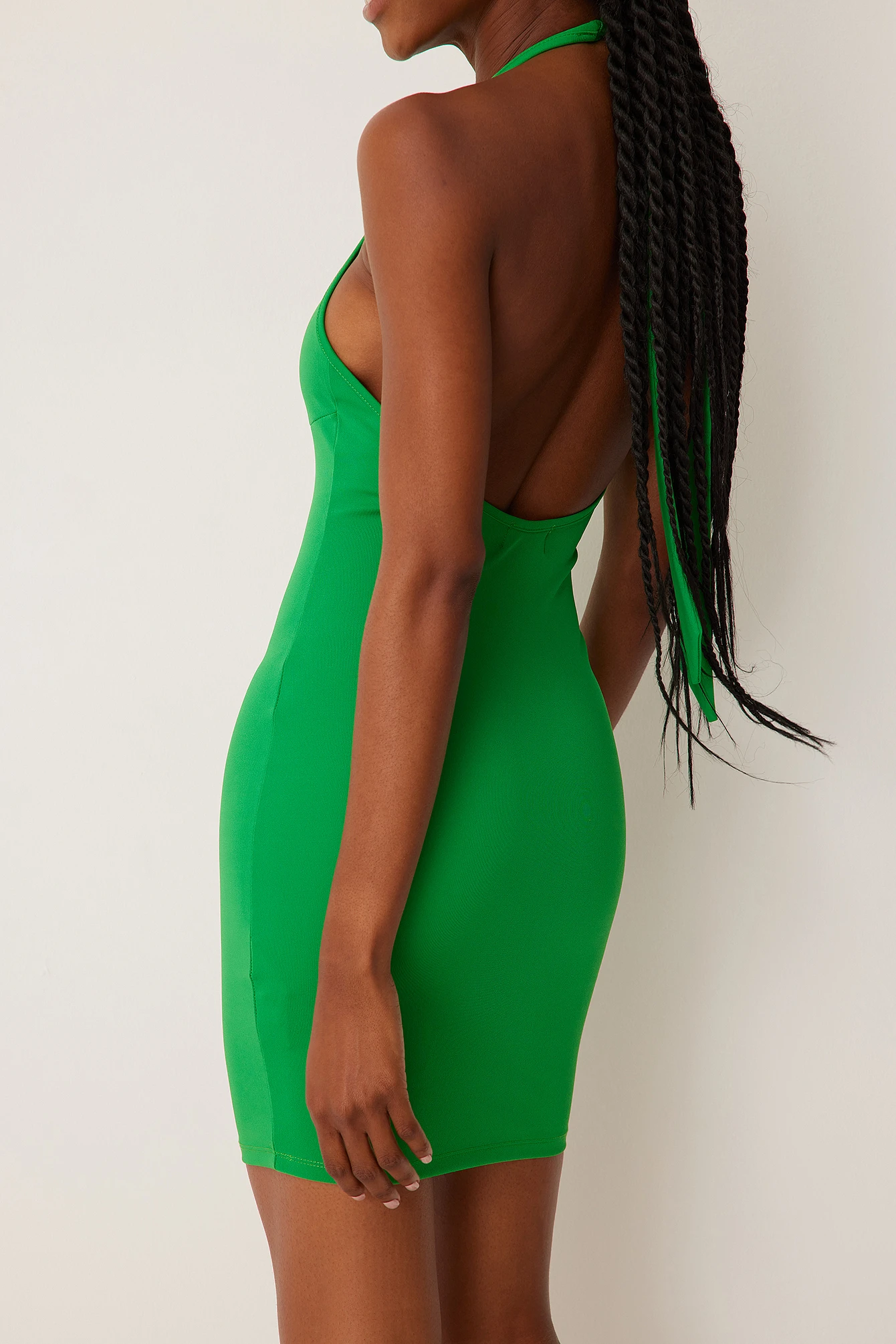 Cette robe courte a une attache de tour de cou, un détail trous sur la poitrine et une matière élastique.