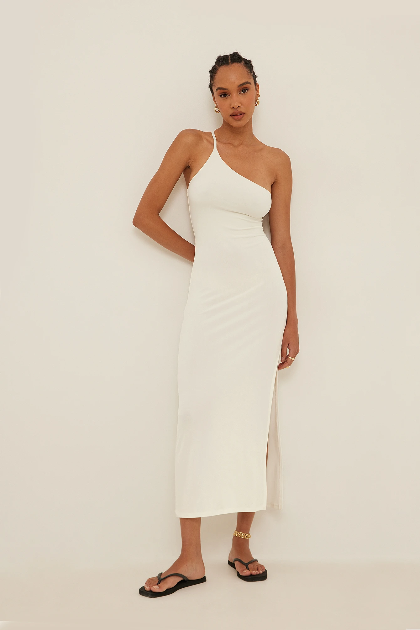 Cette robe midi a une bretelle, une encolure asymétrique, une fente latérale et une matiÚre élastique.