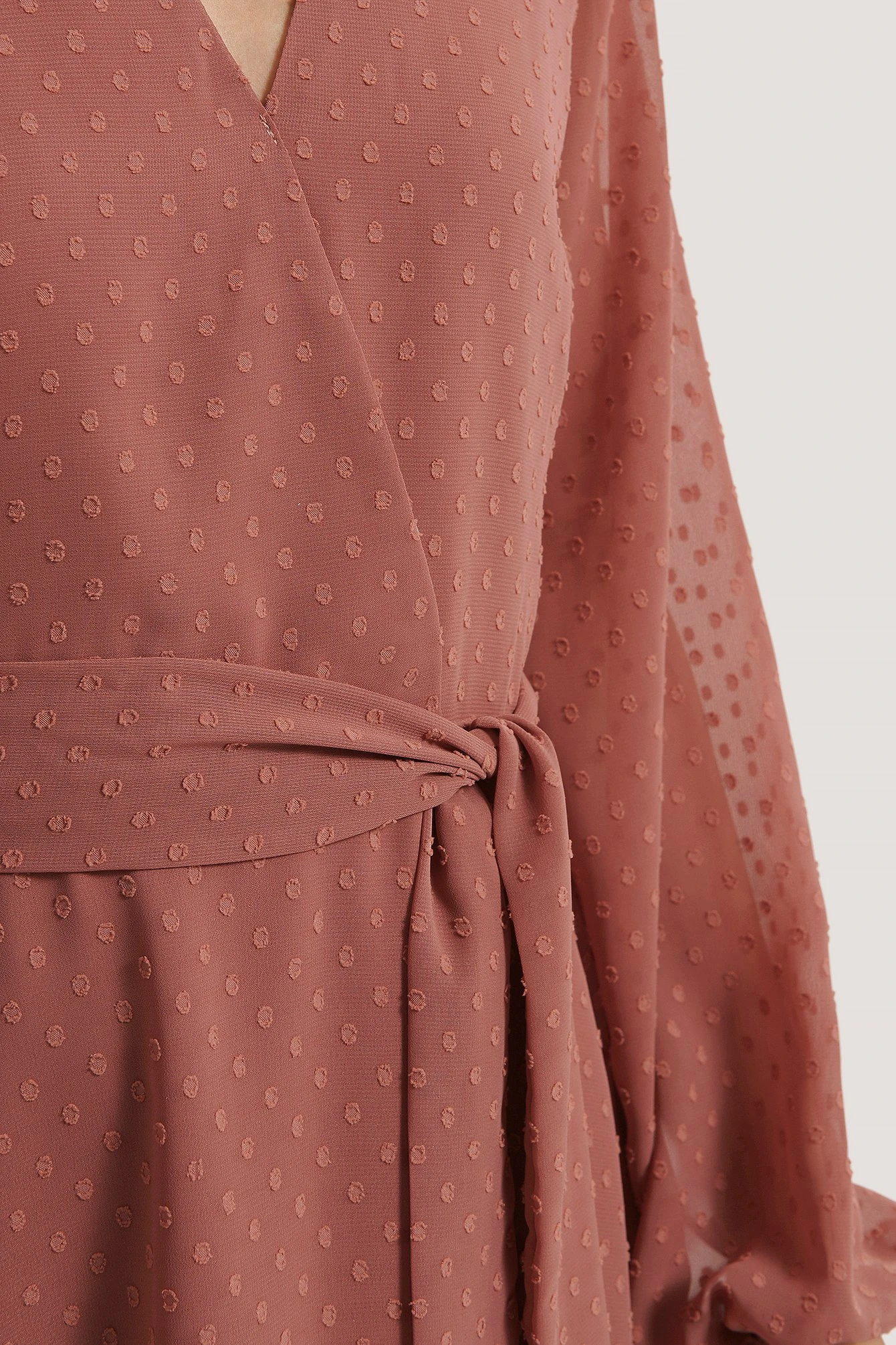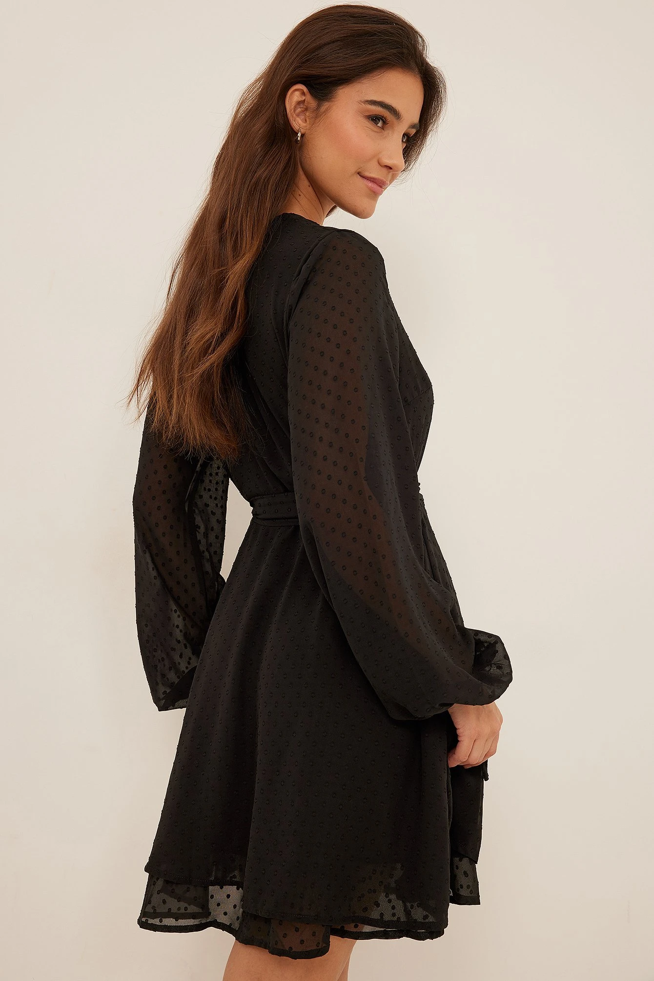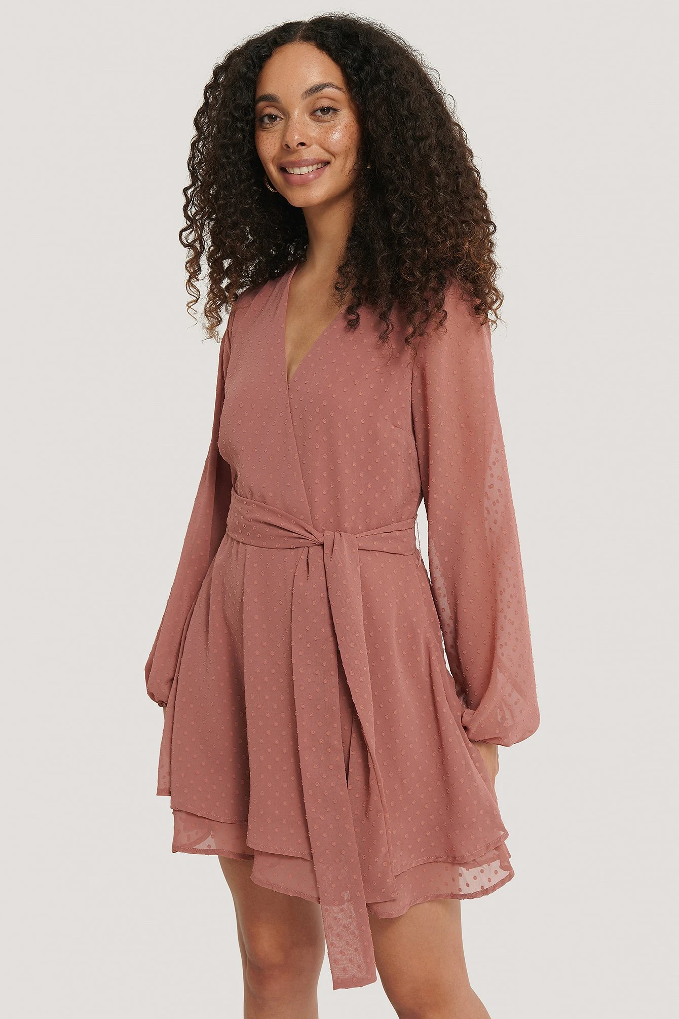 Cette robe courte a un design chevauchant avec un pointillé, des manches longues avec détails auto-sérrés aux manchettes, une ceinture ajustable et une épaisseur ruchée sur l’ourlet.