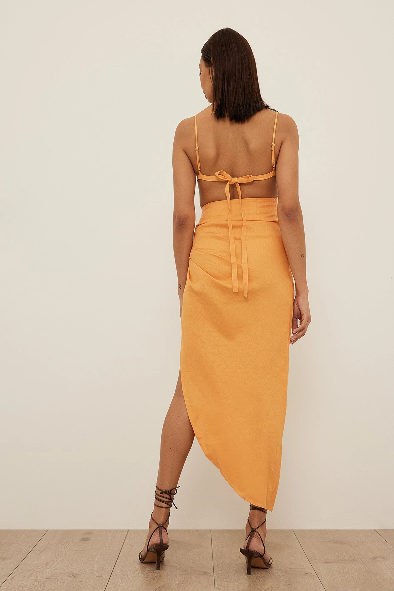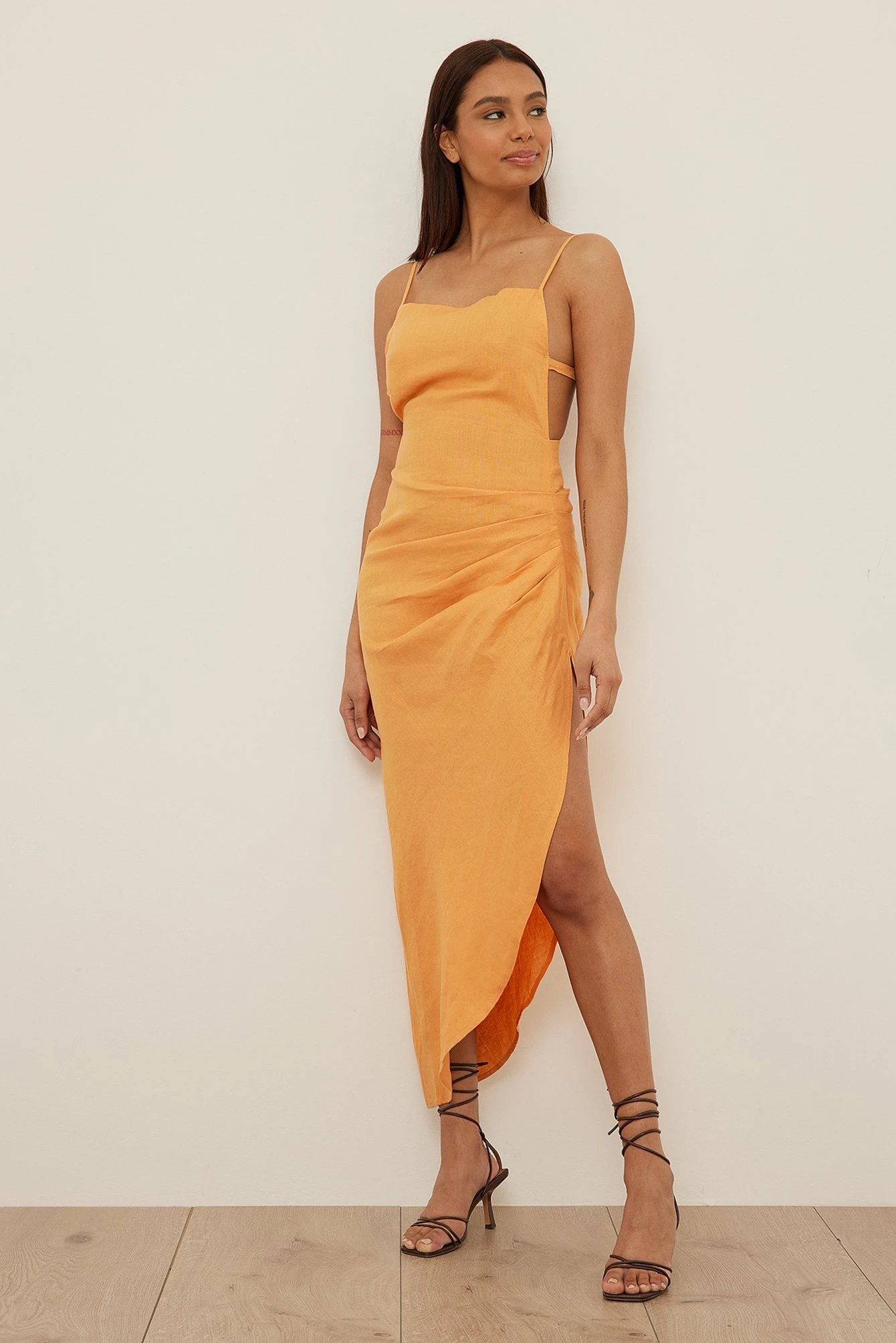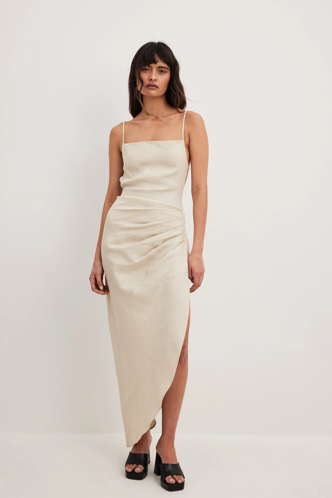 Cette robe est idéale pour aller à la plage et pour l’été et a un cou droit. Elle a des bretelles fines réglables et un dos ouvert avec ruban à nouer en noeud. Cette robe a une fermeture éclair latérale cachée, un détail drapé, un détail fendu sur un côté et au bas et une taille longue.
