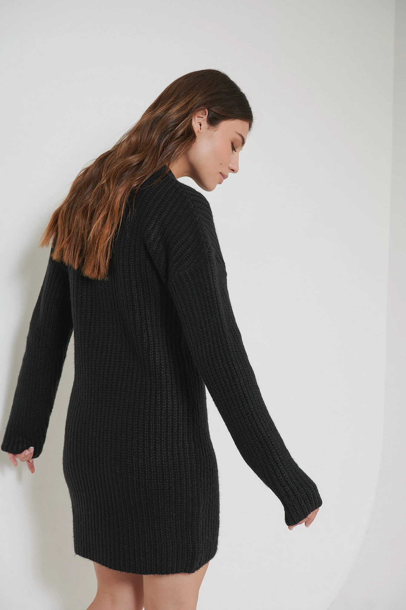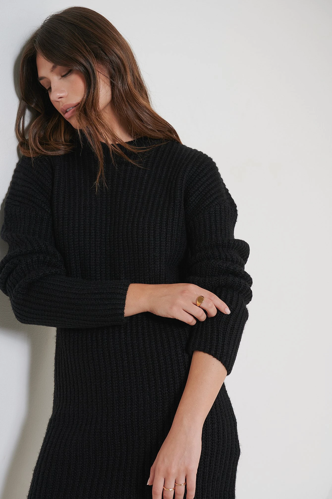 Cette robe a un col arrondi, des épaules tombantes, un design tricoté et une taille courte.