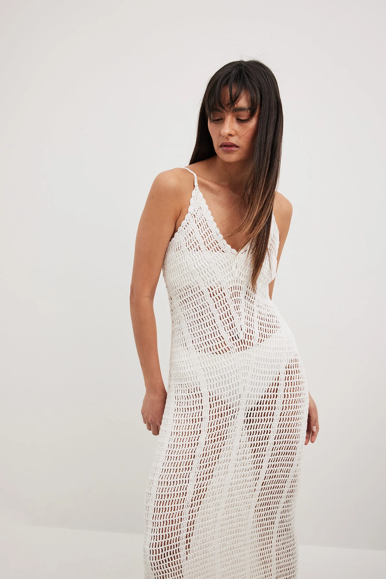 Cette robe longue est tricotée et faite en coton et a une coupe slim élastique. Elle a un col en V, des bretelles à nouer réglables et un motif au crochet transparent et plus épais.
