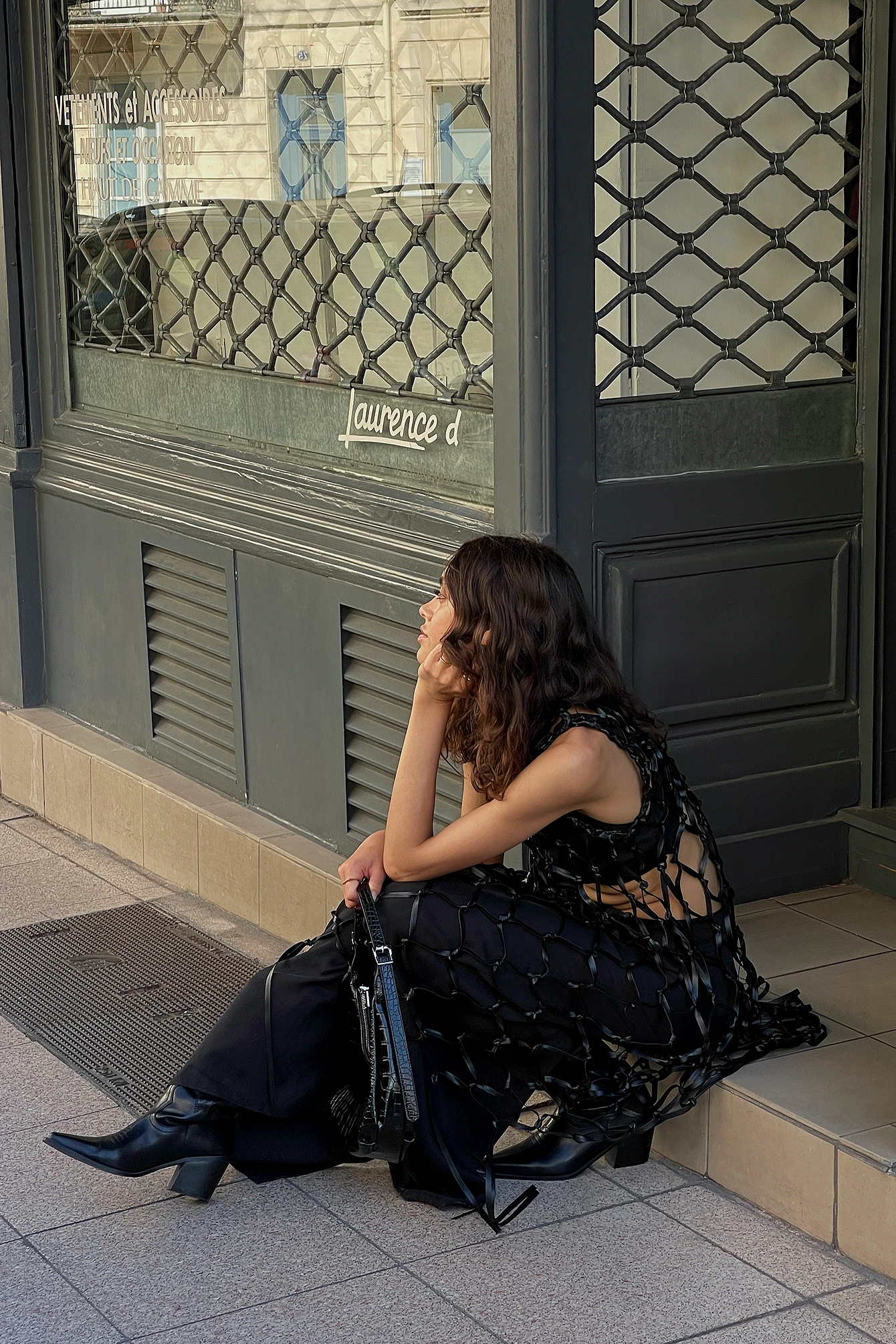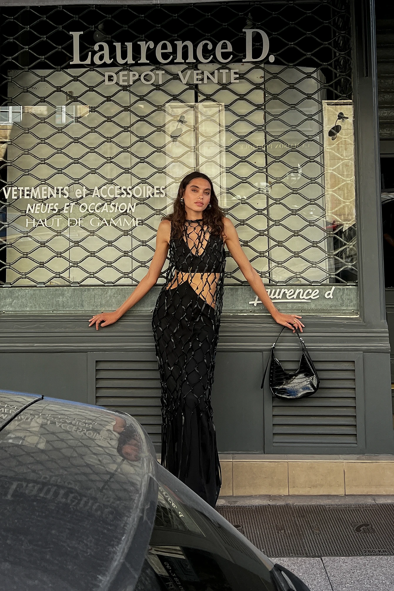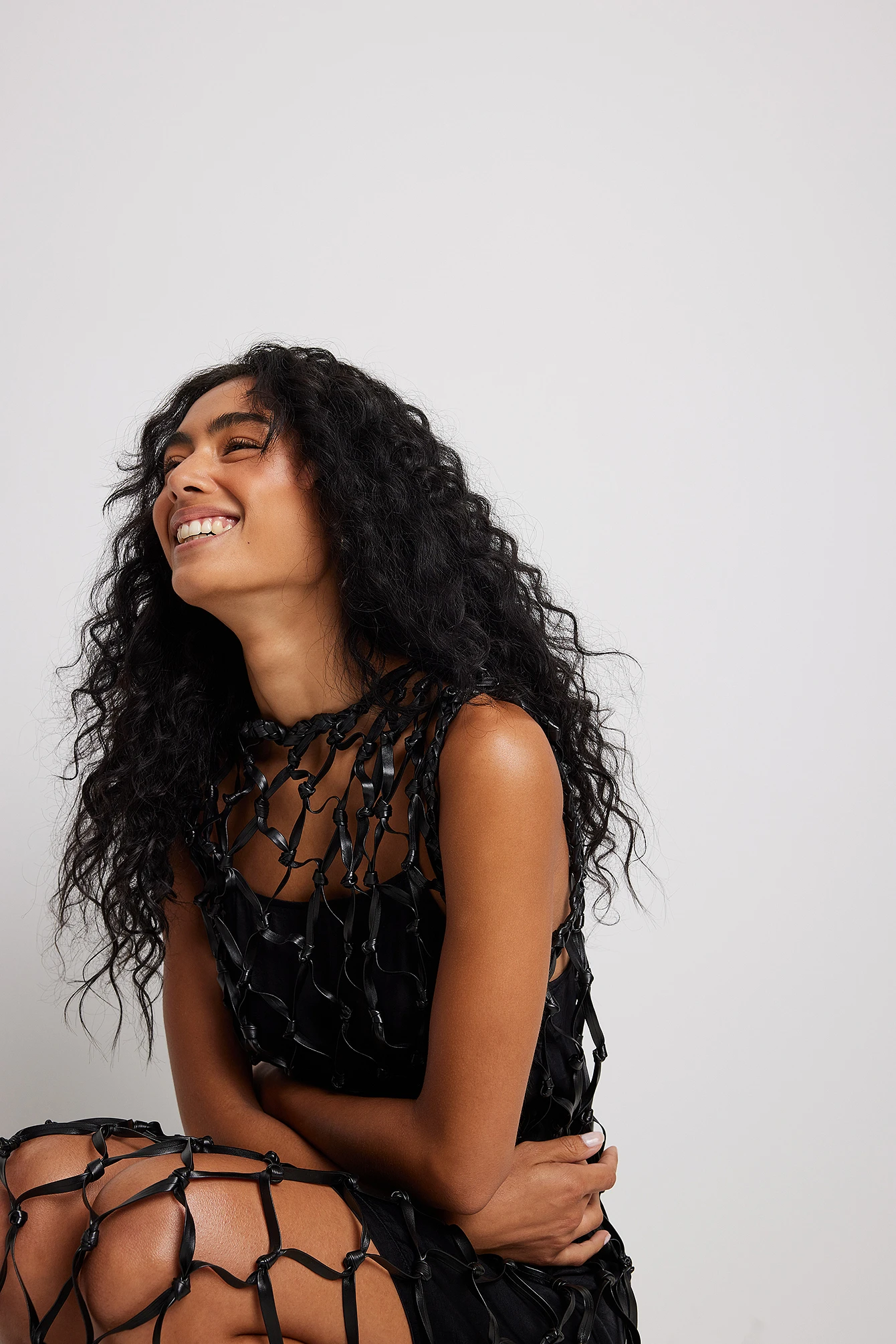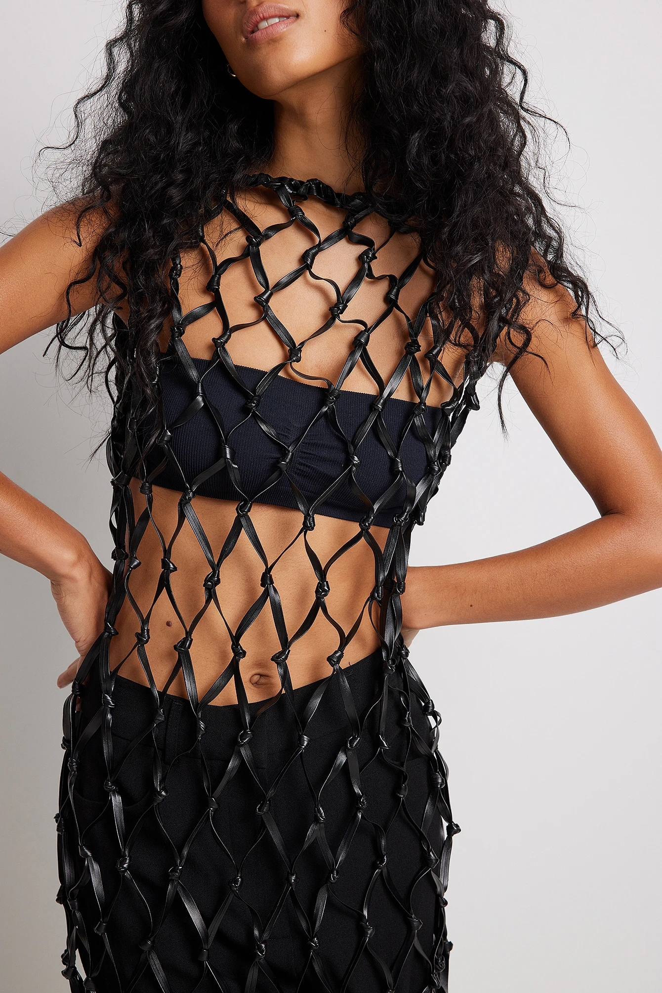 Cette robe longue a un design sans manches et un design filet de pêche large avec franges sur l’ourlet bas.