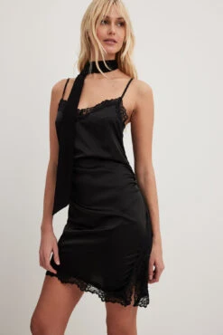 Cette robe courte a du tissu en satin avec détails en dentelle et un col en V. Elle a des bretelles fines réglables et des détails froncés sur les côtés. Cette robe courte a une fermeture éclair latérale cachée et une légère fente au bas.