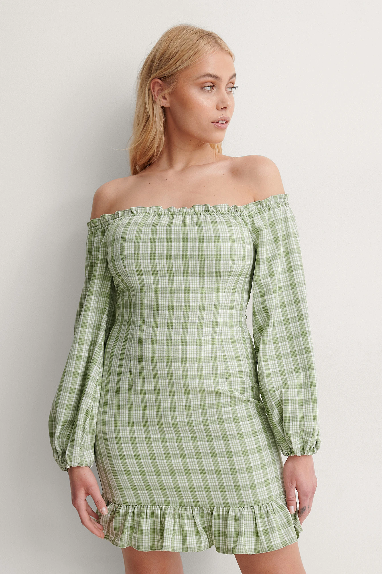 Cette robe a un style à épaules dénudées avec détails à volant, des longues manches avec manchettes élastiques et serrées, une fermeture éclair latérale cachée, une coupe fluide avec détails à volant sur l’ourlet bas, une taille courte et un motif à carreaux.