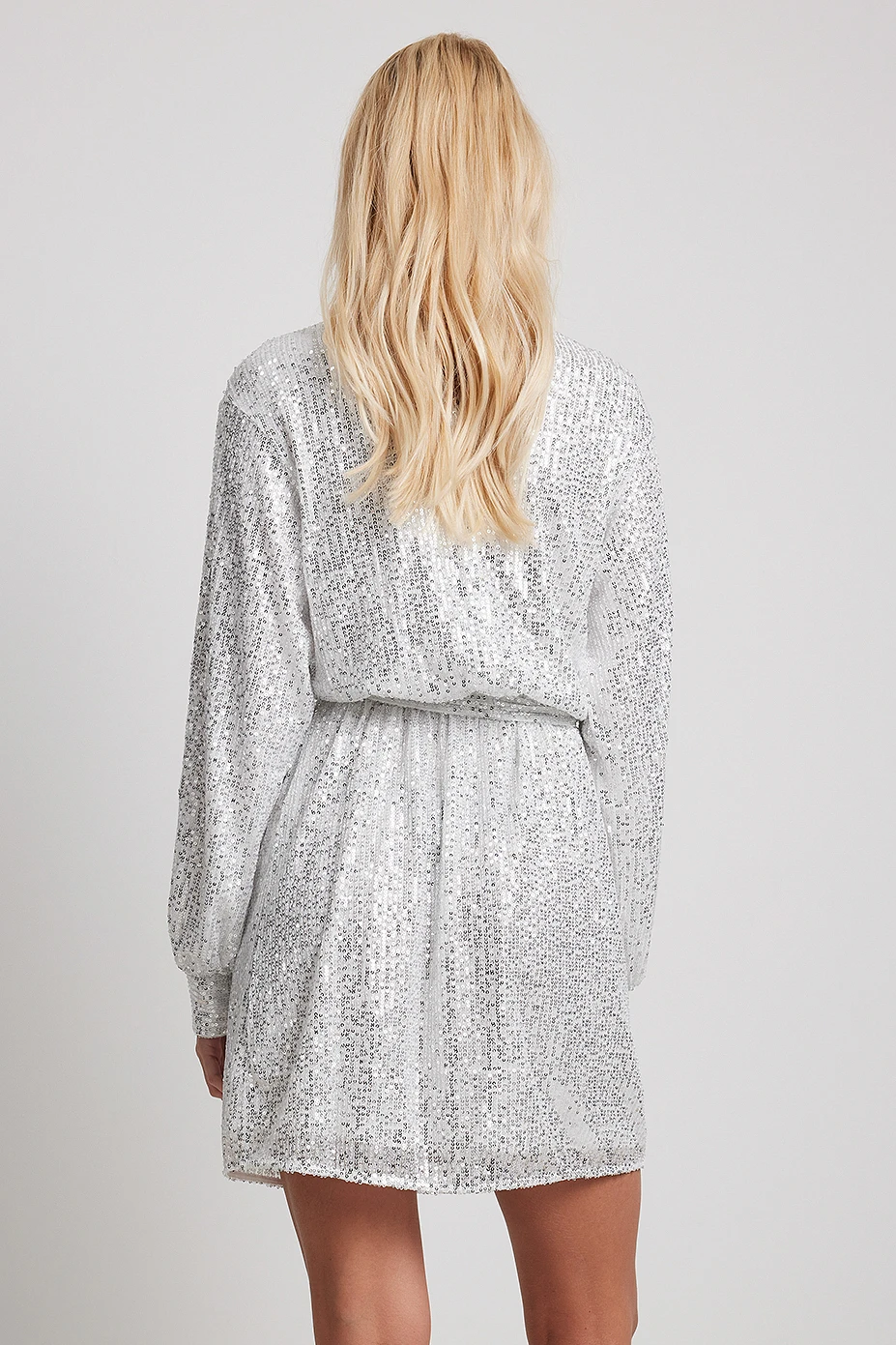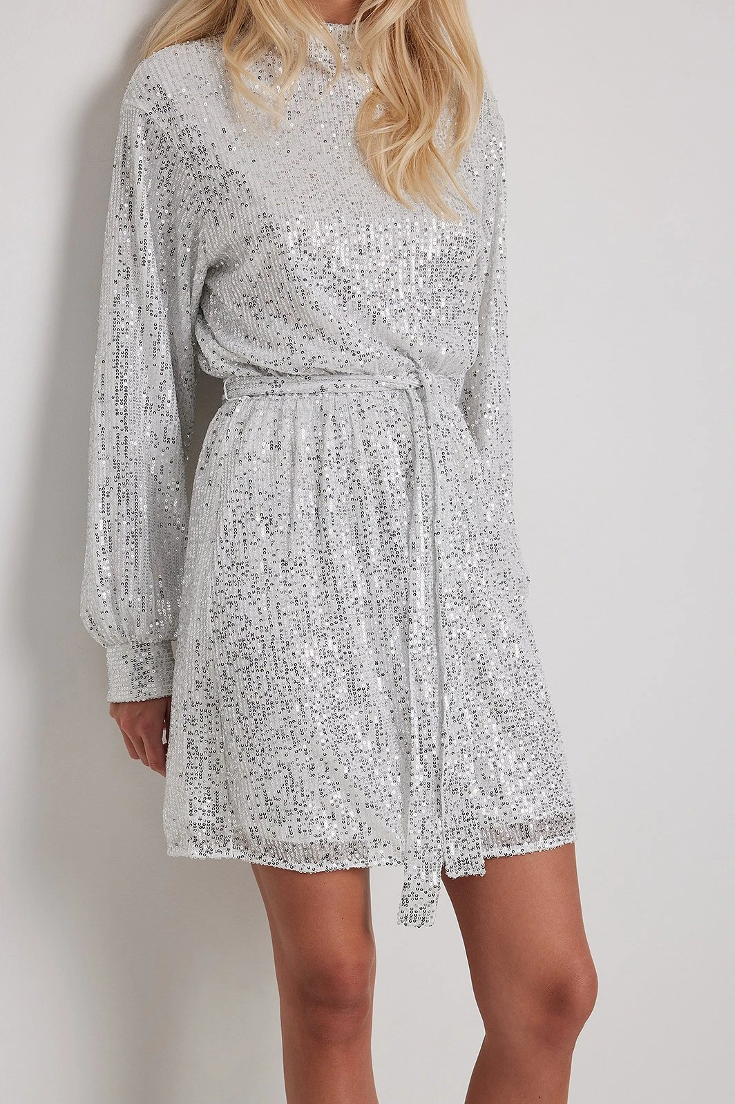 Cette robe a un col haut avec bouton de fermeture à l’arrière. Elle a des épaules tombantes légèrement, une ceinture élastique avec ruban à nouer amovible et une doublure complète.