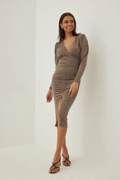 Cette robe midi a un col en V, une épaulette avec détail froncé et une fente frontale.
