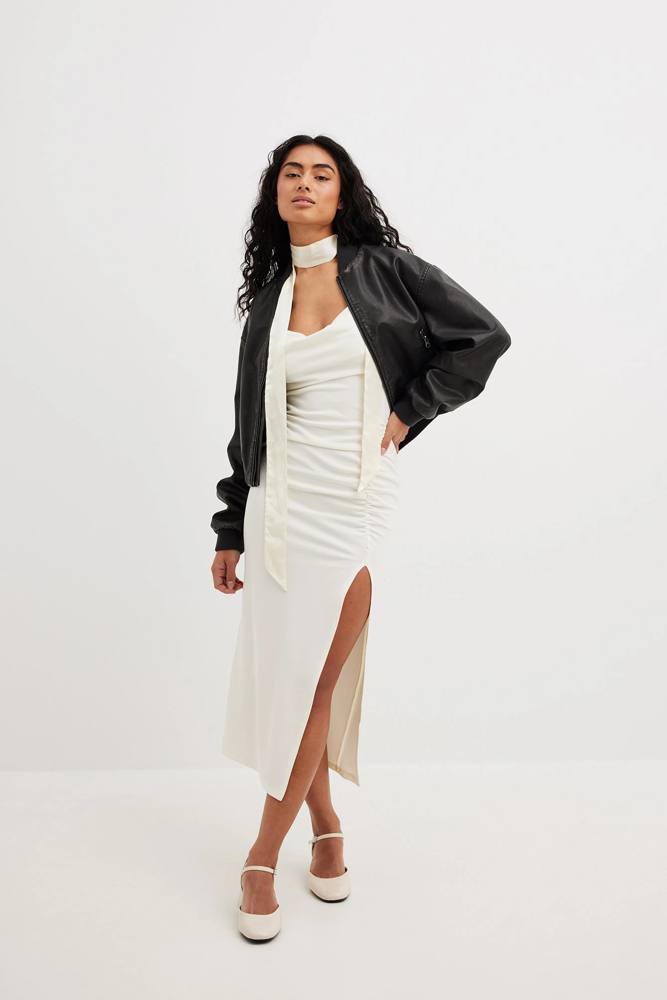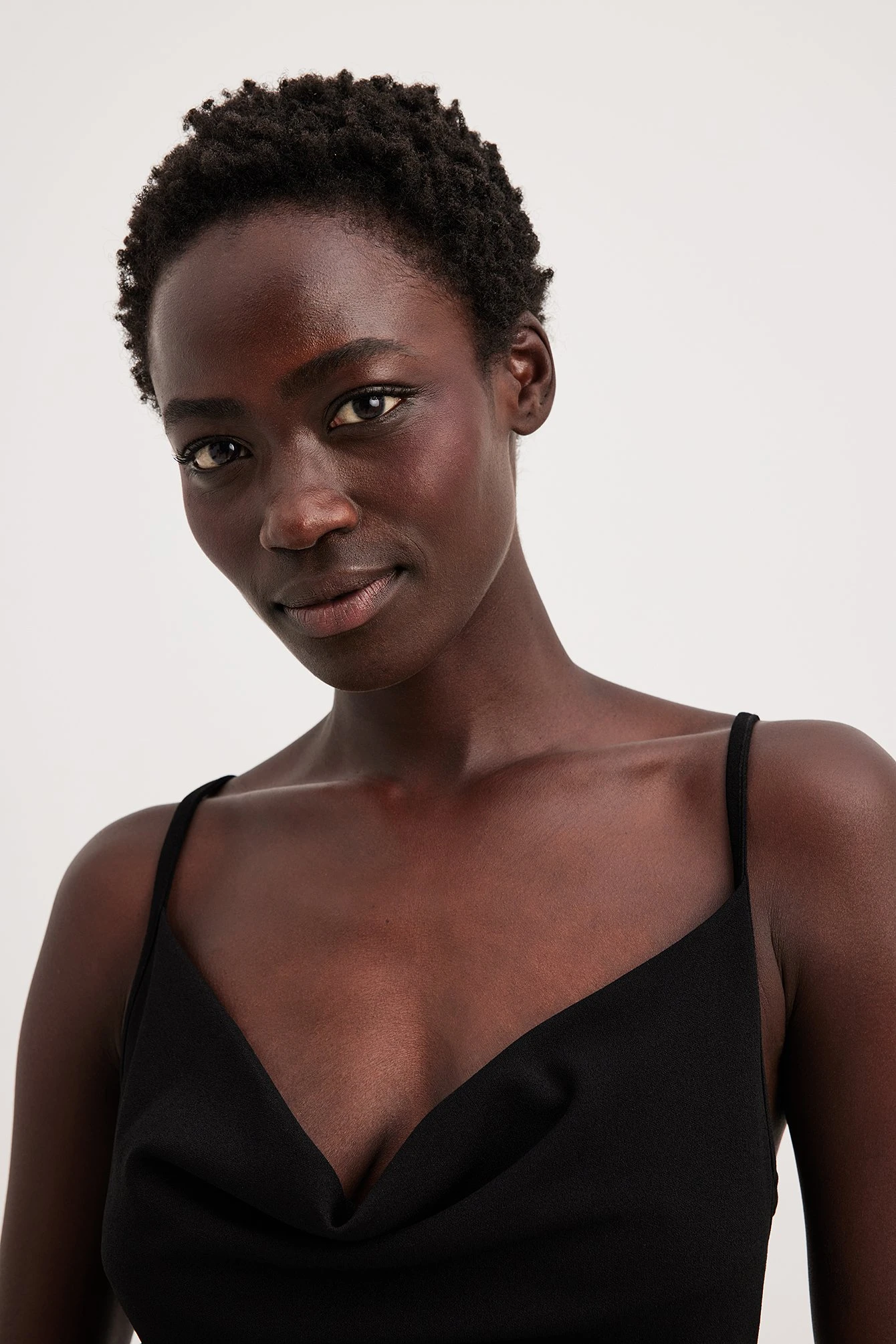 Cette robe est ajustée et a une matière élastique. Elle a une encolure drapée et des bretelles fines. Notre robe a un froncement sur le côté et une fente latérale haute.