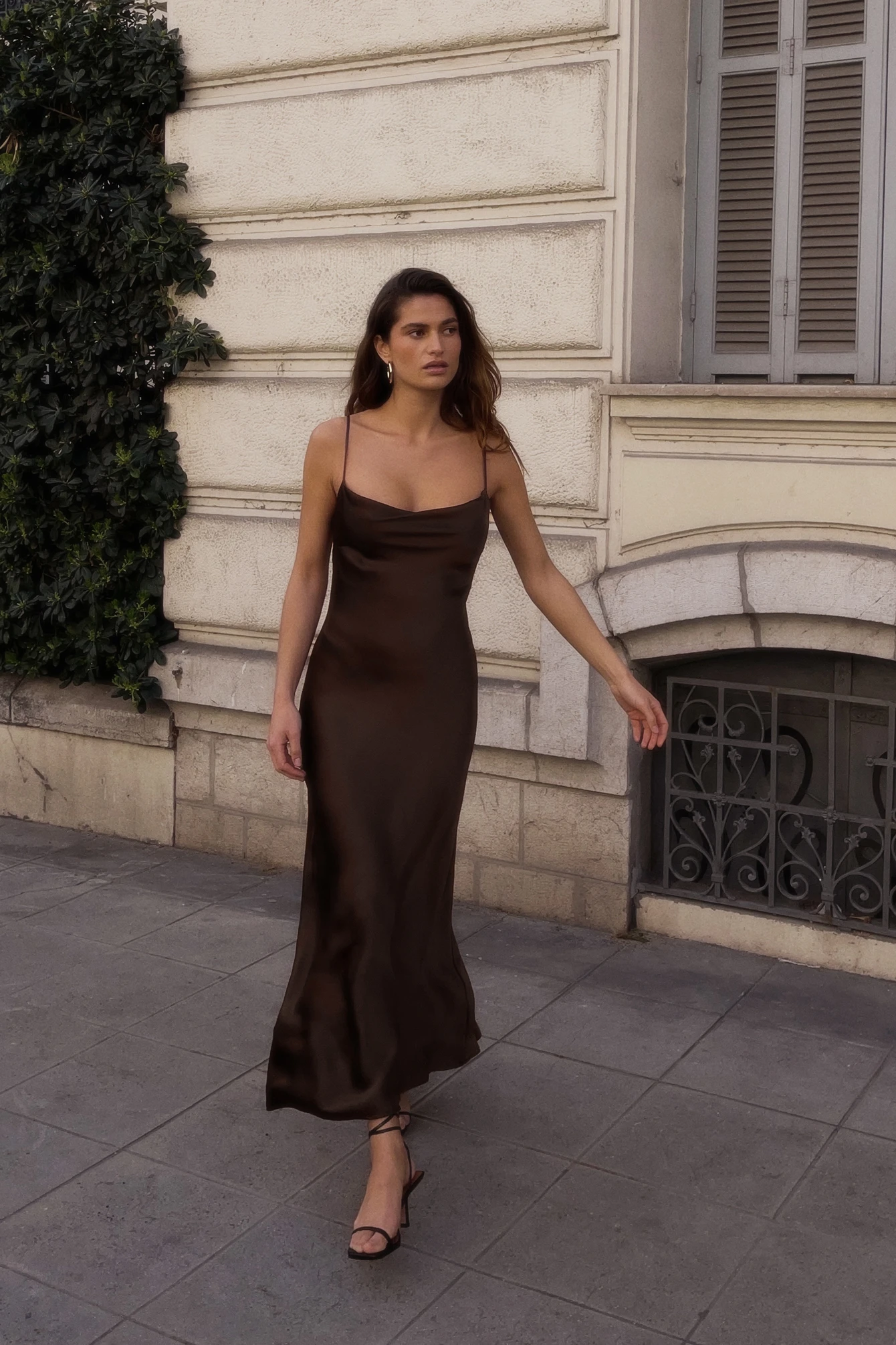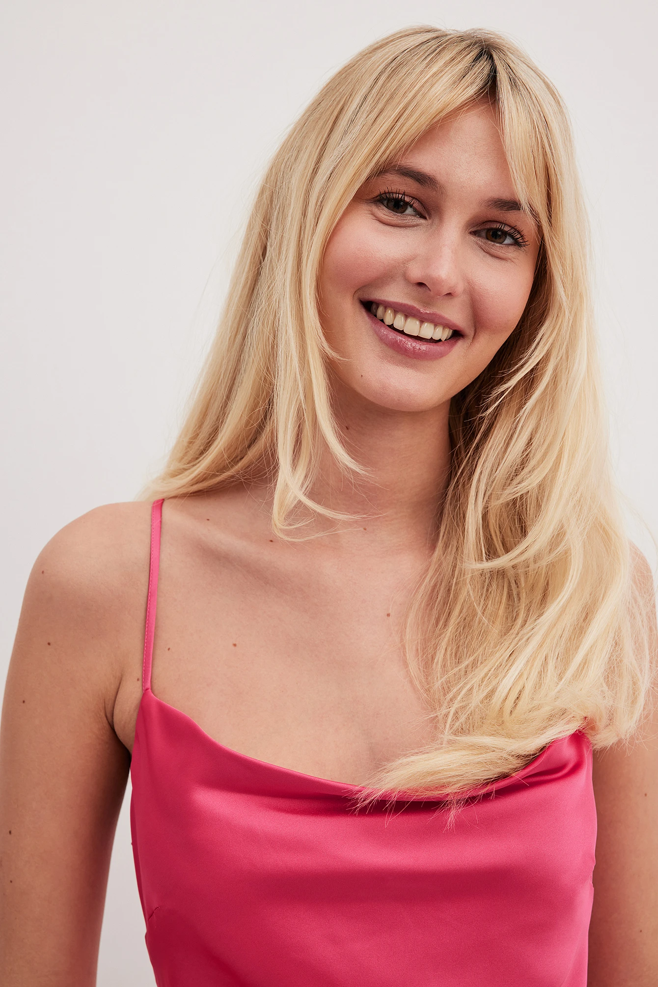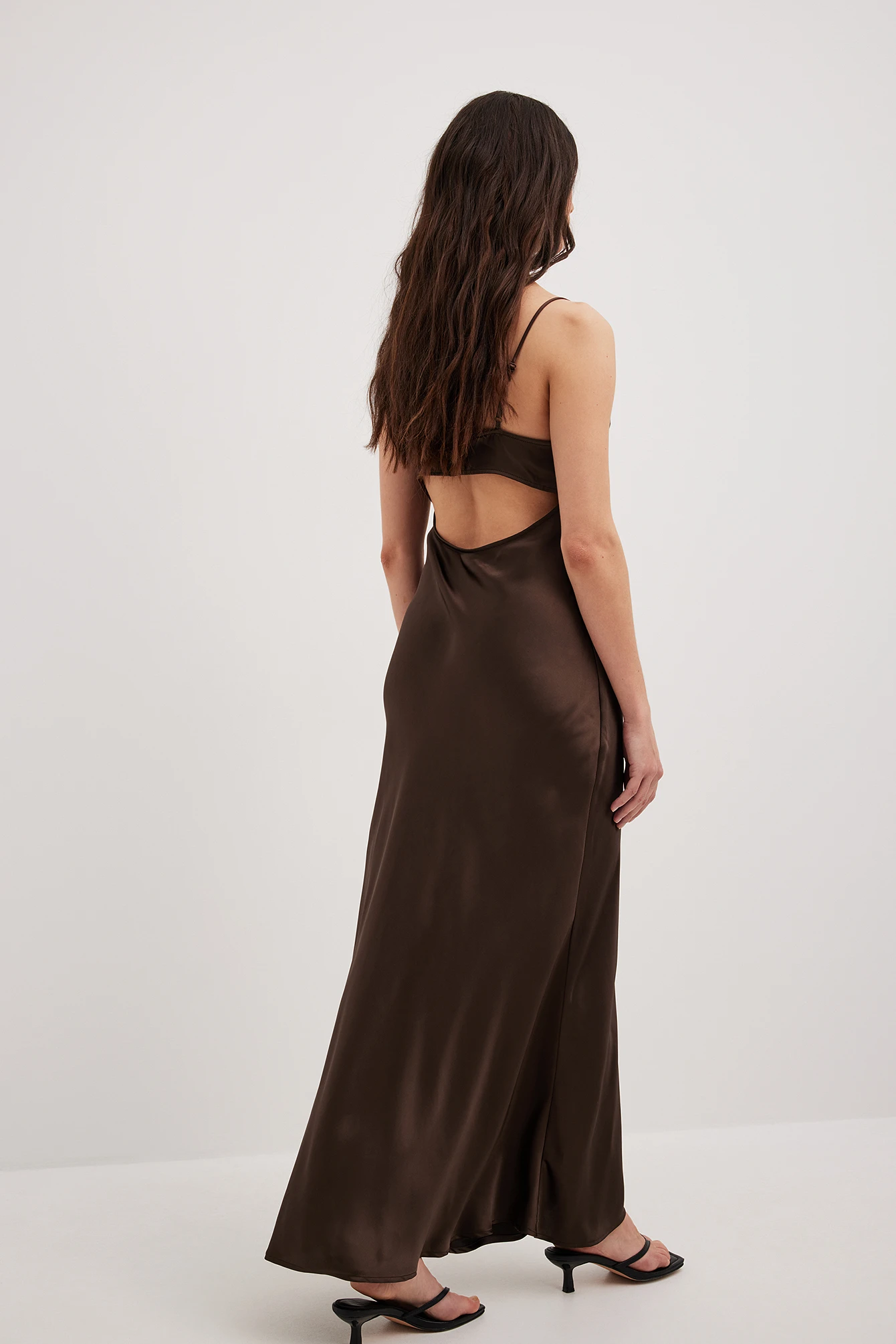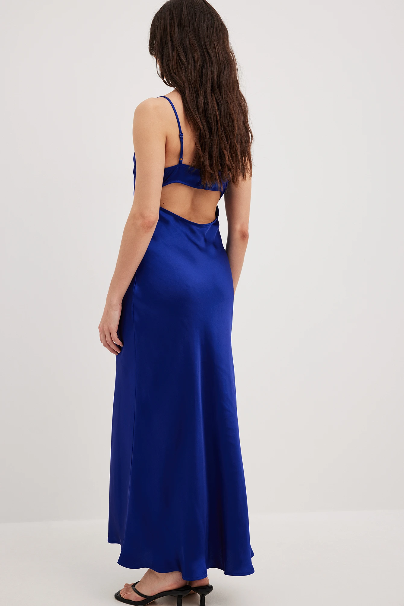 Cette robe longue a un toucher satin. Elle a une coupe fluide et un design sans manches avec bretelles ajustables. Cette robe longue a un col bénitier, un détail découpé à l’arrière et un crochet et oeillet de fermeture à l’arrière.