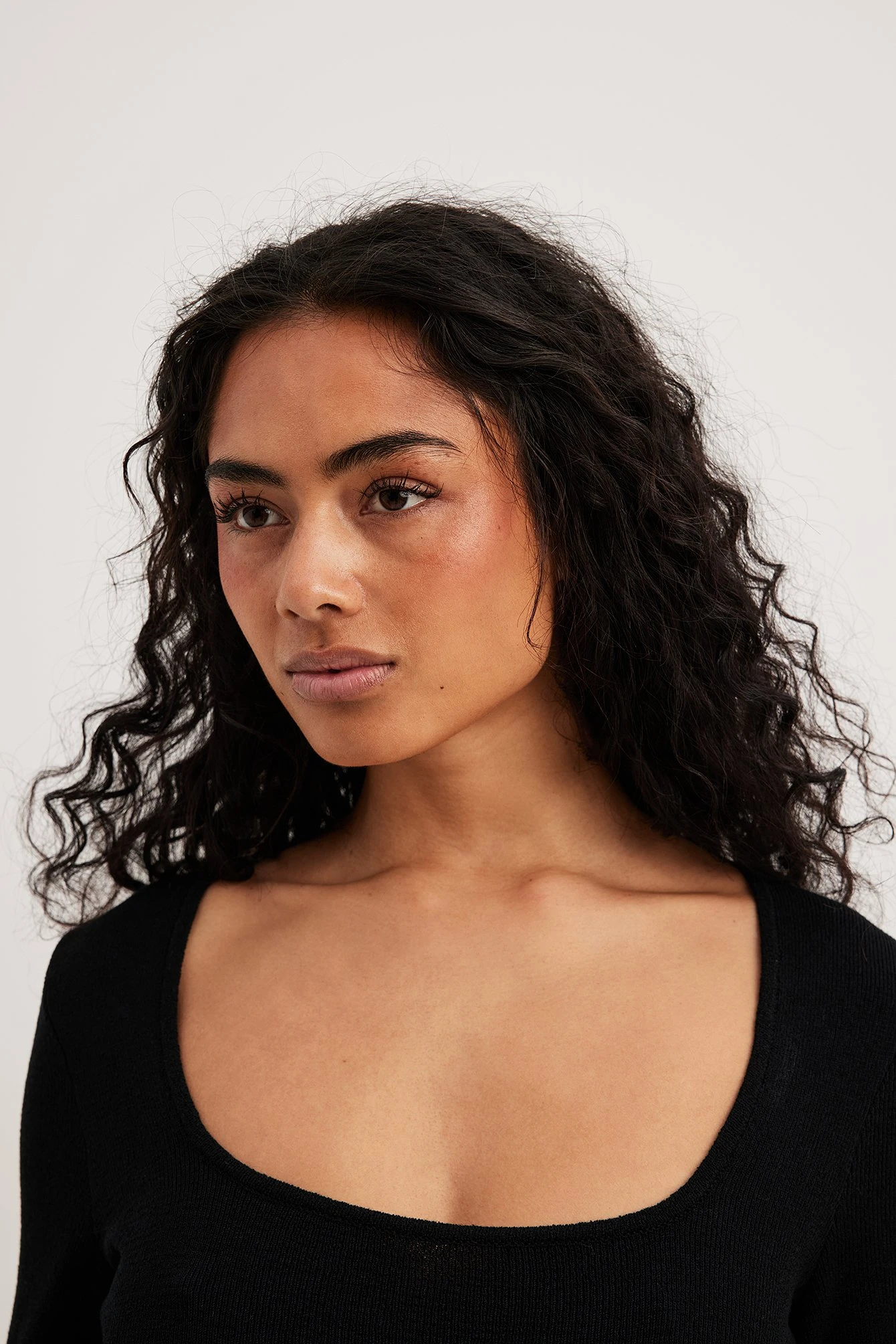 Cette robe longue est tricotée et élastique et a de la forme serrée. Elle a un col carré et des manches longues. Cette robe longue a un détail fendu haut.
