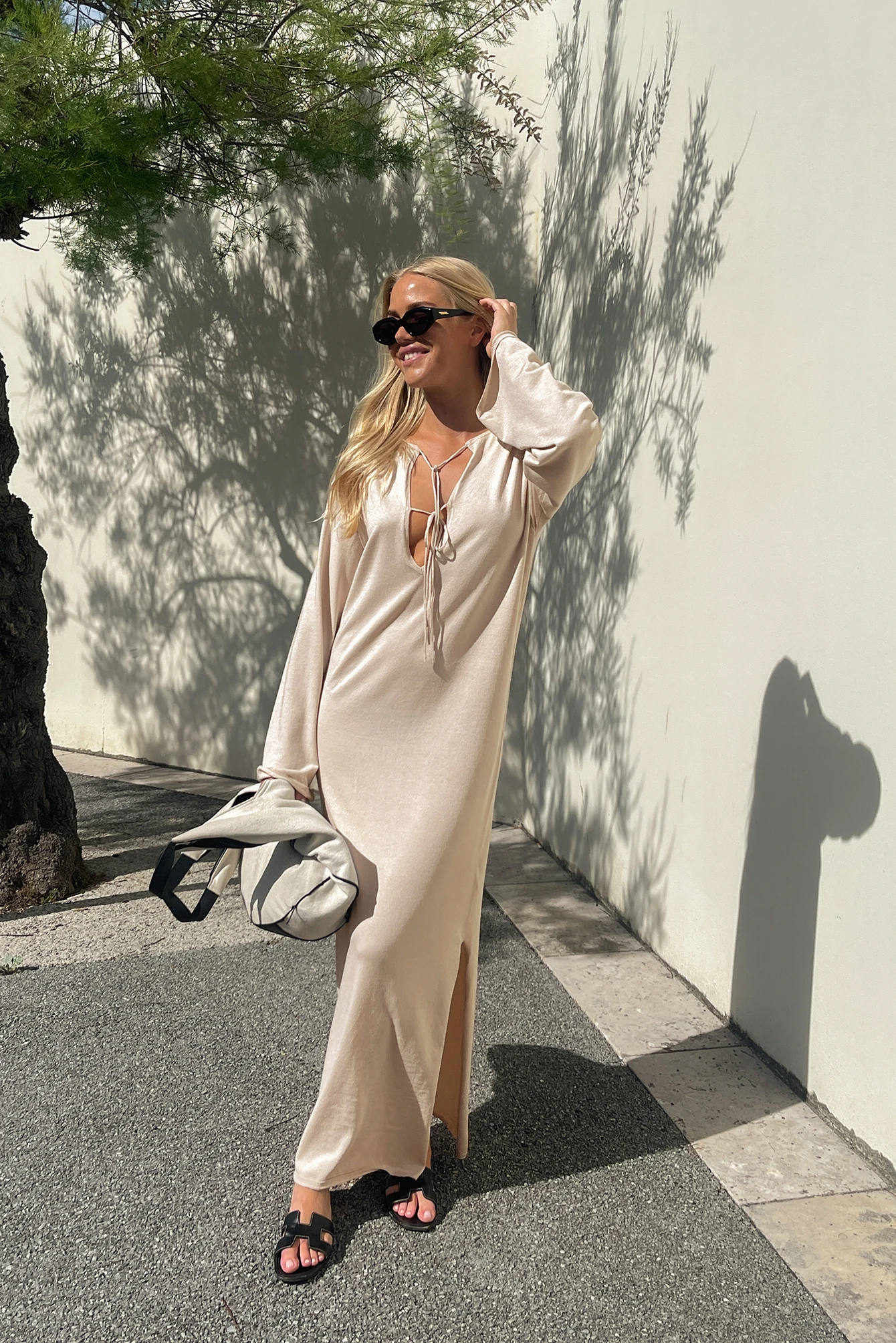 Cette robe longue a une coupe ample droite. Elle a des manches longues larges et un col en V profond avec détails auto-sérrés.