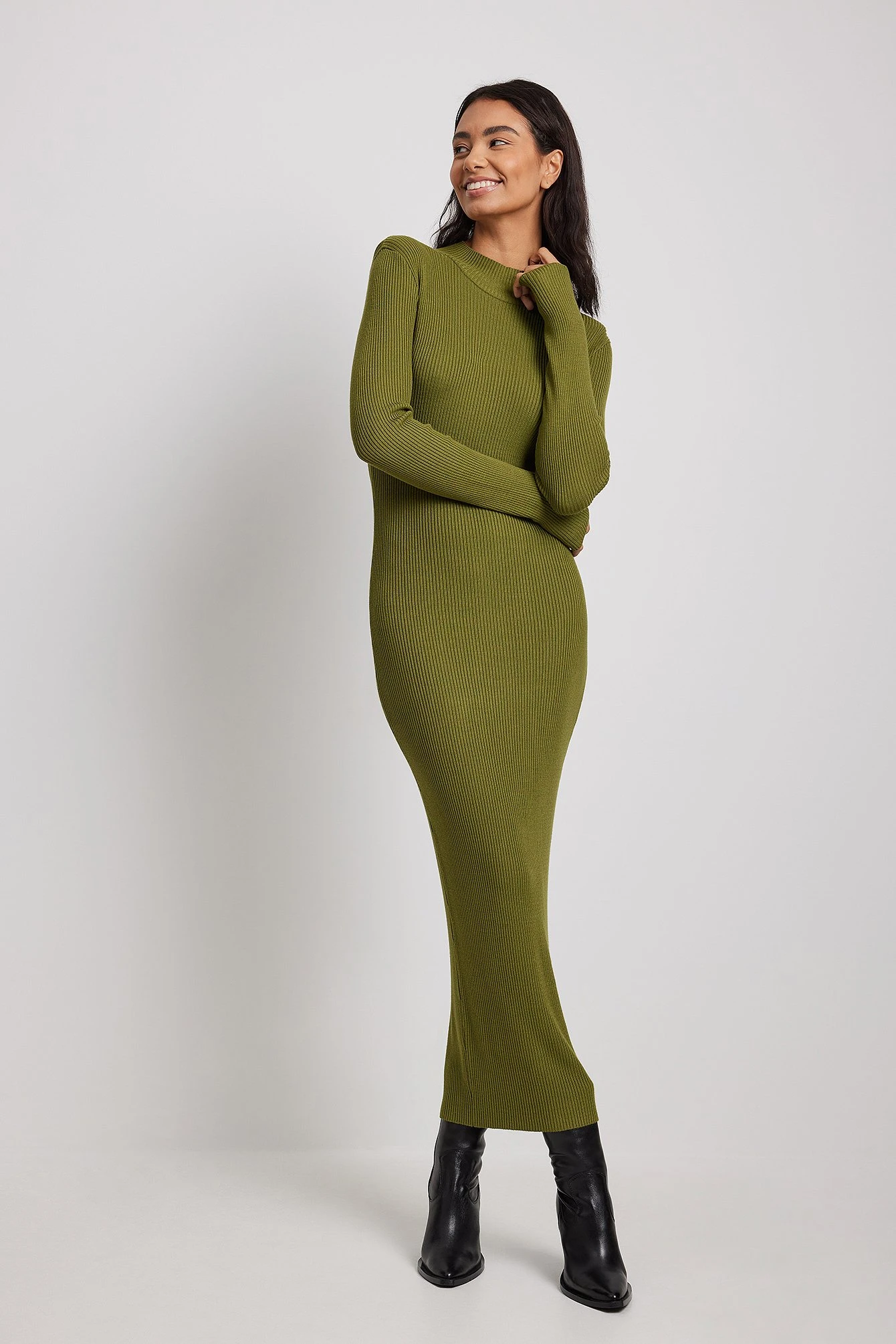 Cette robe longue a un col haut, des manches longues, un design tricoté et une coupe moulante.