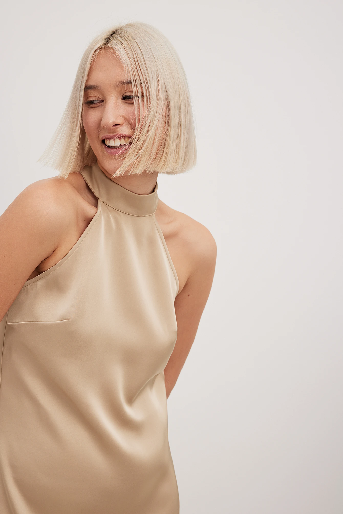 Cette robe longue a un toucher satin. Elle a une bretelle tour du cou haute avec braguette à boutons et une coupe fluide. Cette robe longue a une fente latérale.
