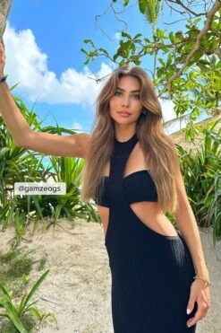 Cette robe longue est élastique et a une maille fine à nervures. Elle a un col haut avec bouton de fermeture à l’arrière de la nuque et un détail découpé.