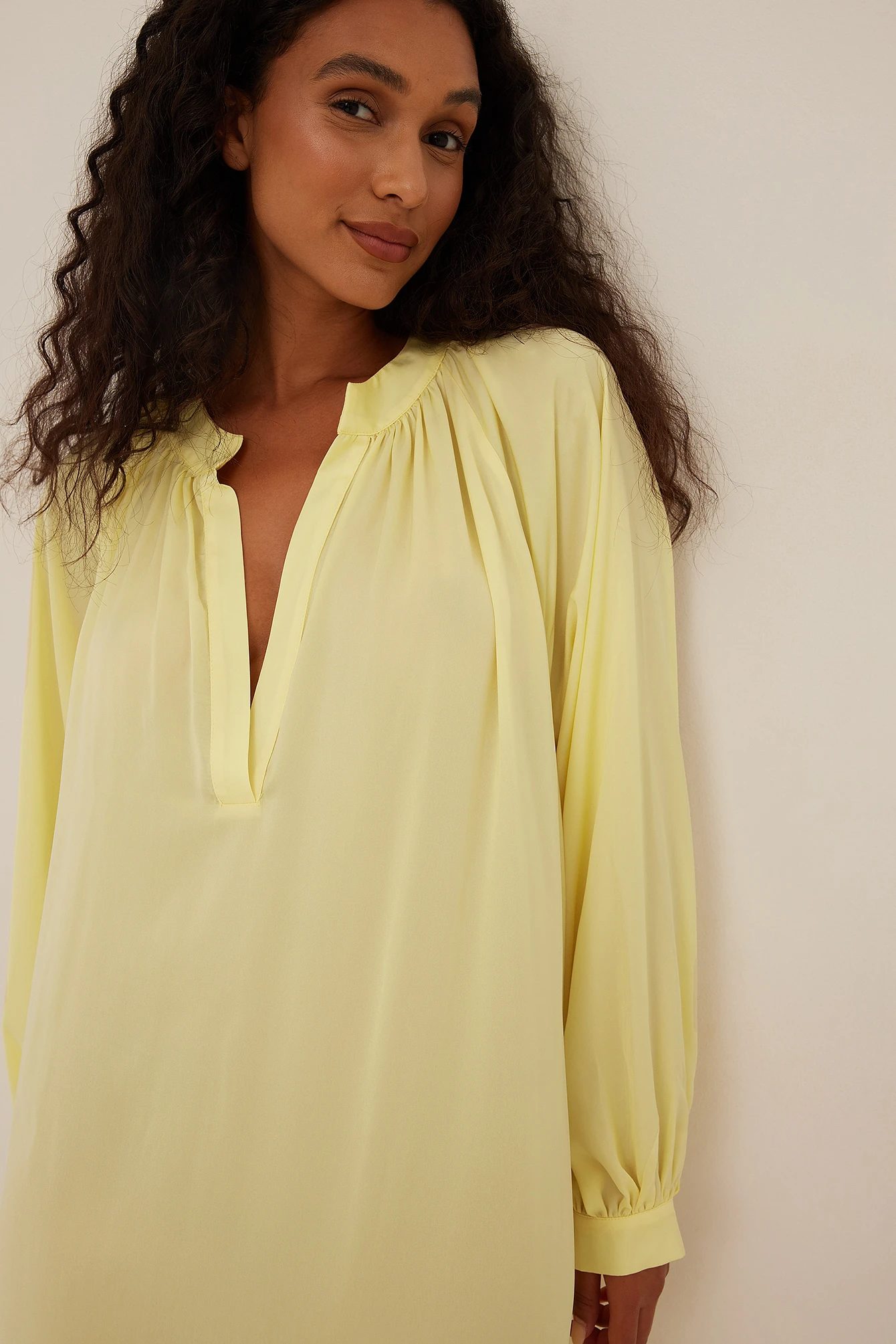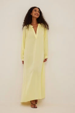 Cette robe longue a des manches longues avec boutons sur les manchettes, un col en V et une coupe fluide.