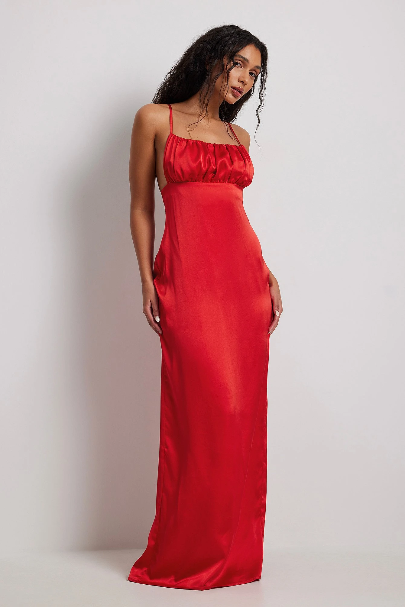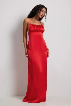 Cette robe longue est sans manches et faite en satin et a des bretelles réglables, un détail fendu arrière, un détail au niveau de la poitrine ruché et une fermeture éclair latérale.