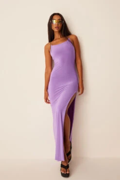 Cette robe longue a une coupe moulante, des bretelles avec modèle de chaîne, une fente latérale et une matière élastique en jersey.
