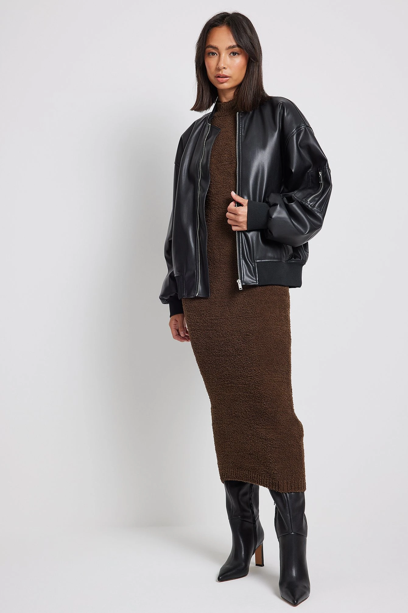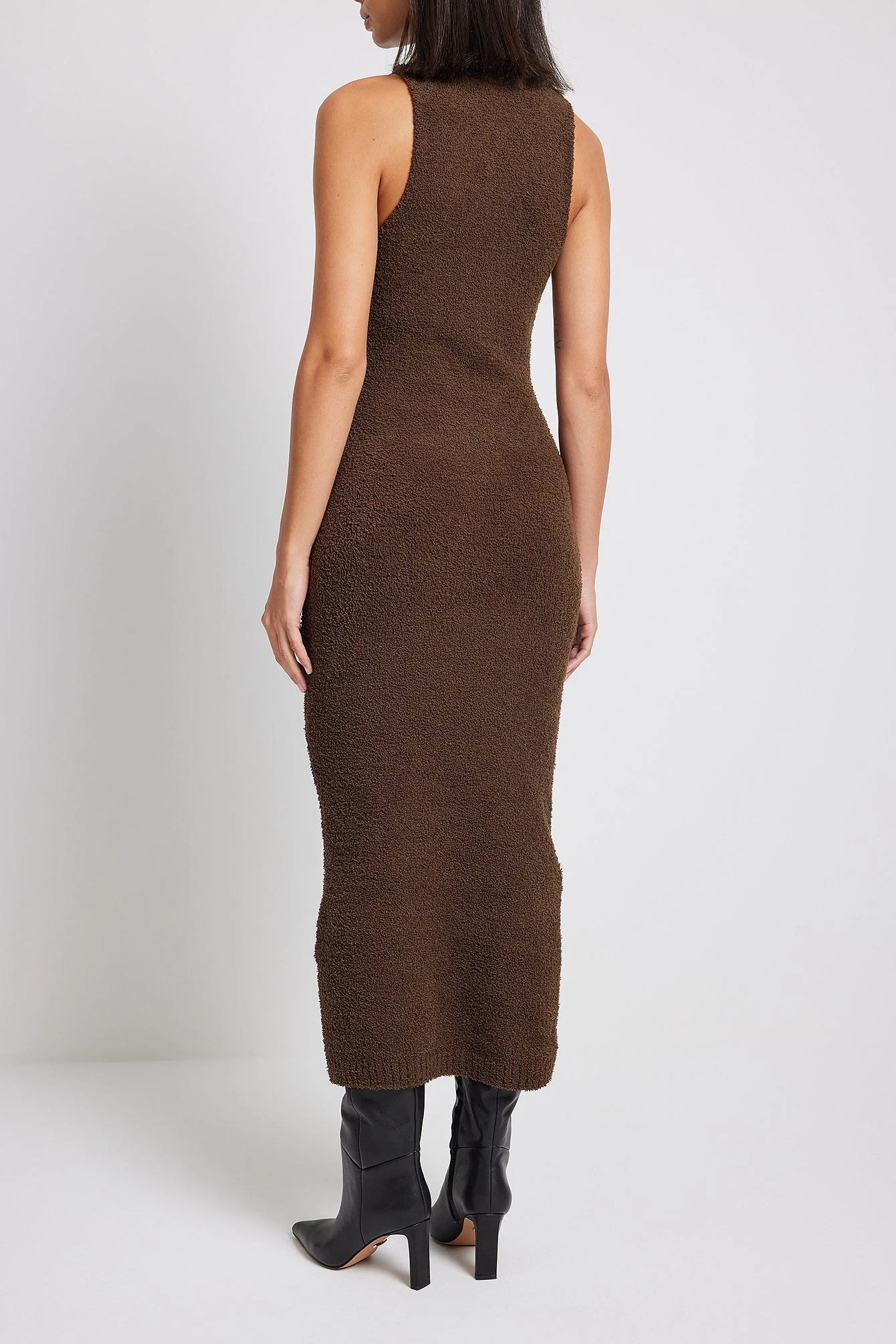 Cette robe longue a un col haut, un design sans manches et une matière douce et tricotée.