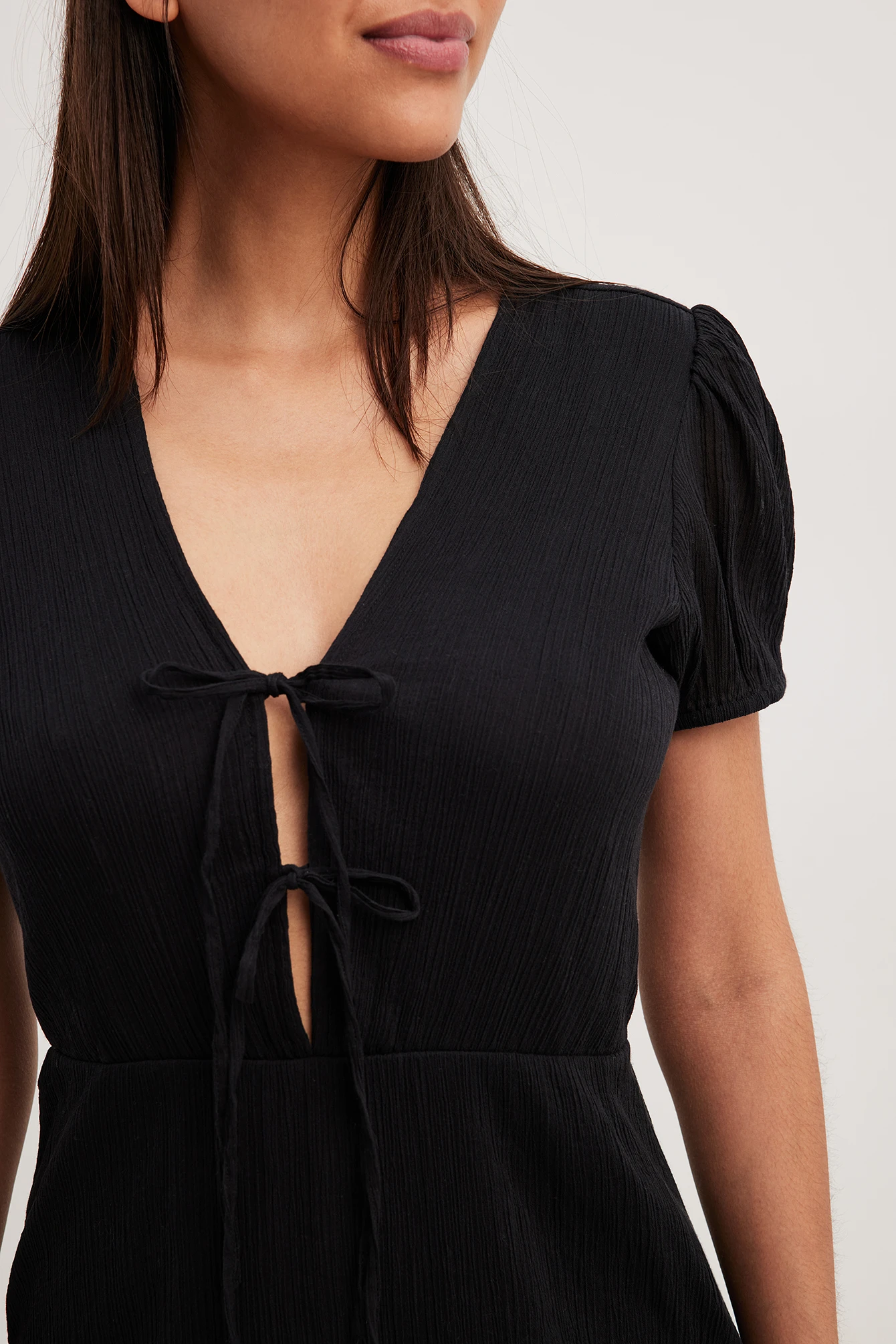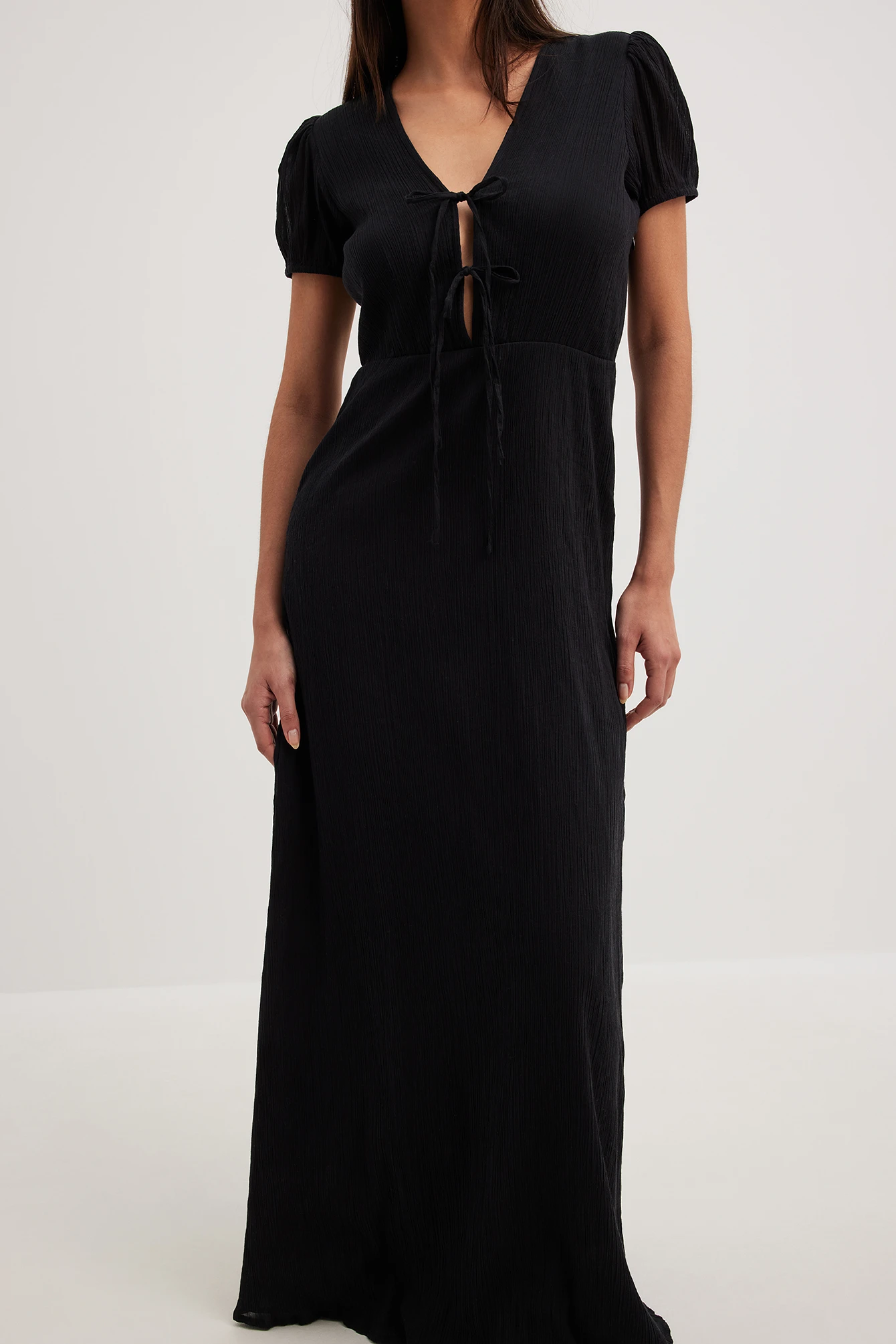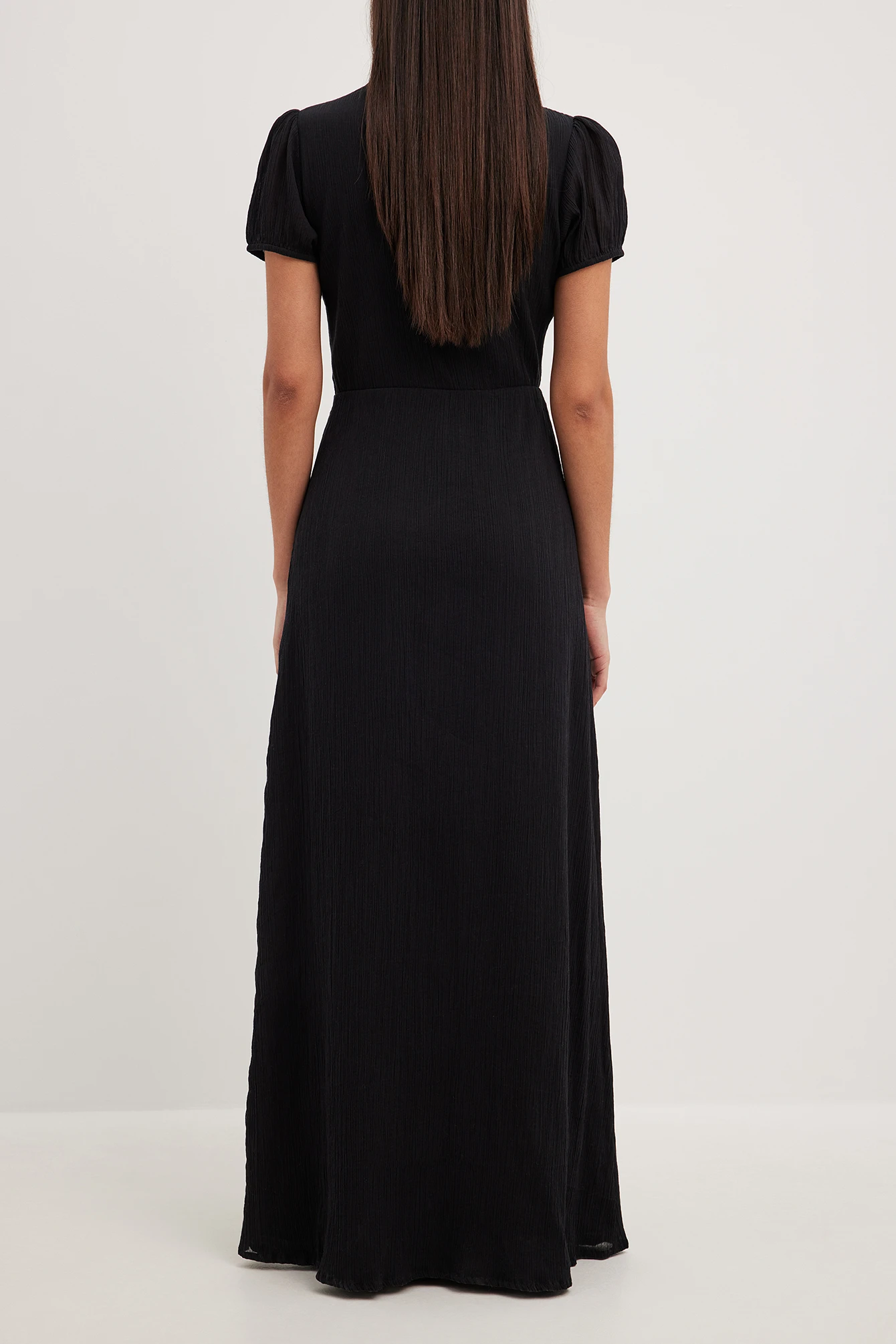 Cette robe longue a une matière structurée. Elle a des manches bouffantes avec coutures élastiques aux manchettes et des détails auto-sérrés sur la poitrine. Cette robe longue a une fermeture éclair cachée sur le côté et une doublure.