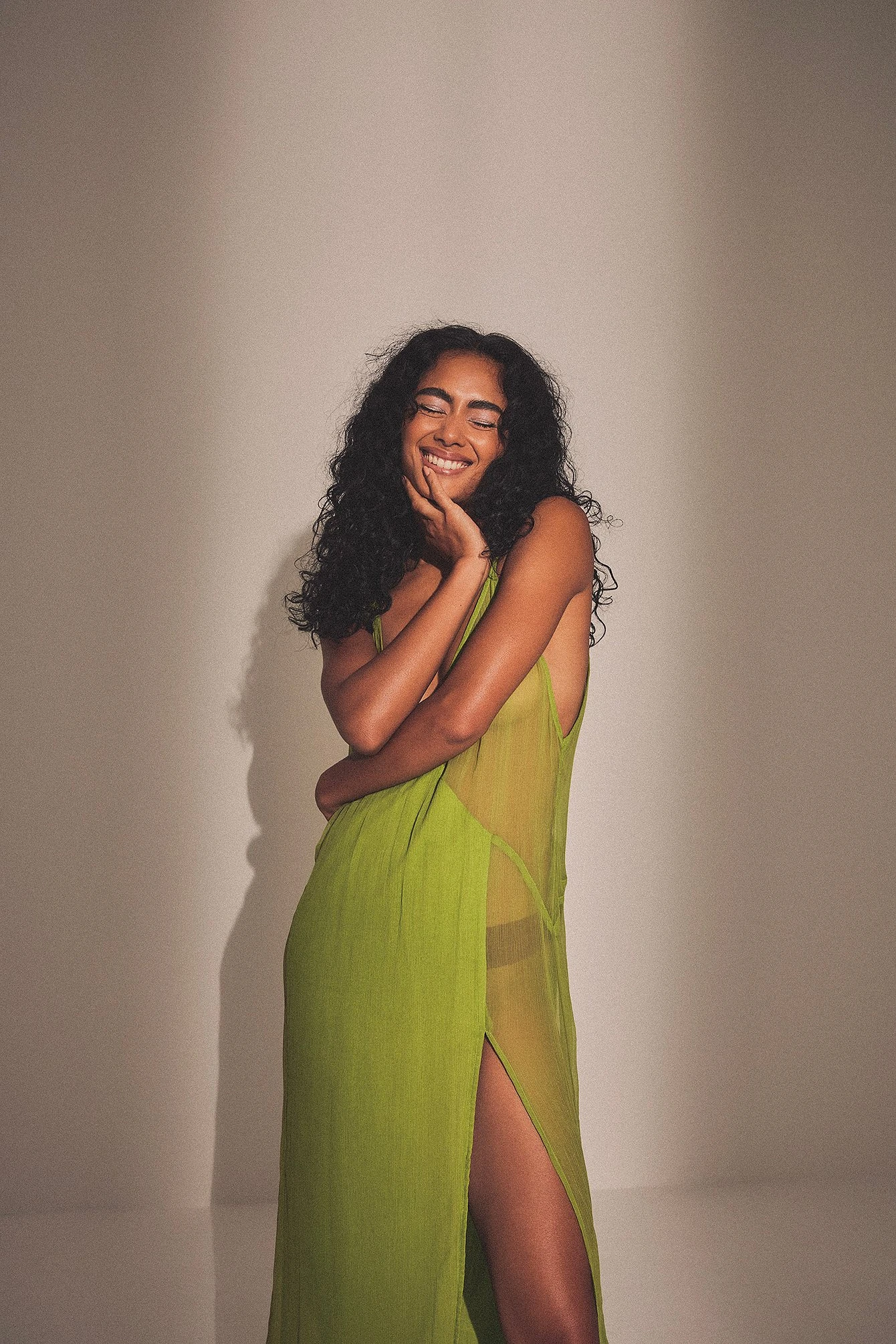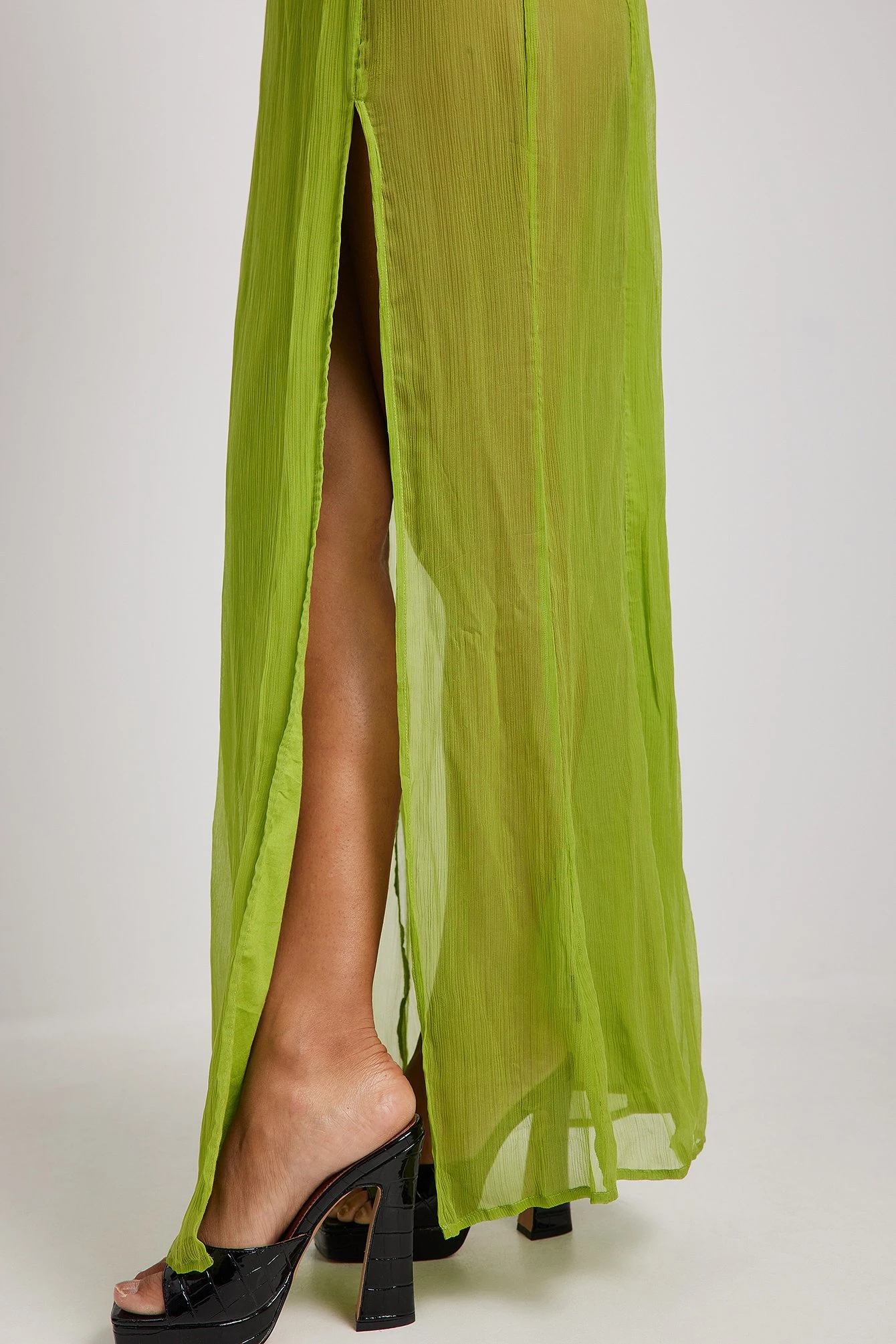 Cette robe longue est transparente et partiellement doublée et a des bretelles fines et non ajustables. Elle a un col en V et une fente latérale haute. Cette robe longue a un soutien-gorge non rembourré et amovible avec bretelles réglables.