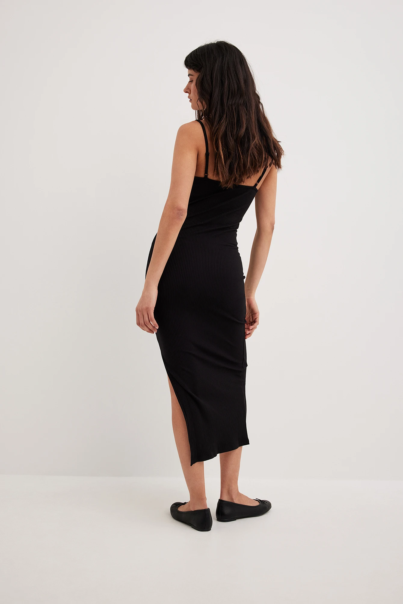 Cette robe a une taille midi. Elle a une coupe moulante et une matière élastique à nervures. Cette robe a une bretelle fine réglable, un décolleté en coeur, un détail ruché sur la poitrine et une fente latérale.