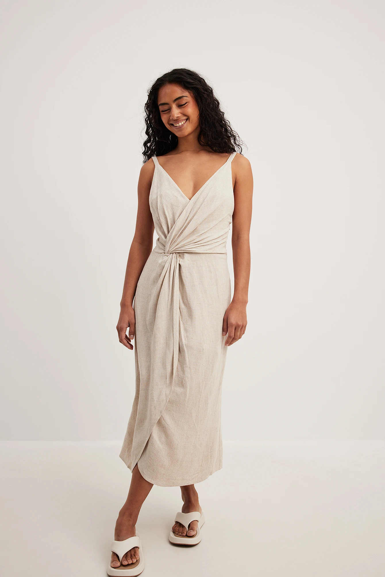 Cette robe midi a un design à dos ouvert avec noeud à nouer. Elle a un col en V avec crochet et oeillet de fermeture et un détail de torsion à la taille. Cette robe midi a une fermeture éclair cachée sur le côté et une doublure sur la moitié haute.