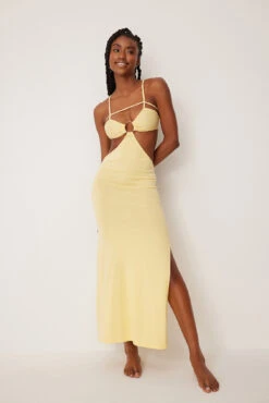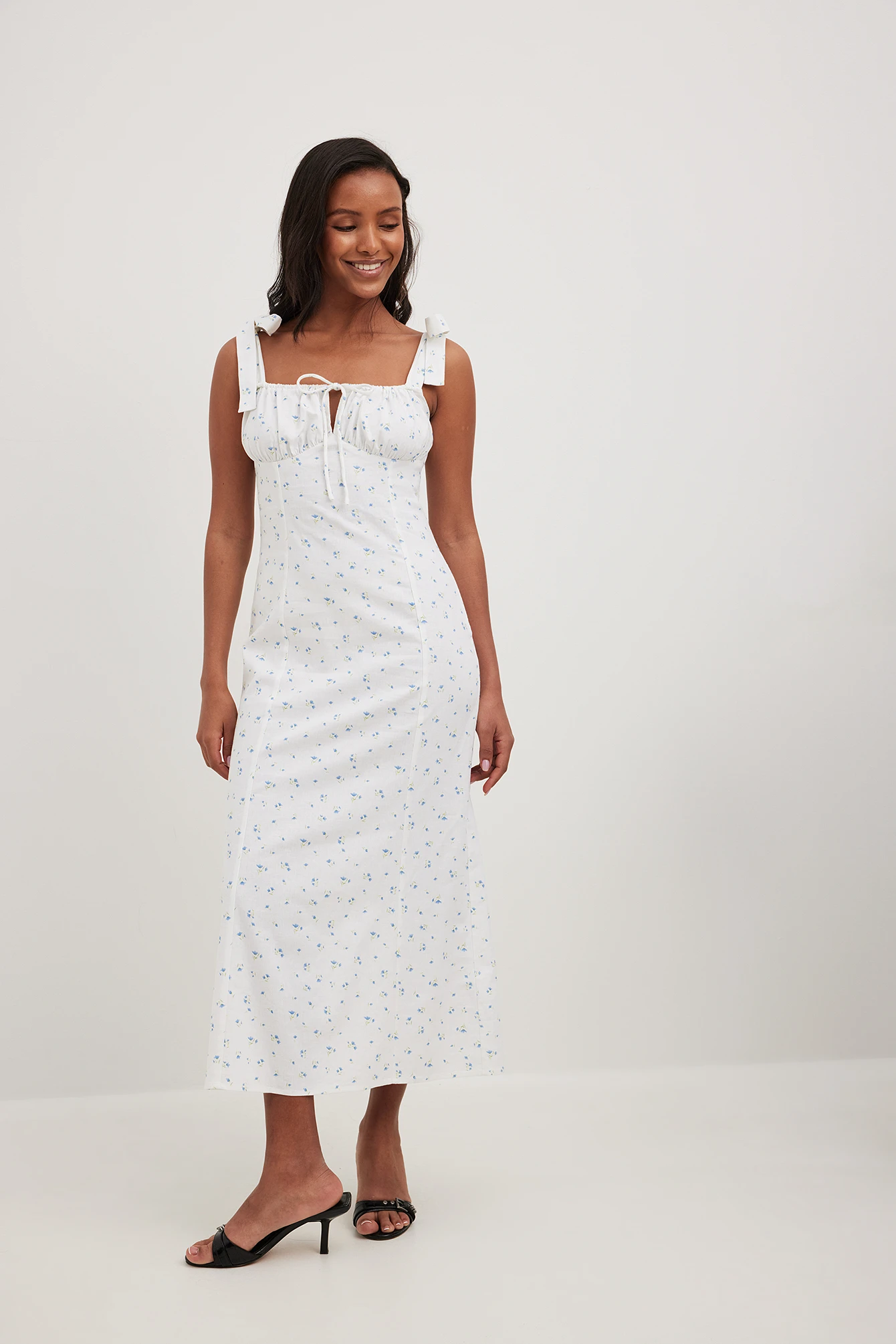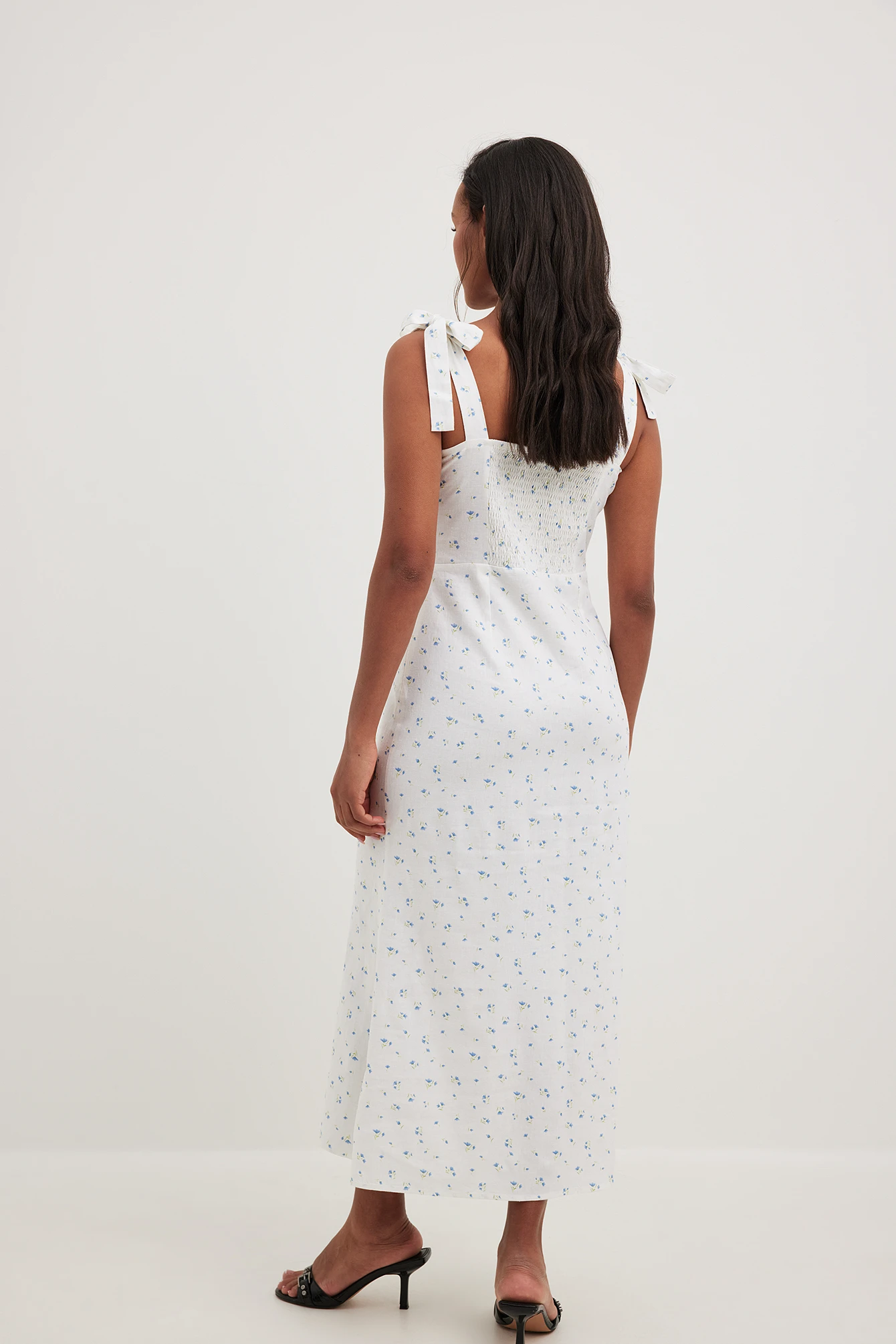 Cette robe midi a une matière en lin mélangé. Elle a des bonnets froncés avec cordon ajustable et des bretelles avec ajustables. Cette robe midi a un dos froncé et une fermeture éclair latérale cachée.