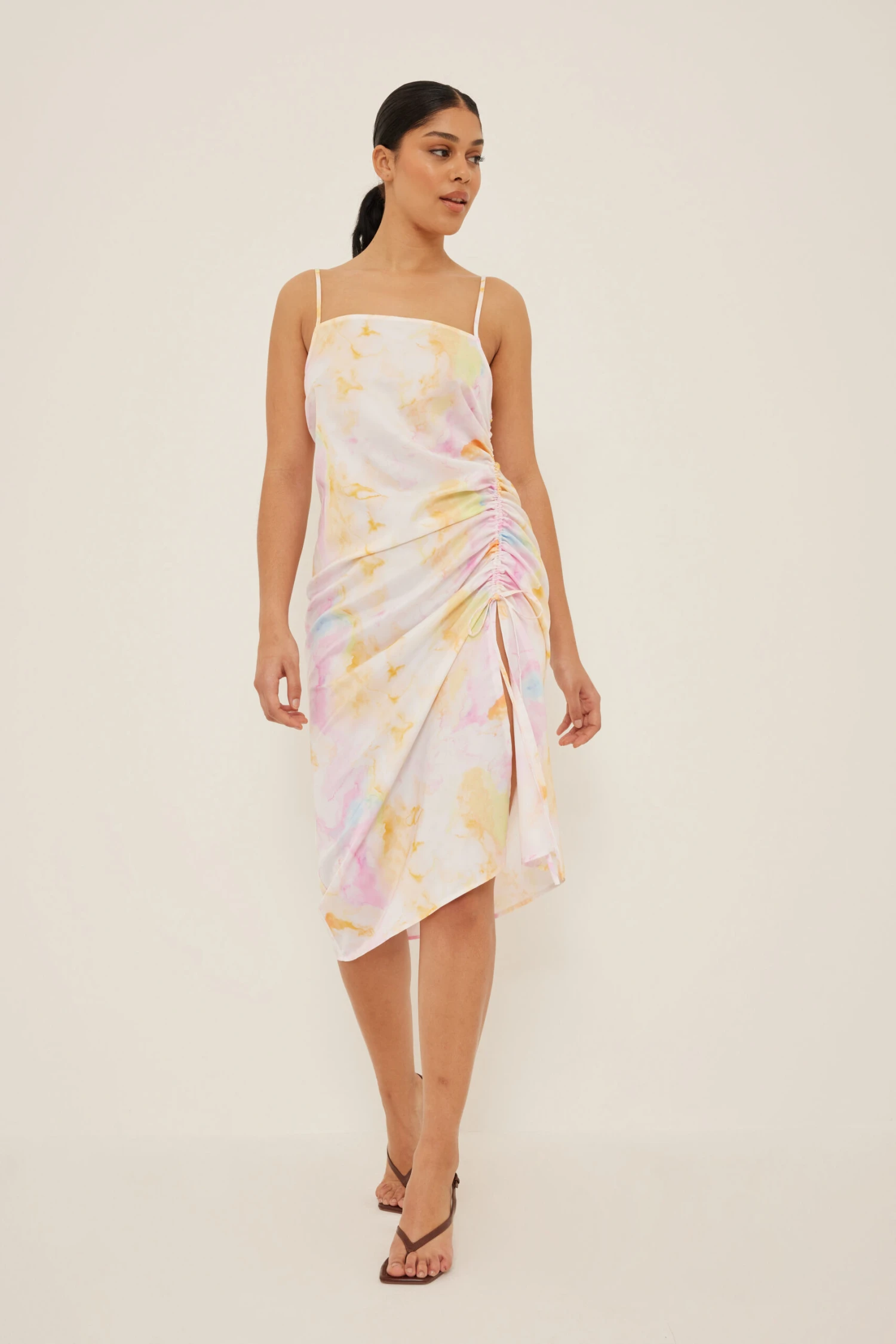 Cette robe a un col carré, des bretelles fines réglables, un détail à cordon coulissant réglable sur le côté, une fente latérale et une matière semblable à la soie.