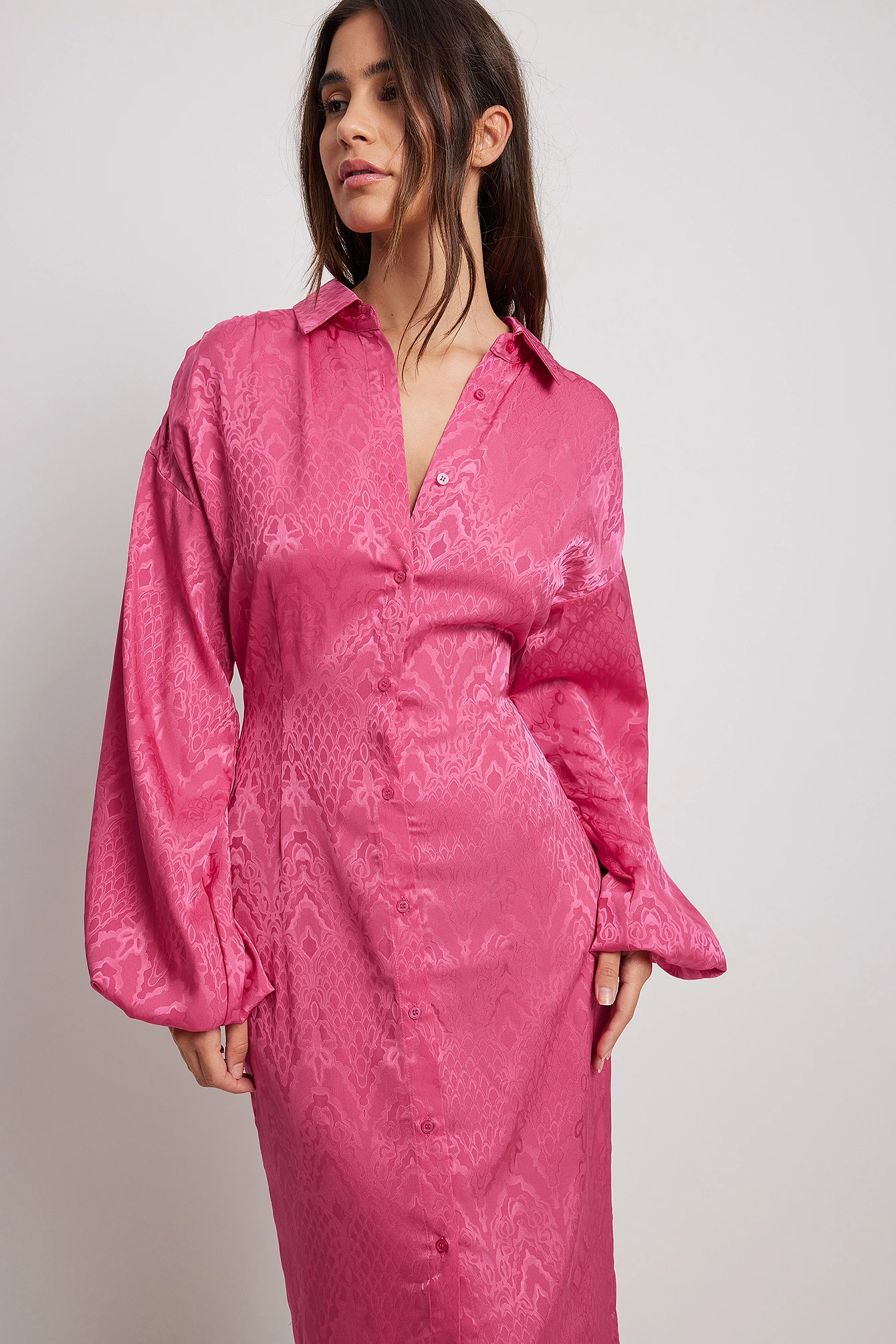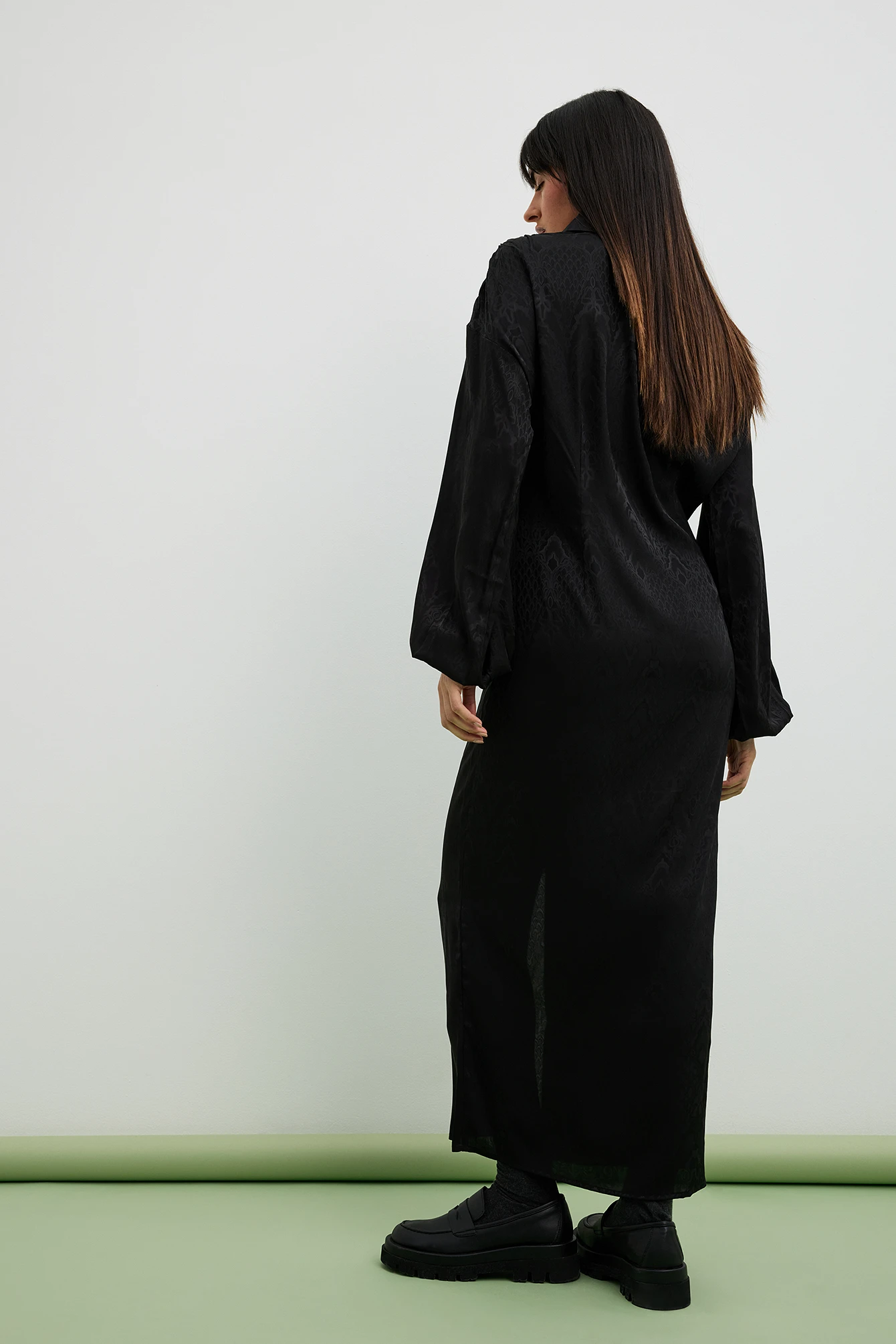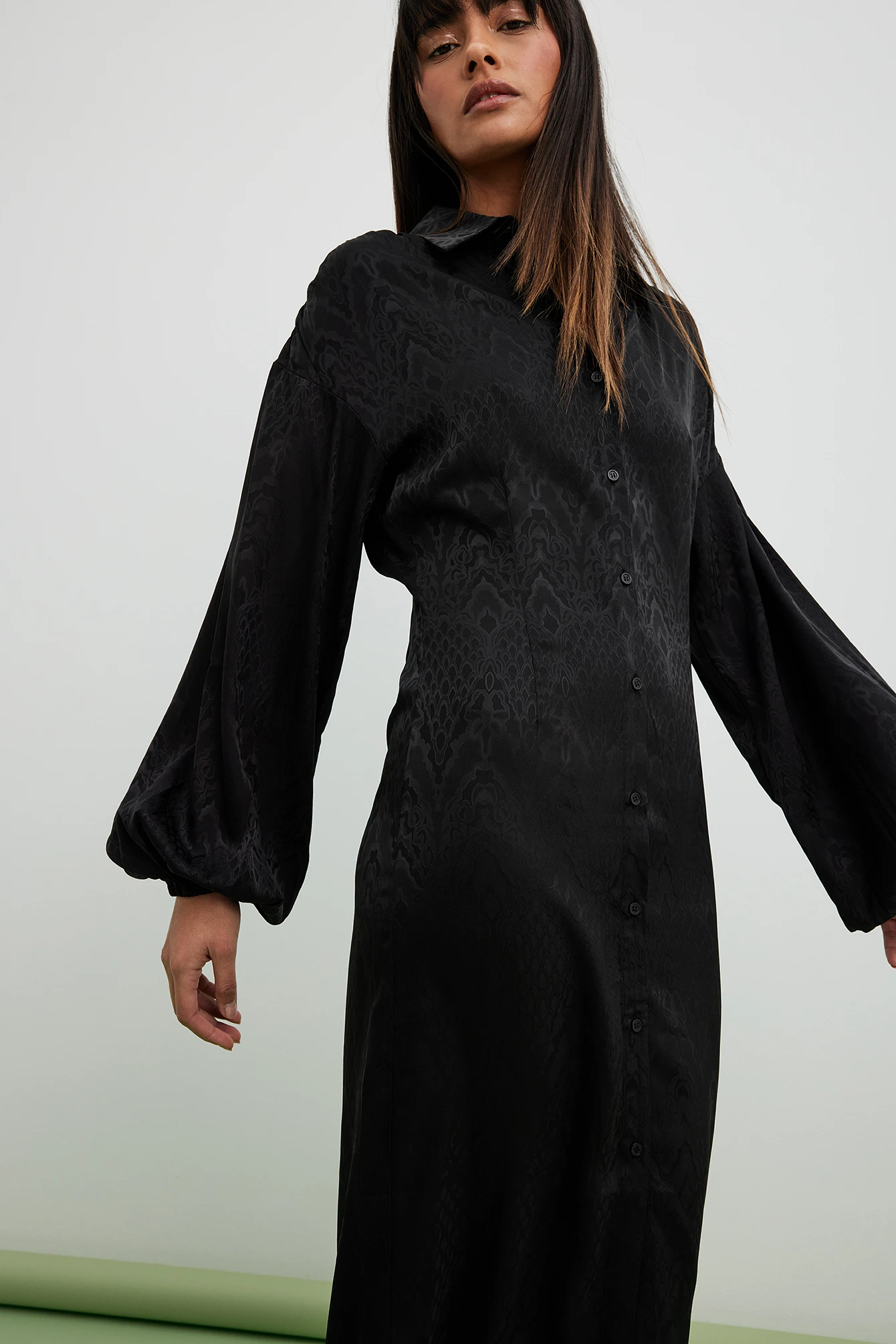 Cette robe midi est jacquard et a une col de chemise. Elle a une manche longue bouffante avec manchettes élastiques et un bouton de fermeture.