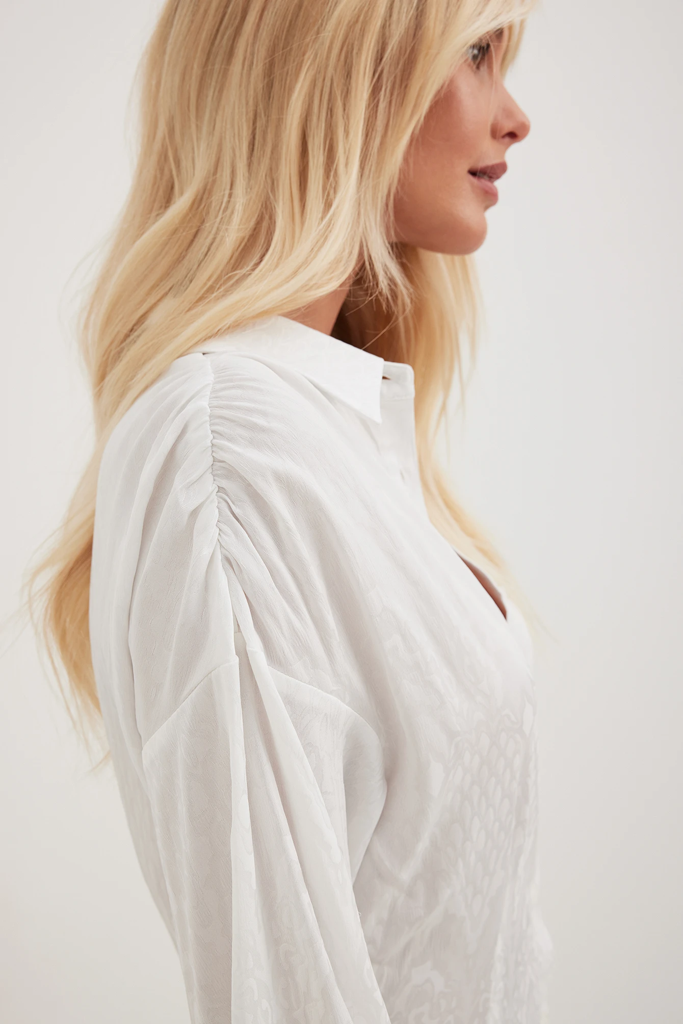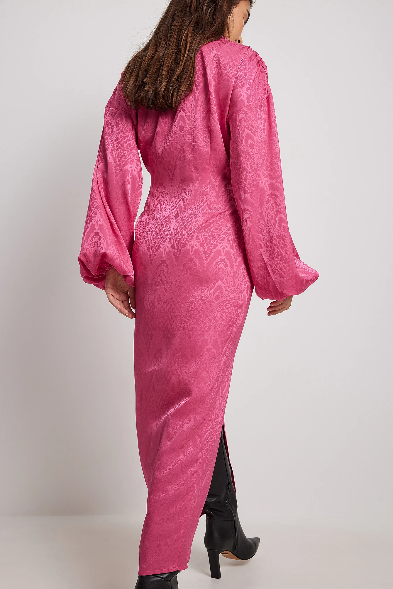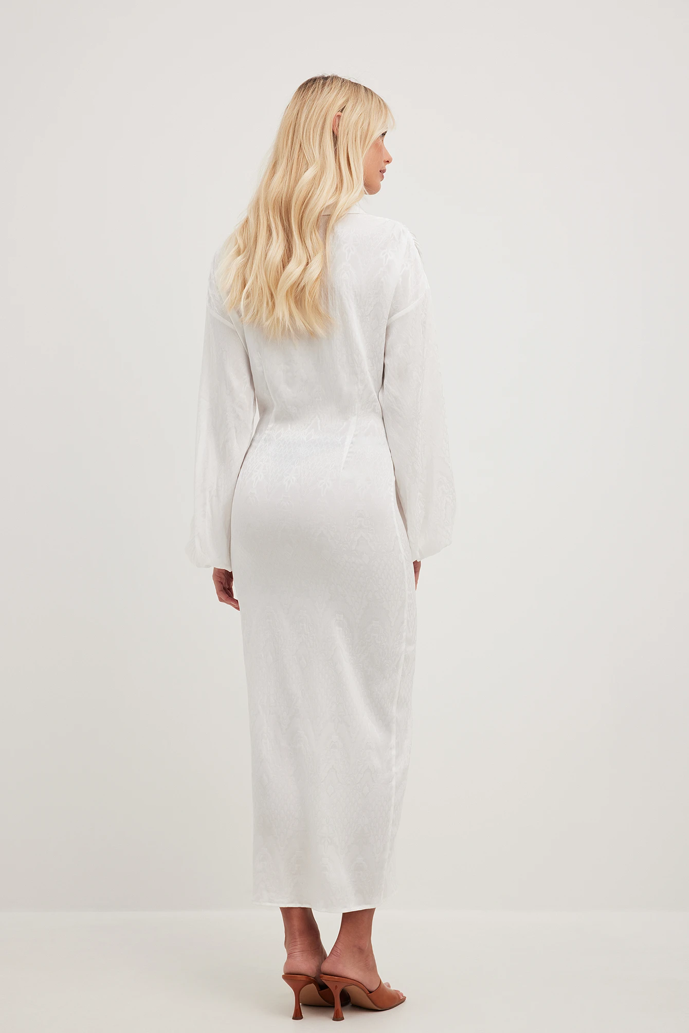 Cette robe midi est jacquard et a une col de chemise. Elle a une manche longue bouffante avec manchettes élastiques et un bouton de fermeture.