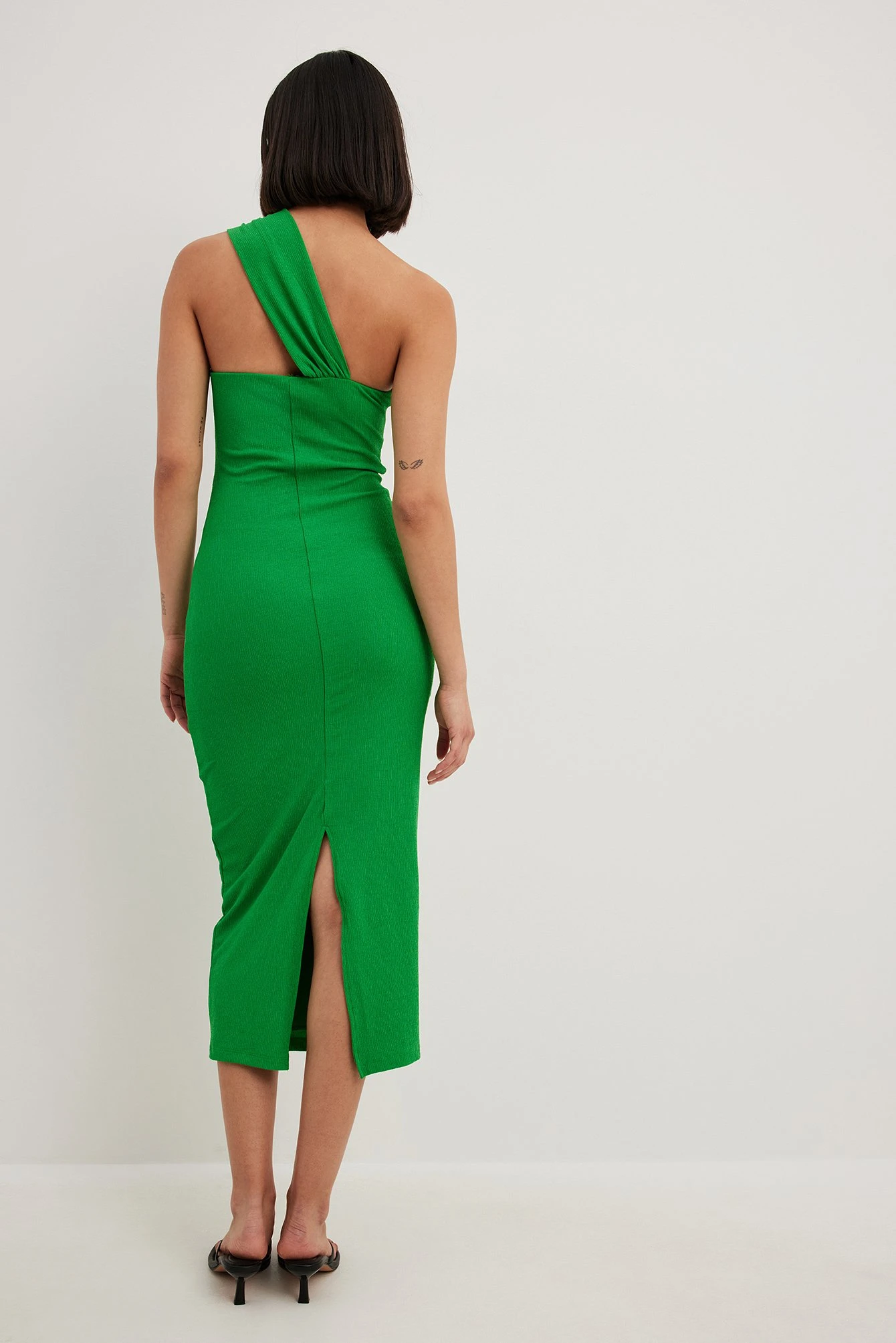 Cette robe midi a un toucher texturé. Elle a une coupe moulante et un design à bandeau. Cette robe midi a un style à une épaule avec détail drapé sur la poitrine et un détail fendu arrière.