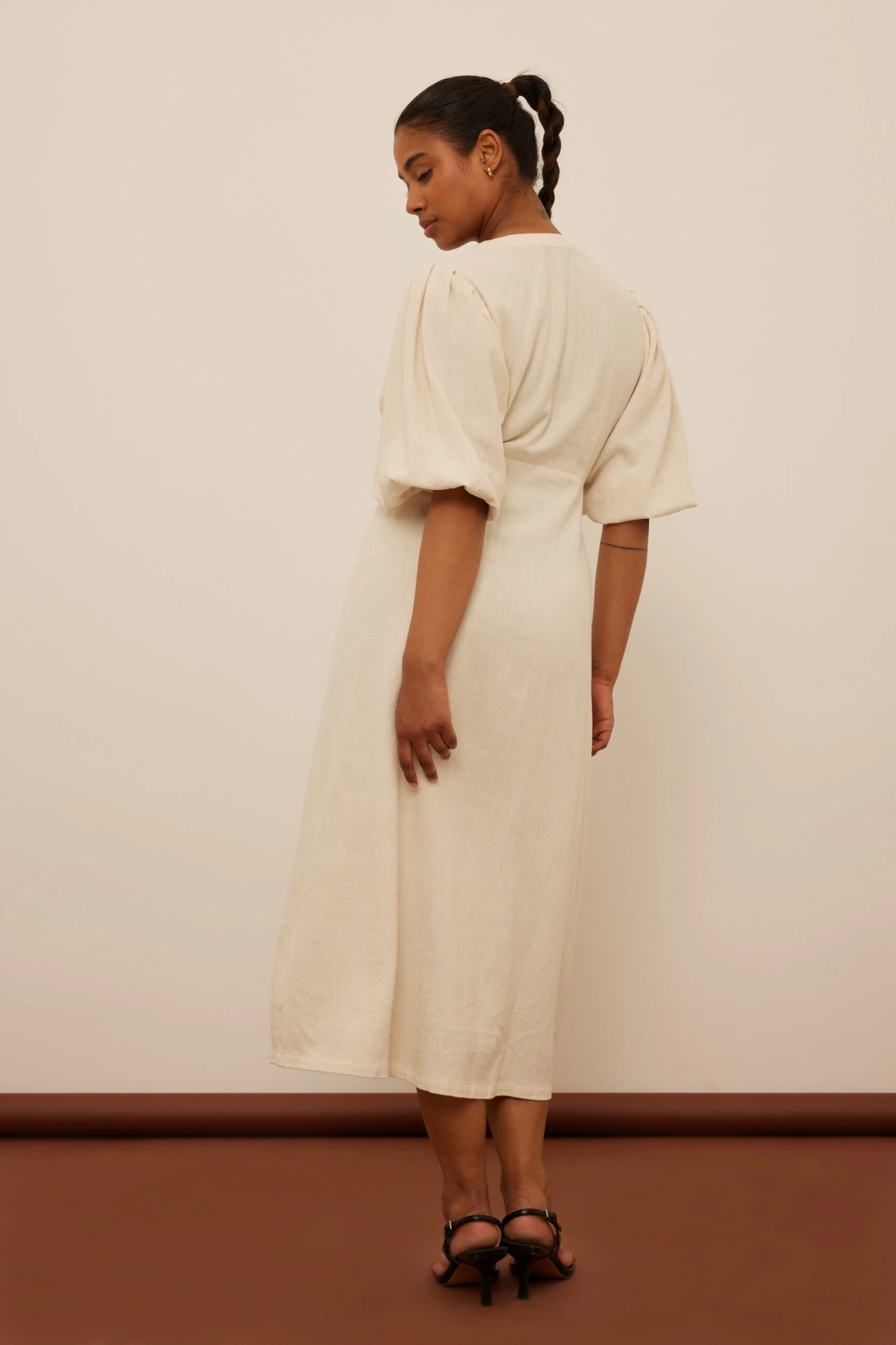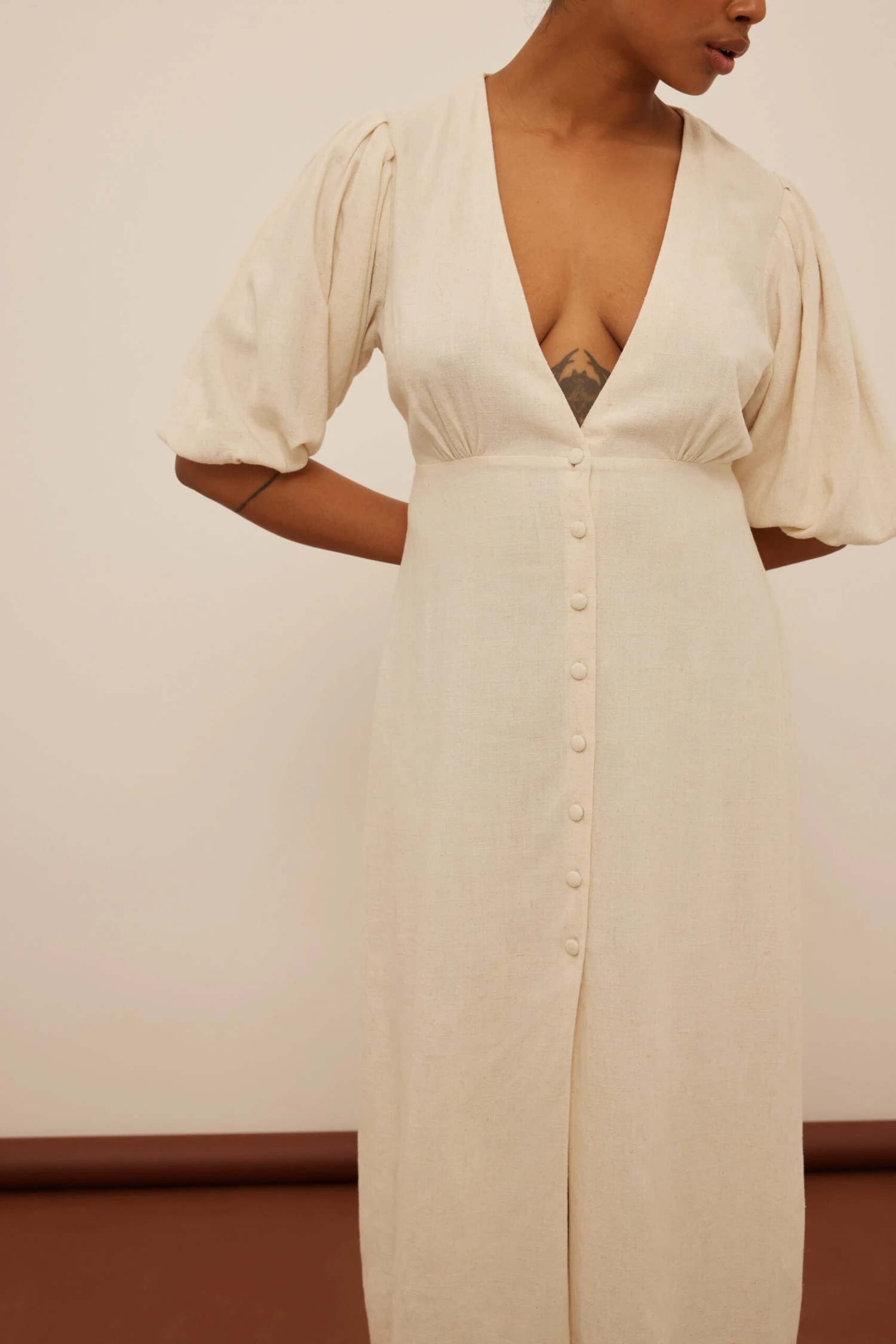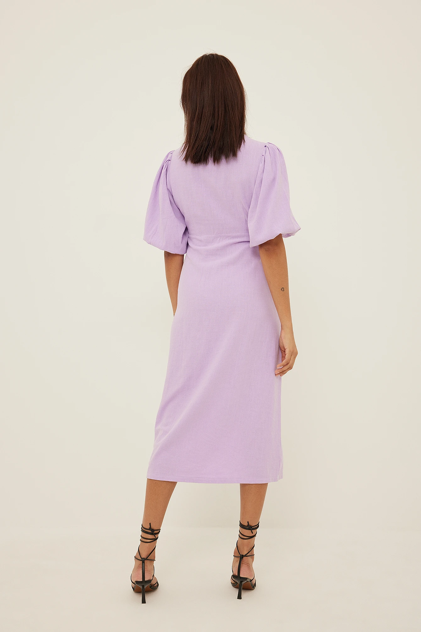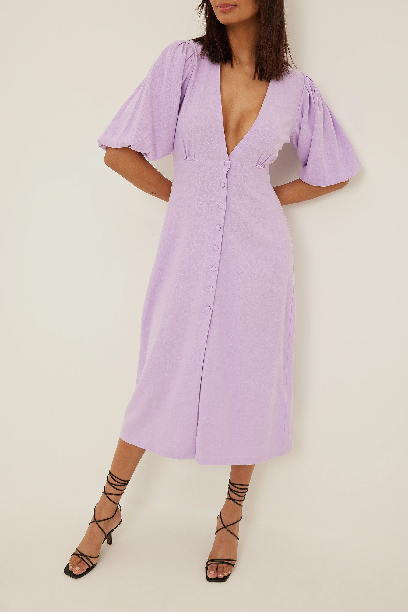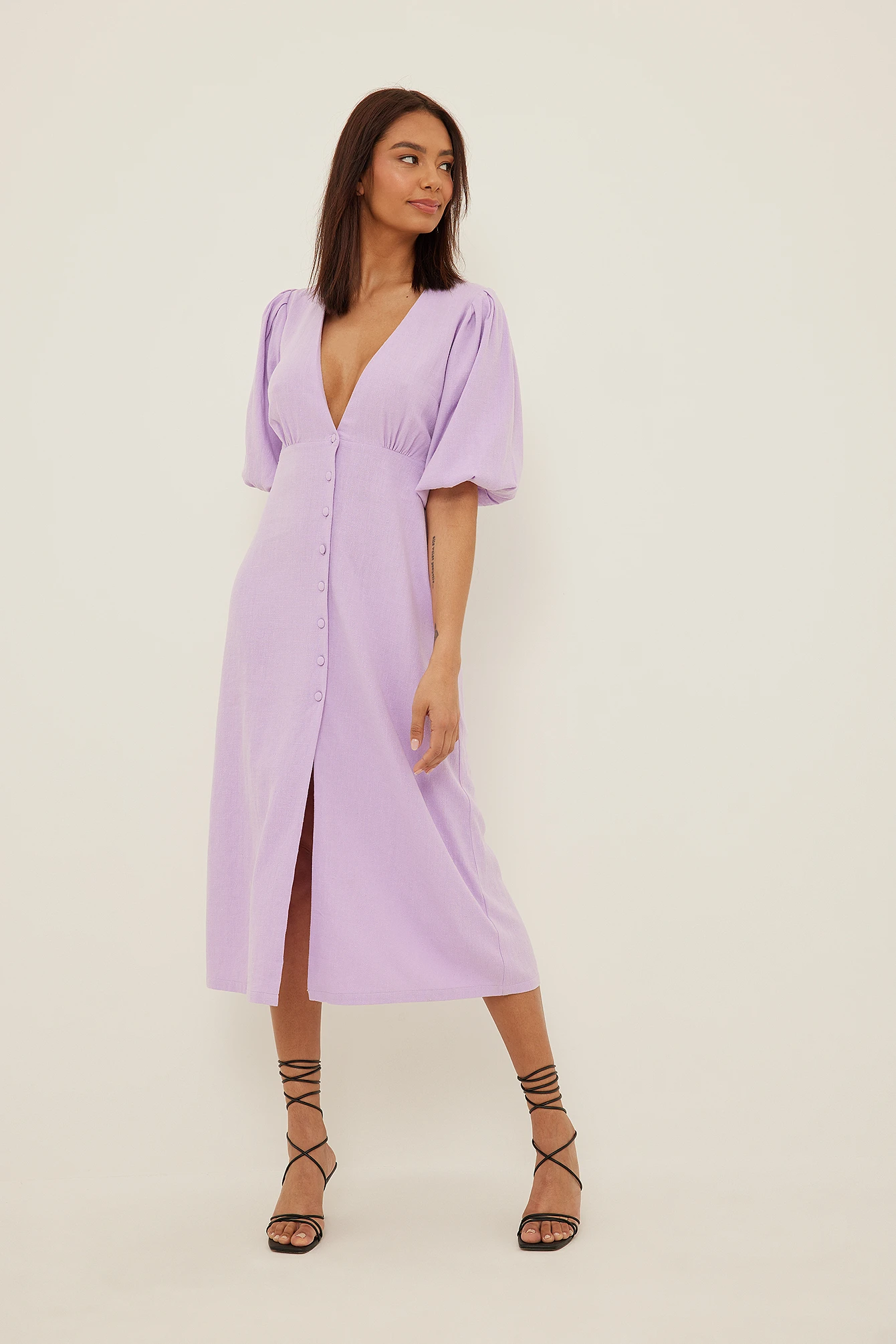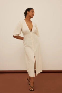 Cette robe a un col en V, des manches trois quarts avec manchettes serrées, un bouton de fermeture à l’avant, une taille midi, une coupe fluide et une matière en lin léger.