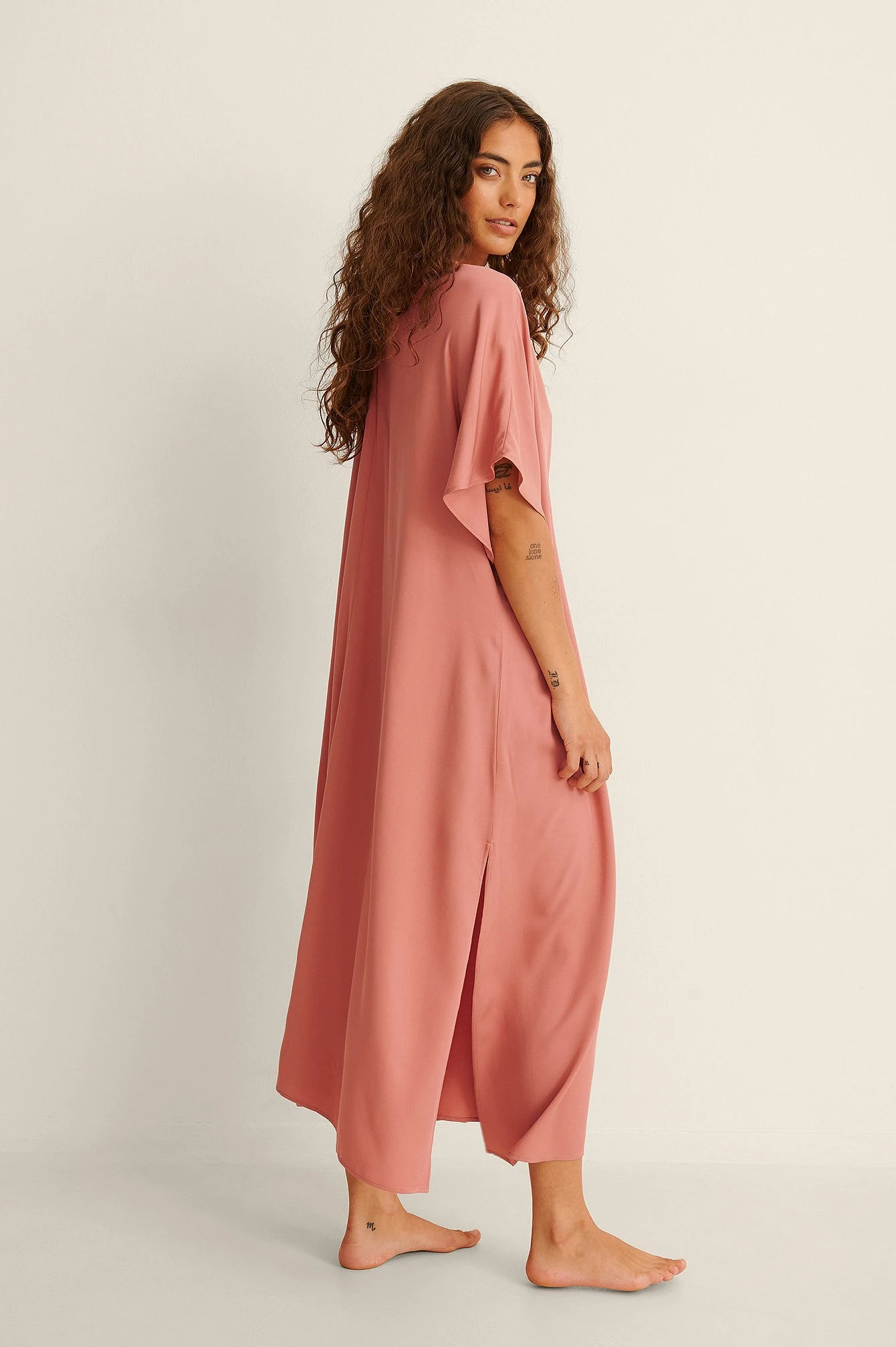 Cette robe a un col en V, une coupe arrière en V, des manches courtes larges, une fente de chaque côté, une coupe fluide et une taille midi.